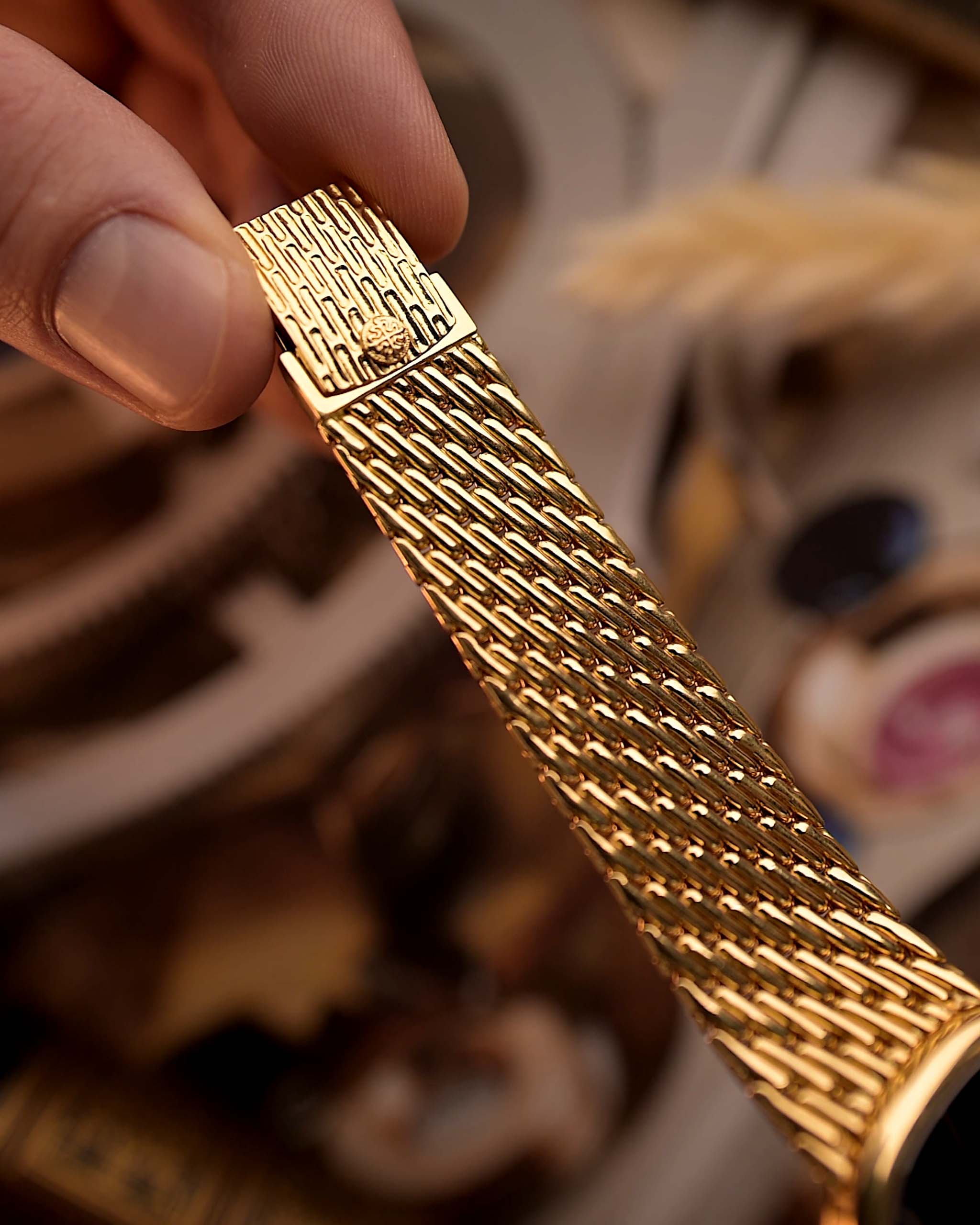 يوفر السوار المدمج المصنوع من الذهب الأصفر عيار 18 قيراطًا والمنحوت بشكل لا تشوبه شائبة ليتناسب مع انحناءات العلبة راحة وتماسكًا لا مثيل لهما. ساعة مناسبة بنفس القدر لعشاء ربطة العنق السوداء ولحظات التعبير الهادئ عن الذات.