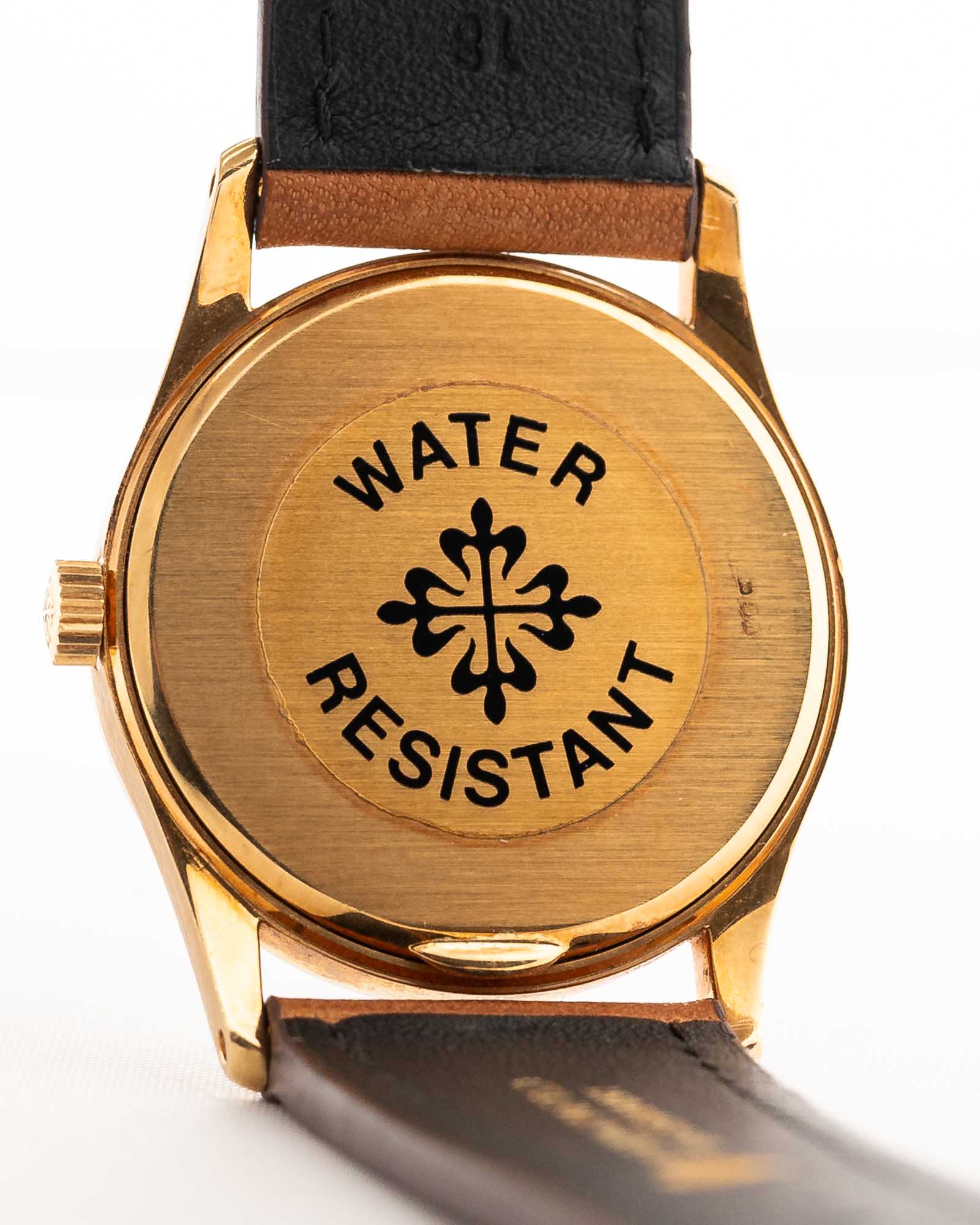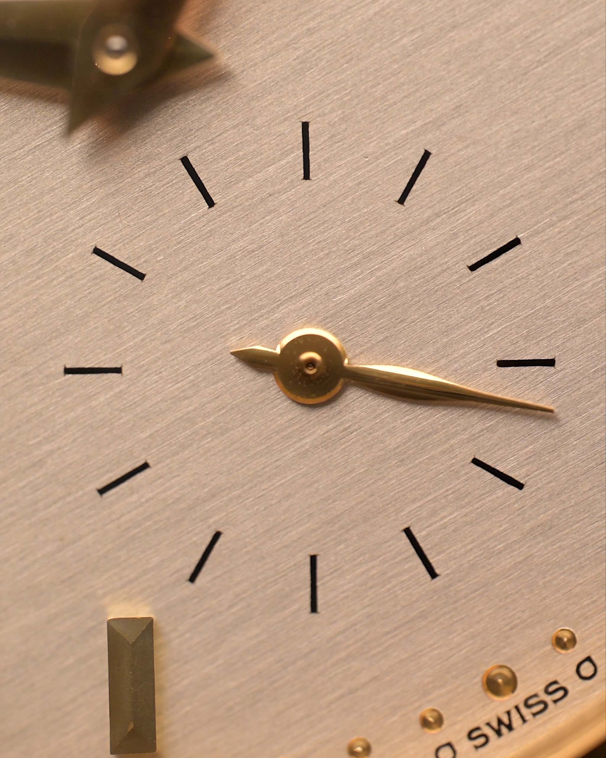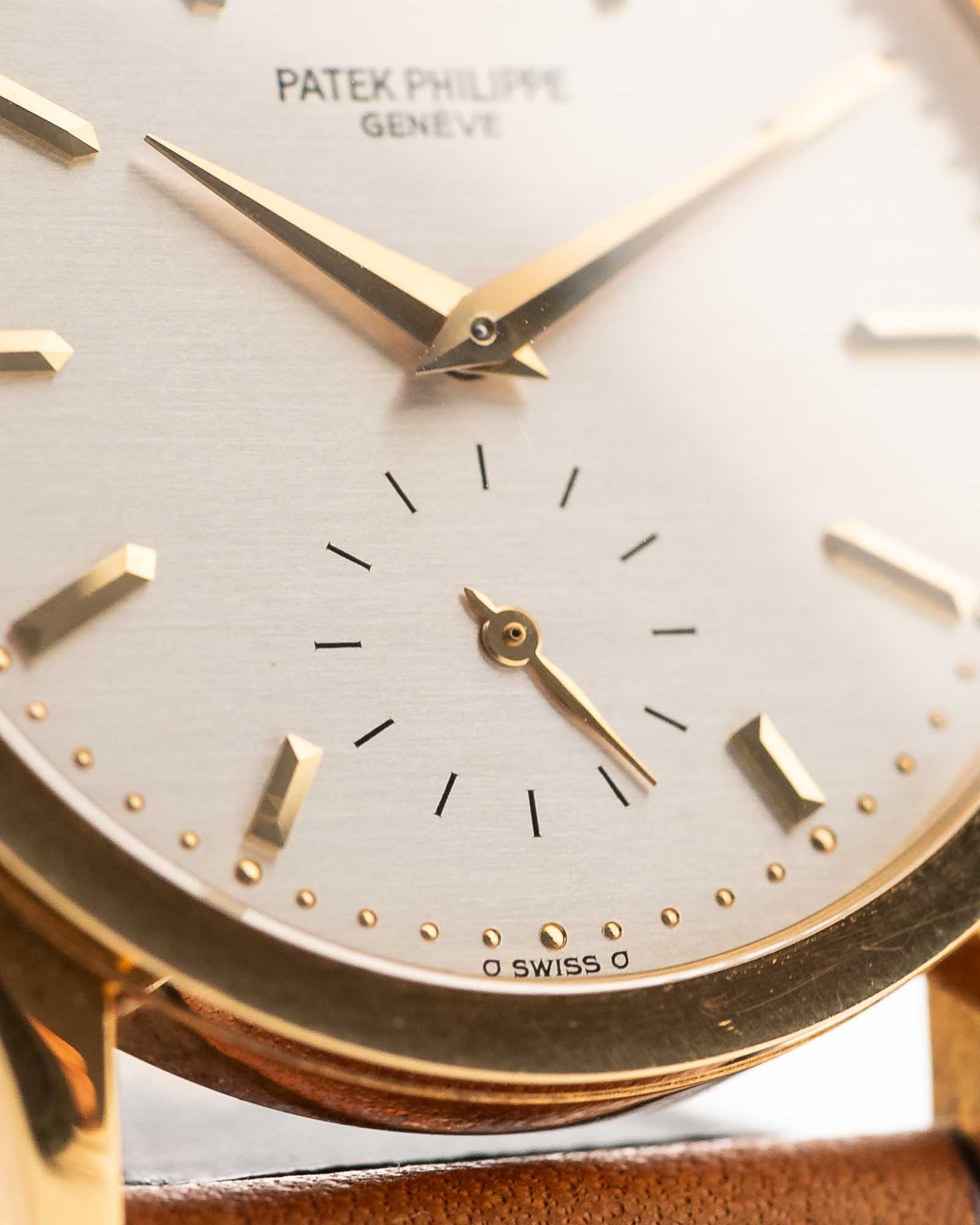 الميناء الفضي سيغما أصلي ولم يمسه أحد، ويتميز بطباعة واضحة وتناسق مثالي — وهو مثال رائع على ضبط النفس. تعمل الساعة بواسطة حركة Patek Philippe Cal. 215 الأسطورية، وهي حركة يدوية التعبئة تشتهر بموثوقيتها ودقتها وتشطيبها التقليدي.