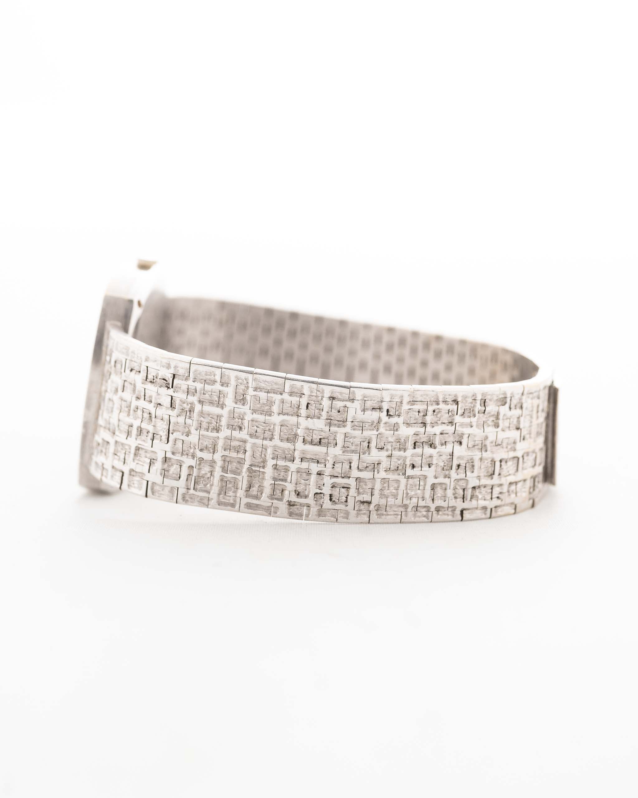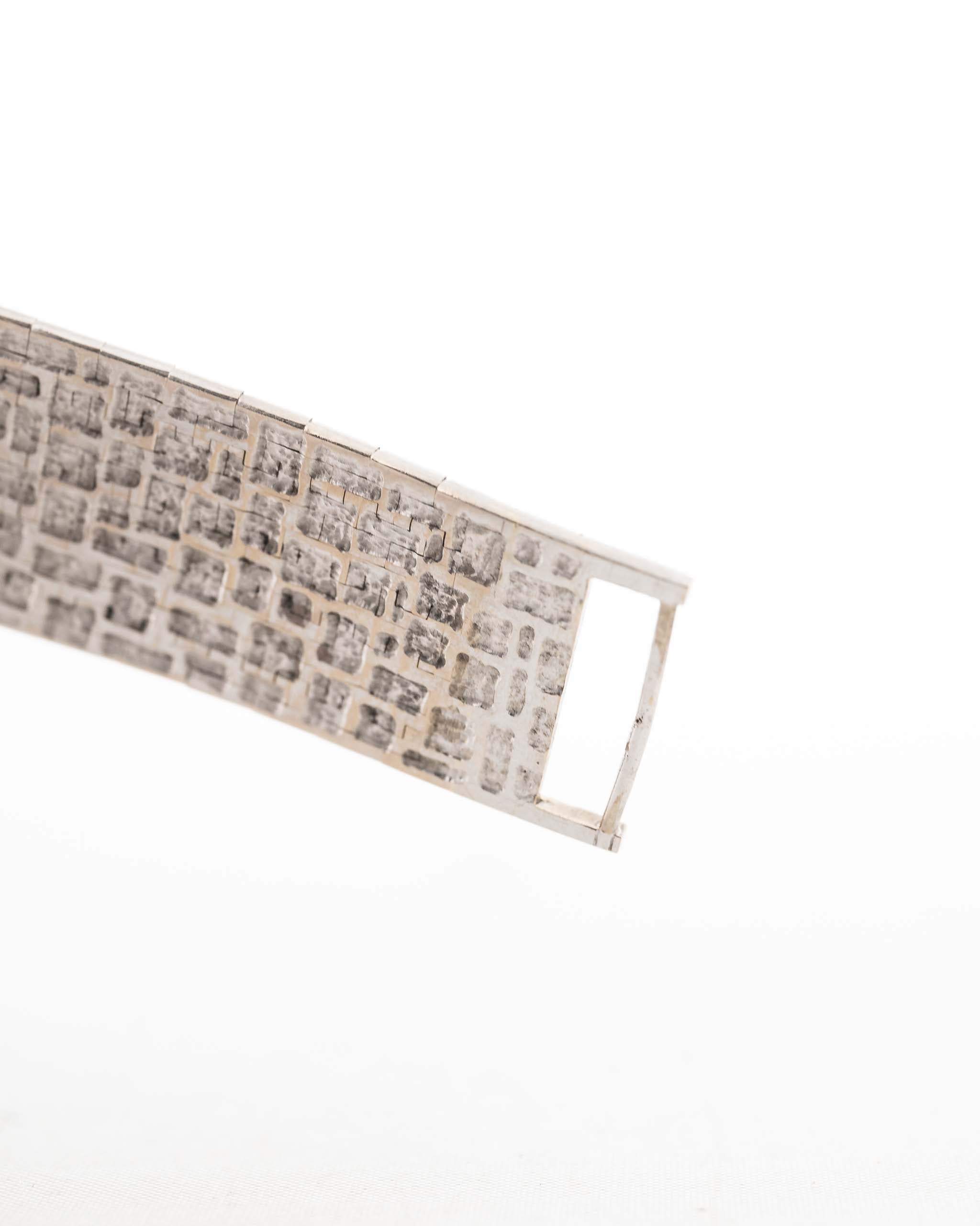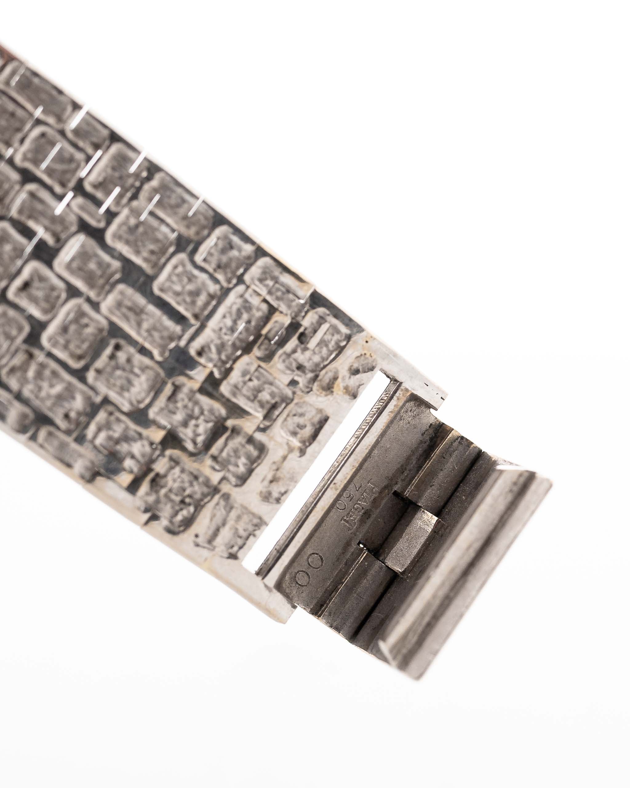 ويُكمِل السوار المدمج المصنوع من الذهب الأبيض عيار 18 قيراطًا التصميم المنحوت الذي يمنح ساعة بياجيه العتيقة هذه القوة والرشاقة.