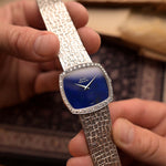 ساعة بياجيه تي في 12735 من بياجيه تي في 12735 عتيقة من اللازورد الماسي من السبعينيات على معصم. مقاس 32 مم من الذهب الأبيض عيار 18 قيراطاً مع عيار أوتوماتيكي. 12P1 وميناء لازورد لازولي وإطار من الألماس وسوار مدمج من الذهب الأبيض عيار 18 قيراطاً.