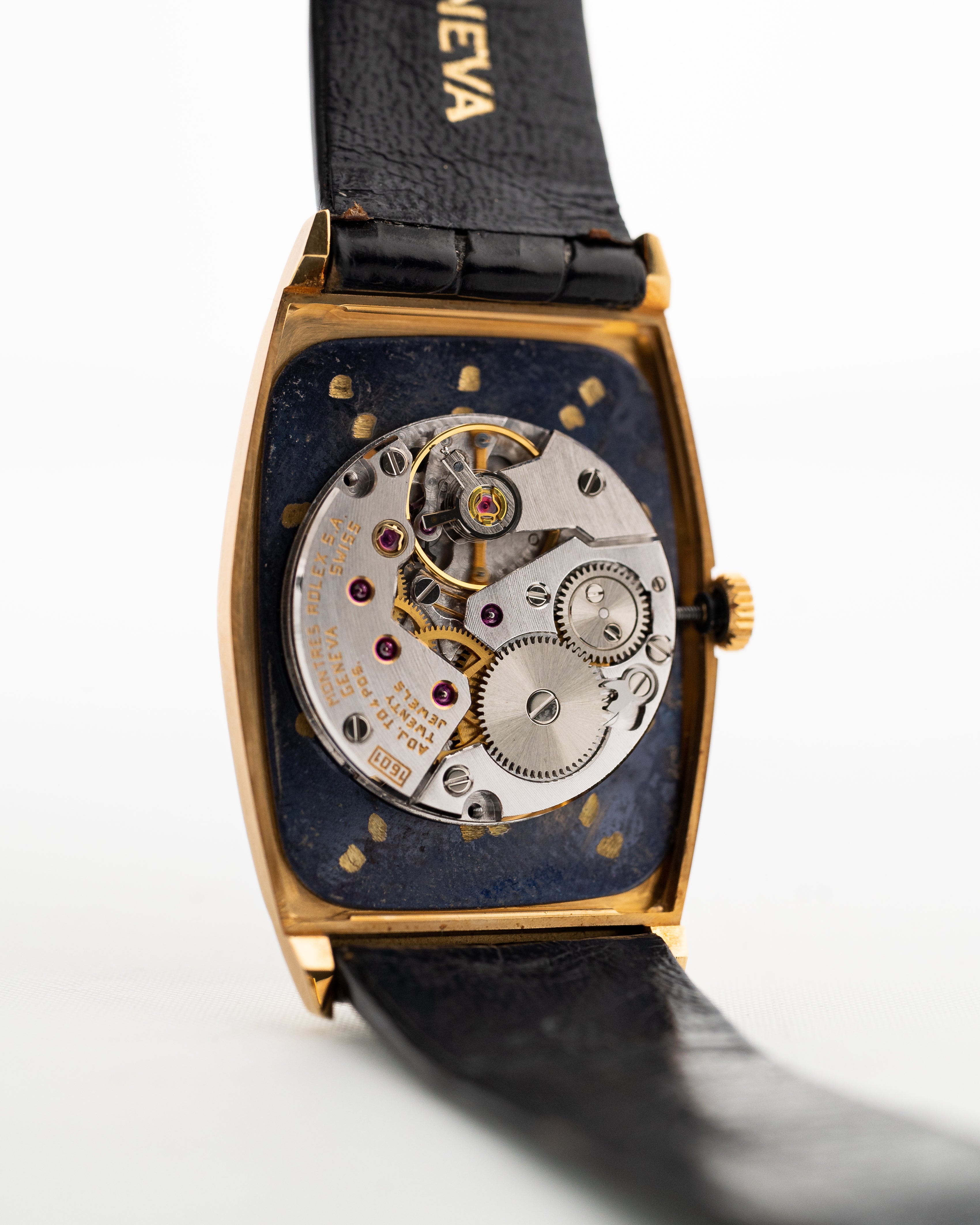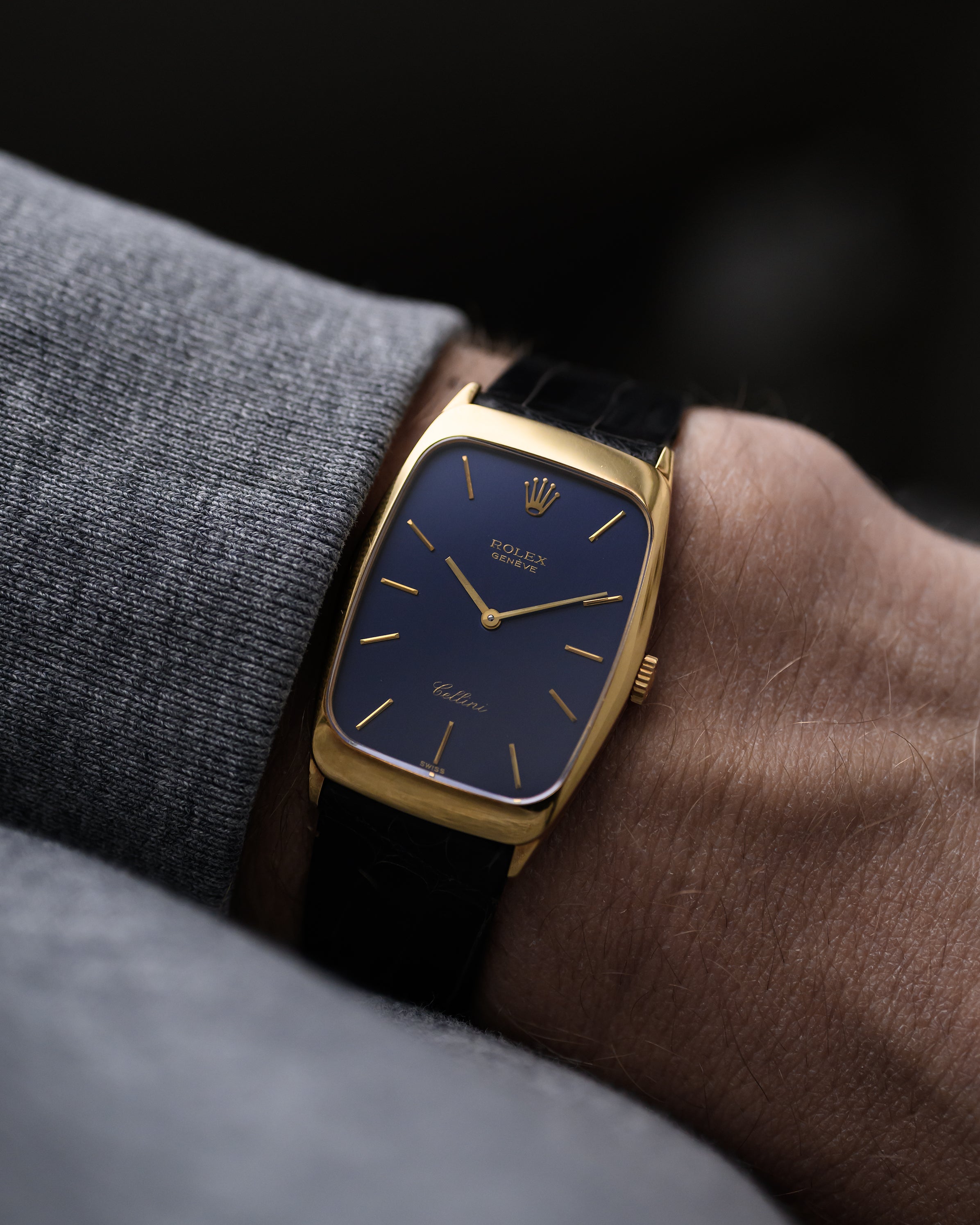 يُظهر خط رولكس تشيليني الجانب الأنيق من رولكس مقارنةً بطرازاتها الرياضية الأكثر شهرة. وقد زُوّد هذا الإصدار بعلبة من الذهب الأصفر عيار 18 قيراطًا على شكل علبة من الذهب الأصفر، وهو شكل علبة غير معتاد بالنسبة لرولكس.