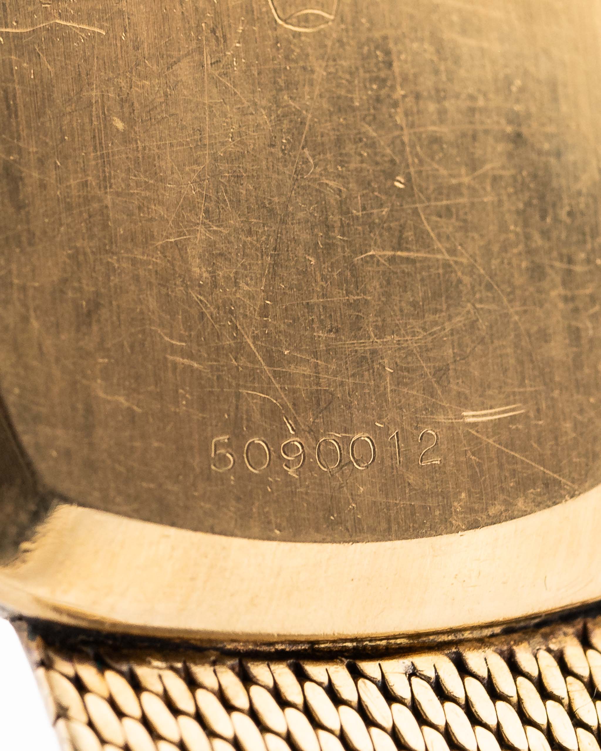 يشع ميناها الذهبي الغامق بالدفء والفخامة، ويتناغم بشكل مثالي مع سوار رولكس المطابق من الذهب الأصفر عيار 18 قيراطًا. يضيف الإطار المنقوش بشكل معقد مع مسار الدقائق طبقة من الحرفية التي ترتقي بالمظهر بأكمله.