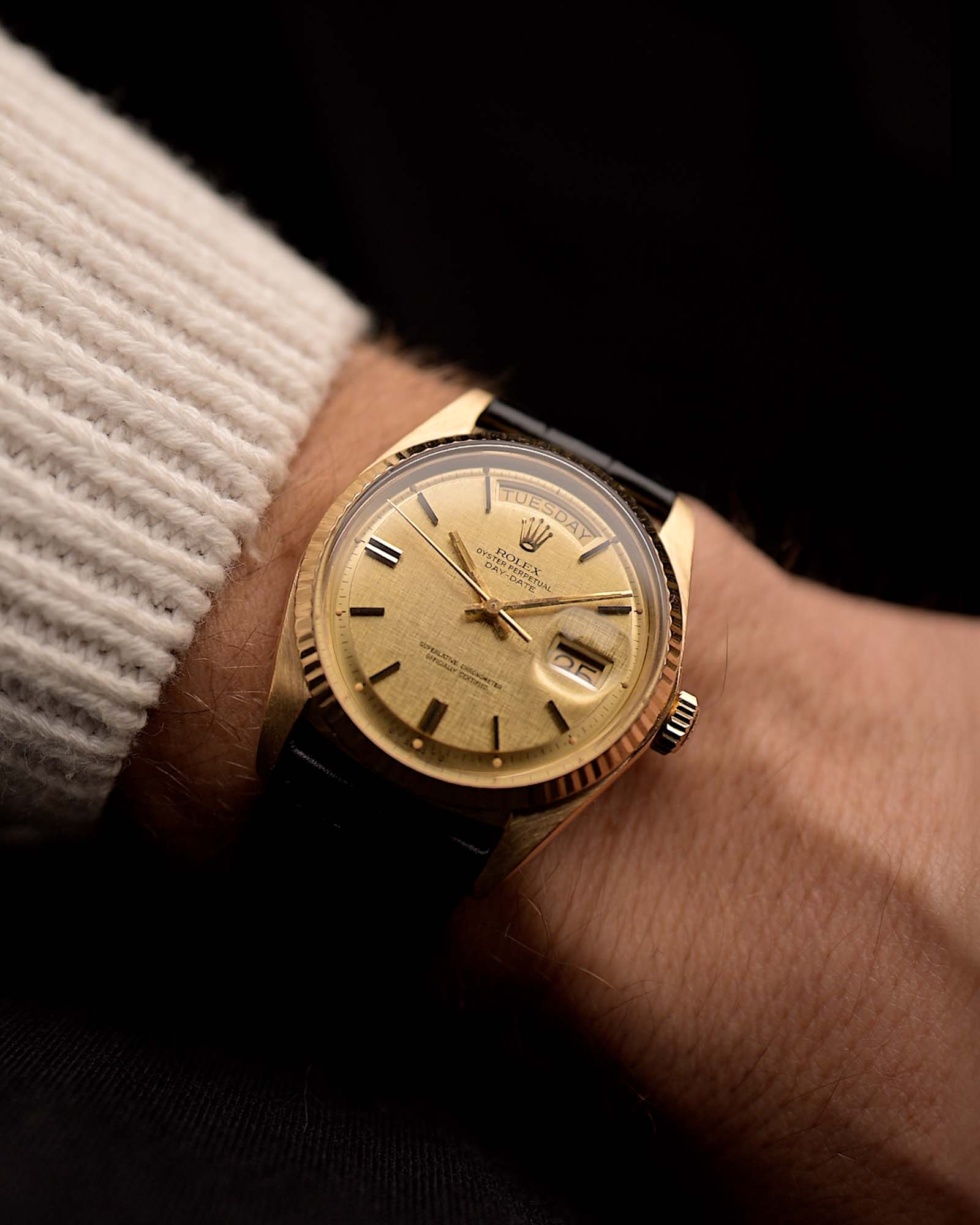تعتبر ساعة رولكس داي-ديت قمة الأناقة الكلاسيكية، وتعد هذه الساعة من طراز 1803 لعام 1973 مثالاً ساحراً بشكل خاص. يأتي هذا الطراز في علبة من الذهب الأصفر عيار 18 قيراطًا، ويجمع بين النسب الكلاسيكية لساعة Day-Date وأحد أكثر تصميمات المينا رواجًا في تلك الحقبة: مينا ذهبي على شكل فطيرة. تعكس سطحه المزخرف الضوء بشكل جميل، مما يمنح الساعة طابعًا راقيًا يميزها عن التصميمات القياسية.