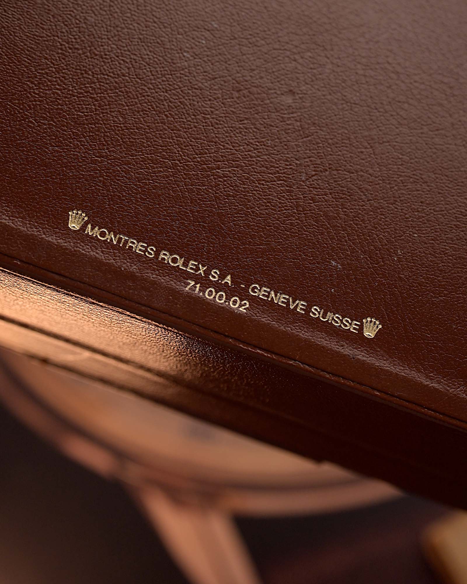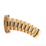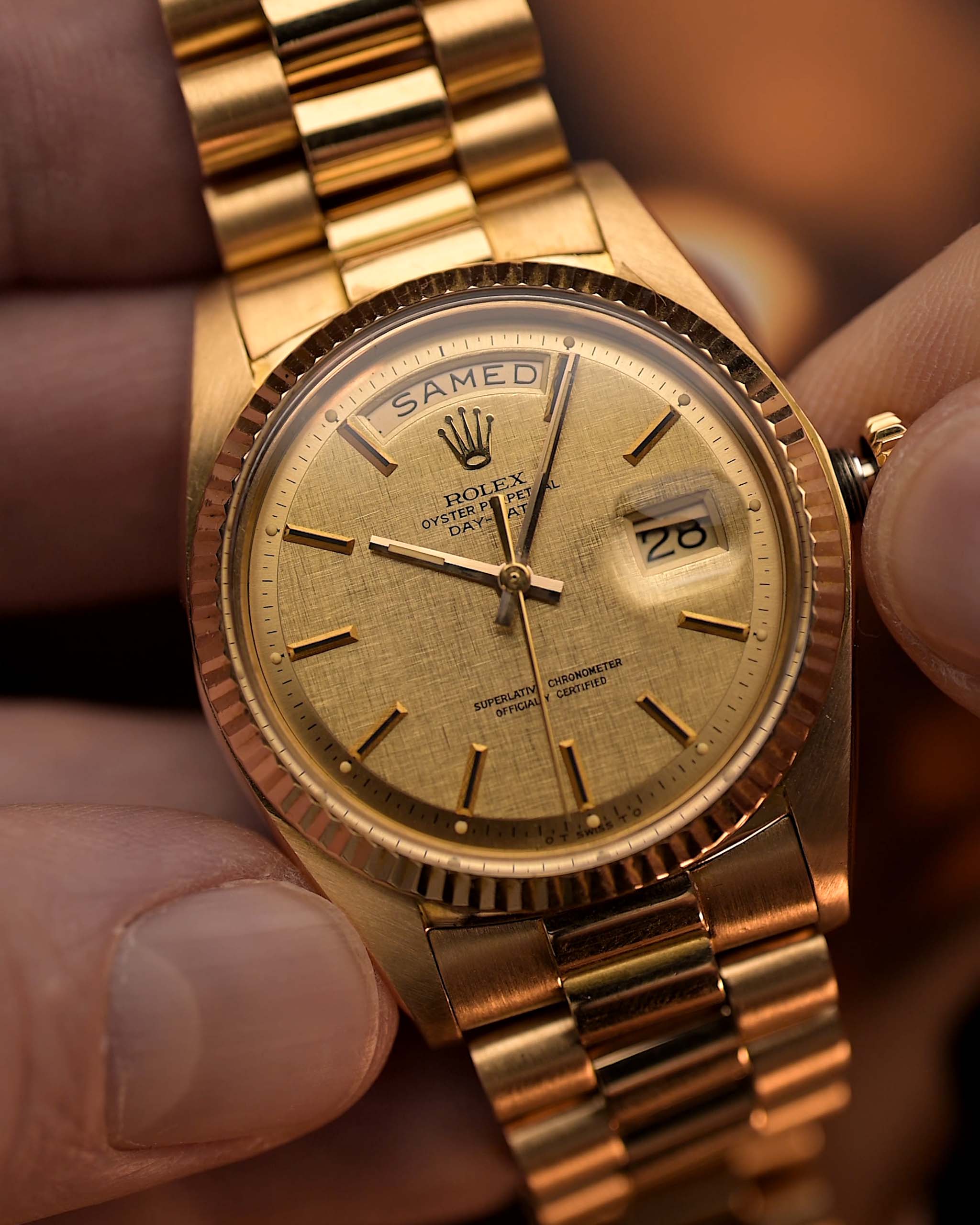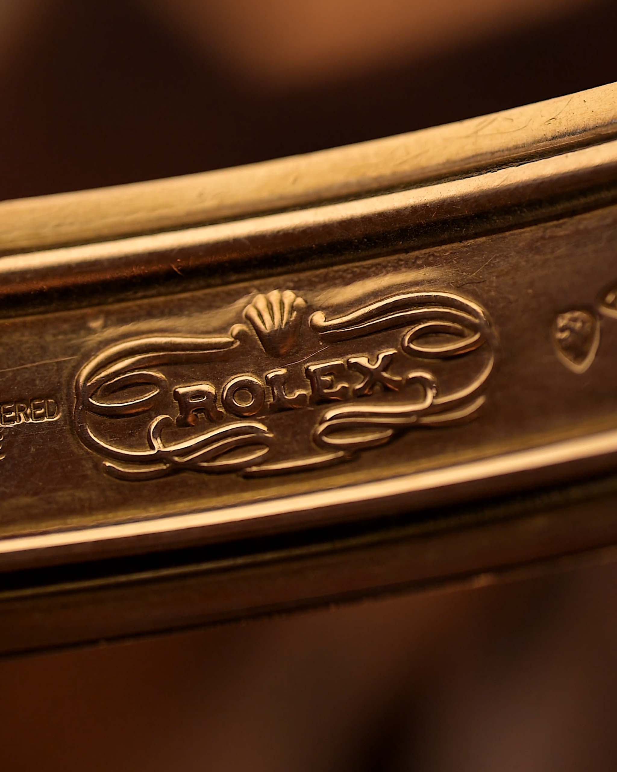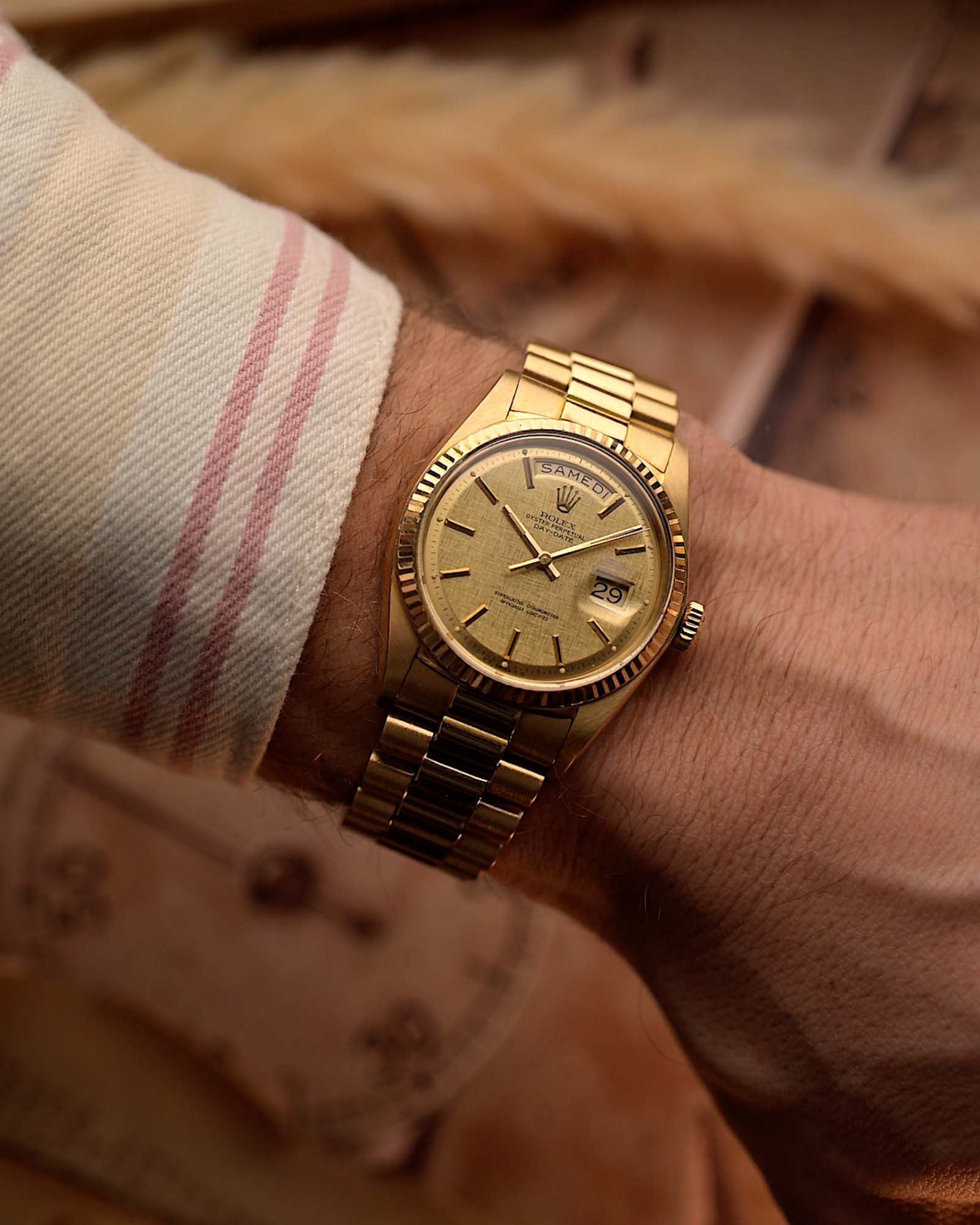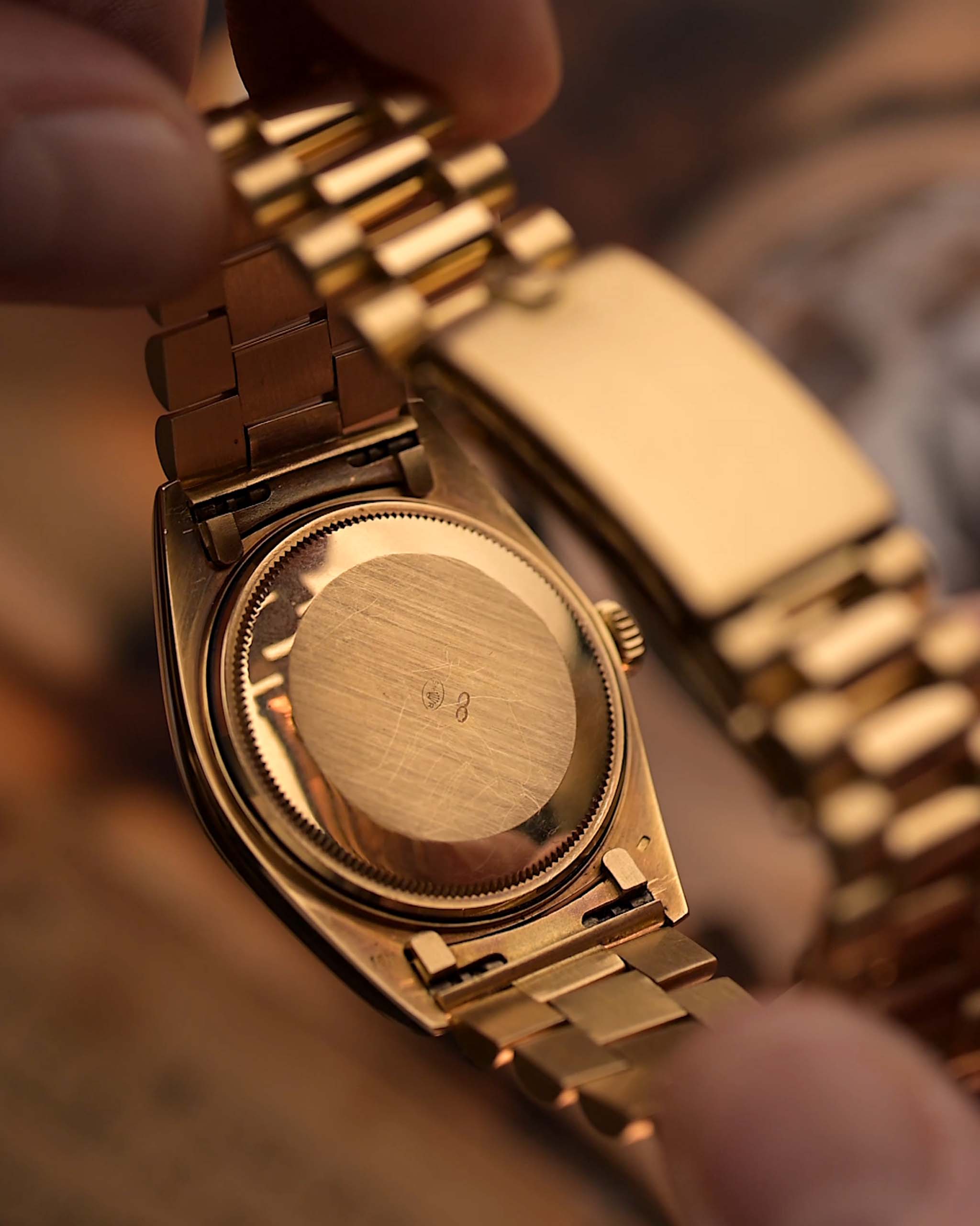 تعتبر ساعة رولكس داي-ديت قمة الأناقة الكلاسيكية، وتعد هذه الساعة من طراز 1803 لعام 1973 مثالاً ساحراً بشكل خاص. يأتي هذا الطراز في علبة من الذهب الأصفر عيار 18 قيراطًا، ويجمع بين النسب الكلاسيكية لساعة Day-Date وأحد أكثر تصميمات المينا رواجًا في تلك الحقبة: مينا ذهبي على شكل فطيرة. تعكس سطحه المزخرف الضوء بشكل جميل، مما يمنح الساعة طابعًا راقيًا يميزها عن التصميمات القياسية.