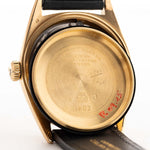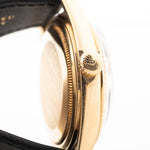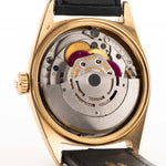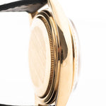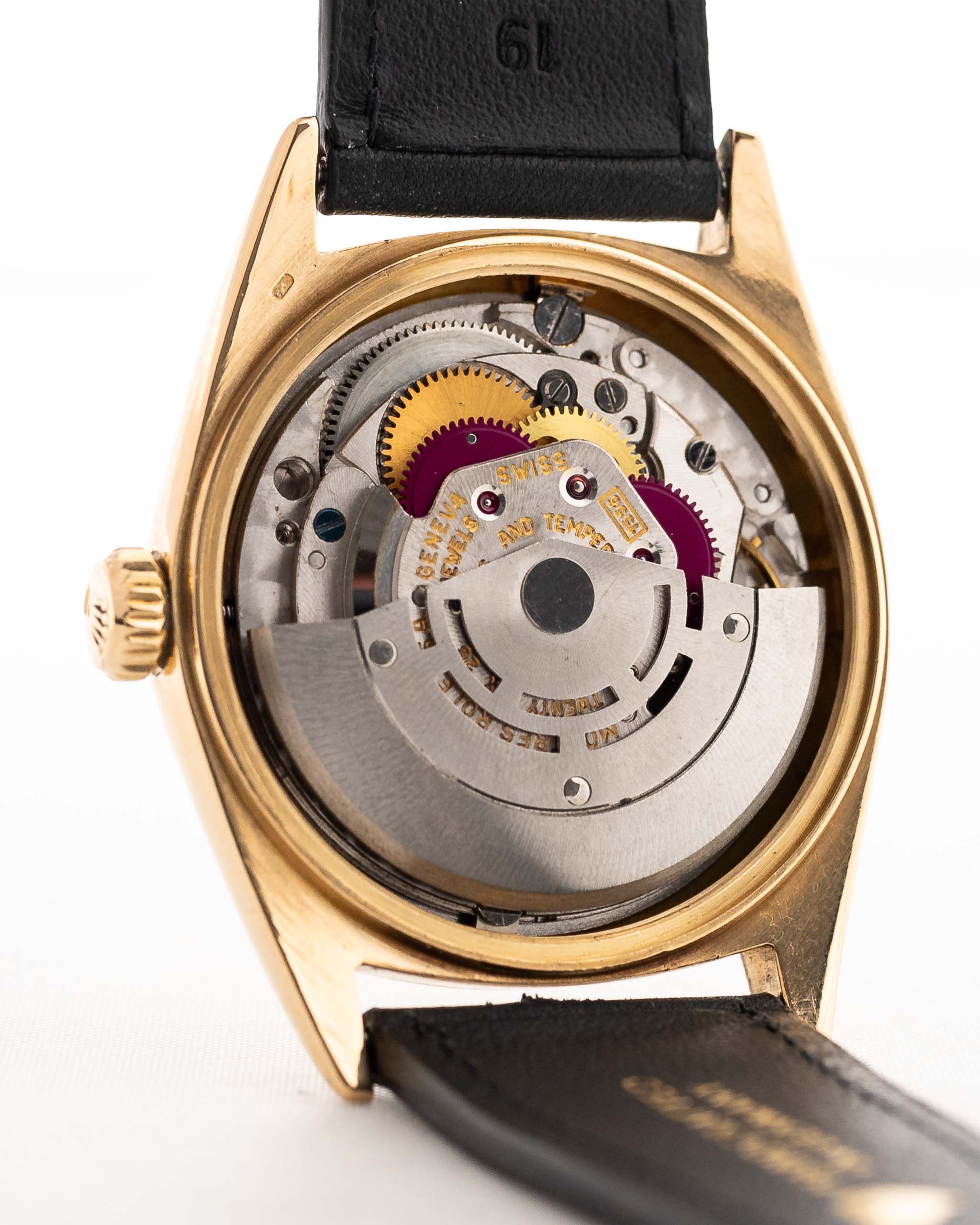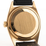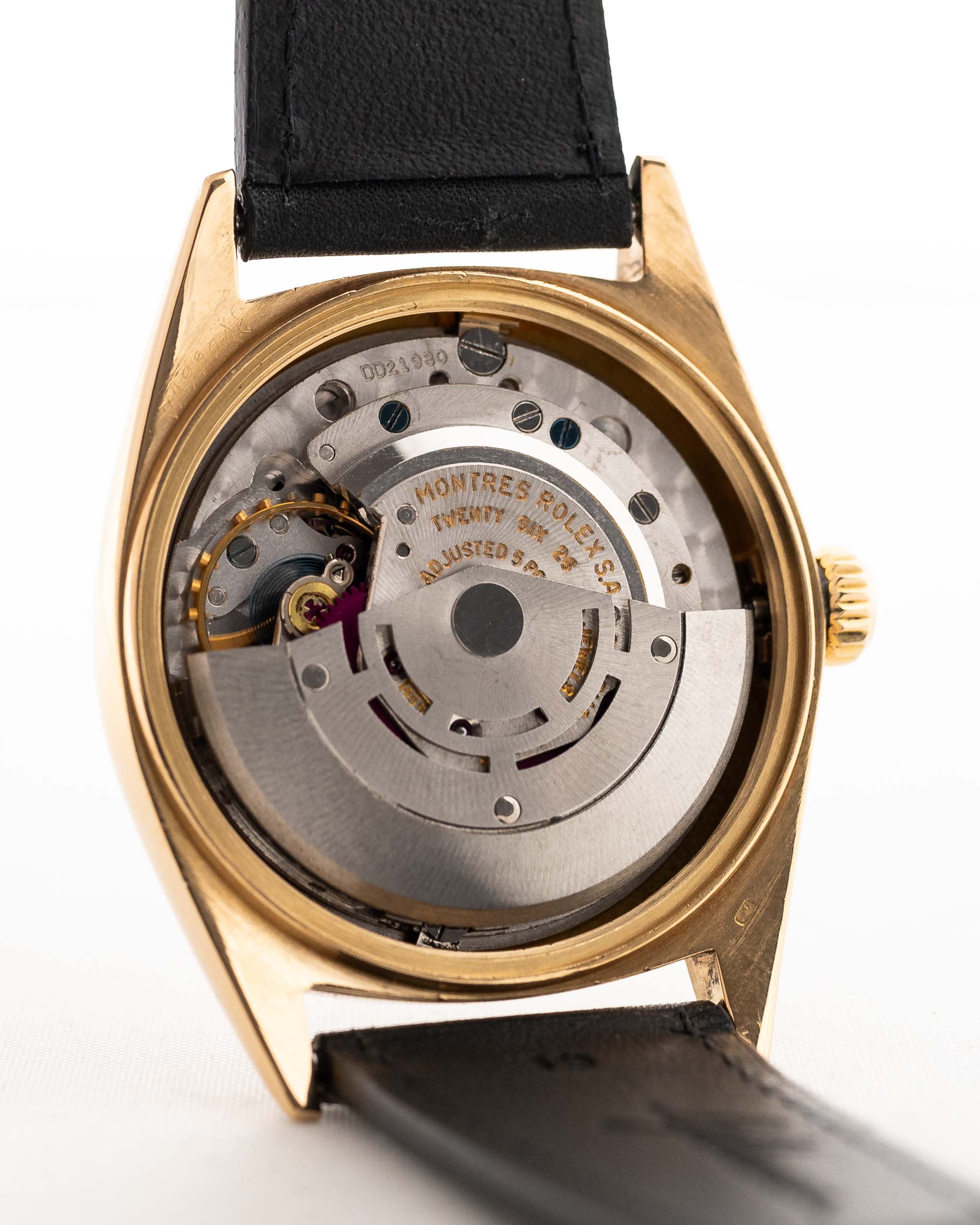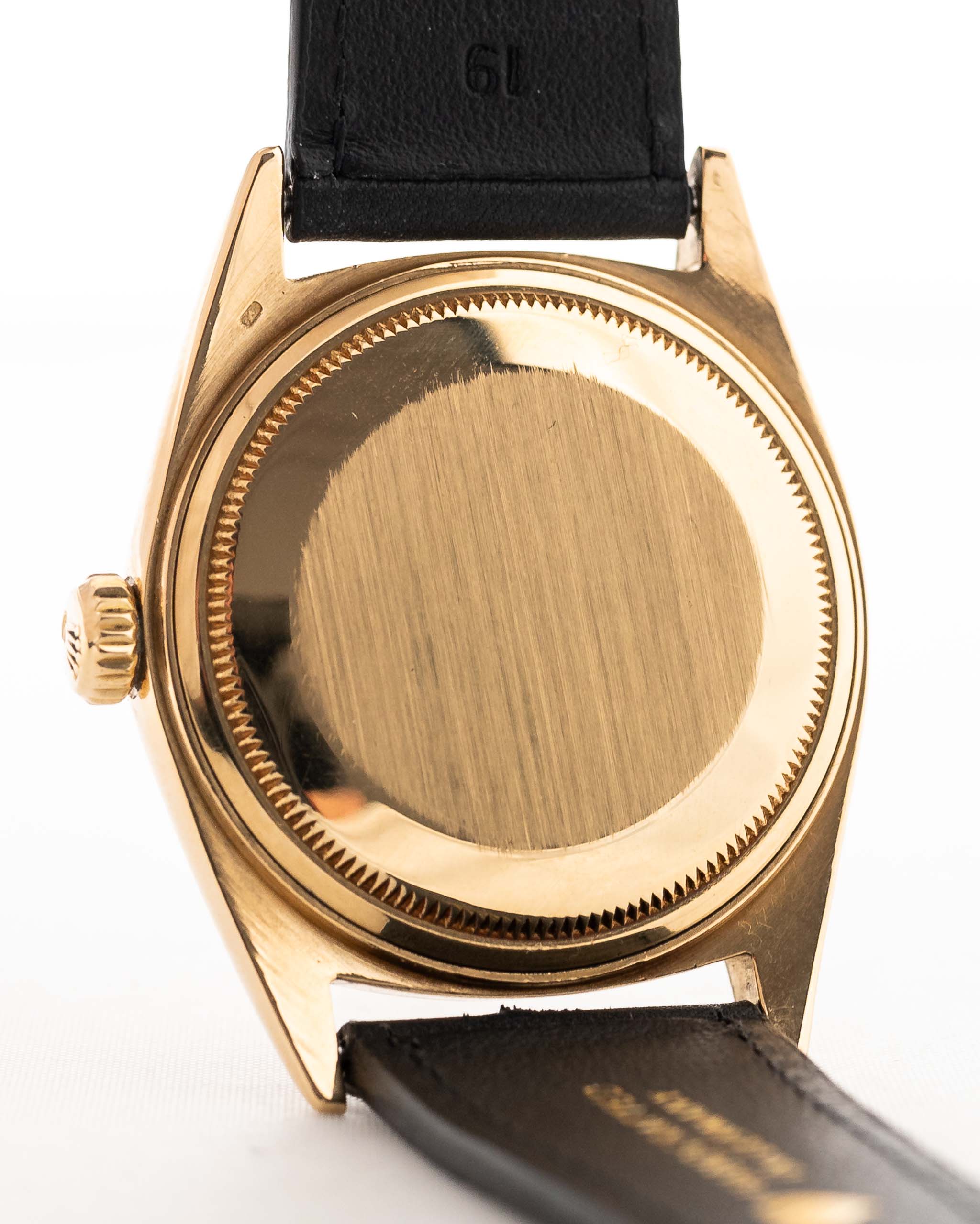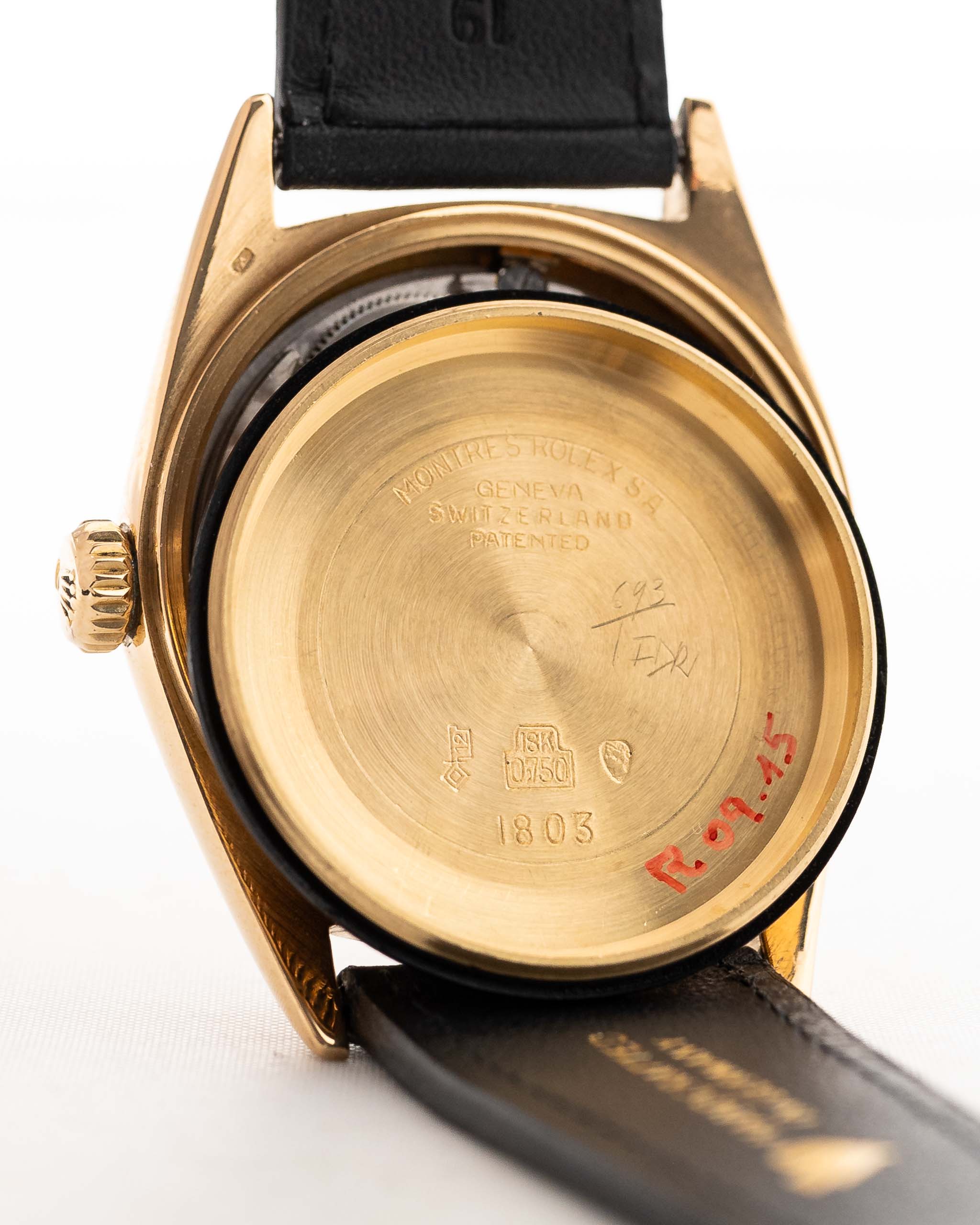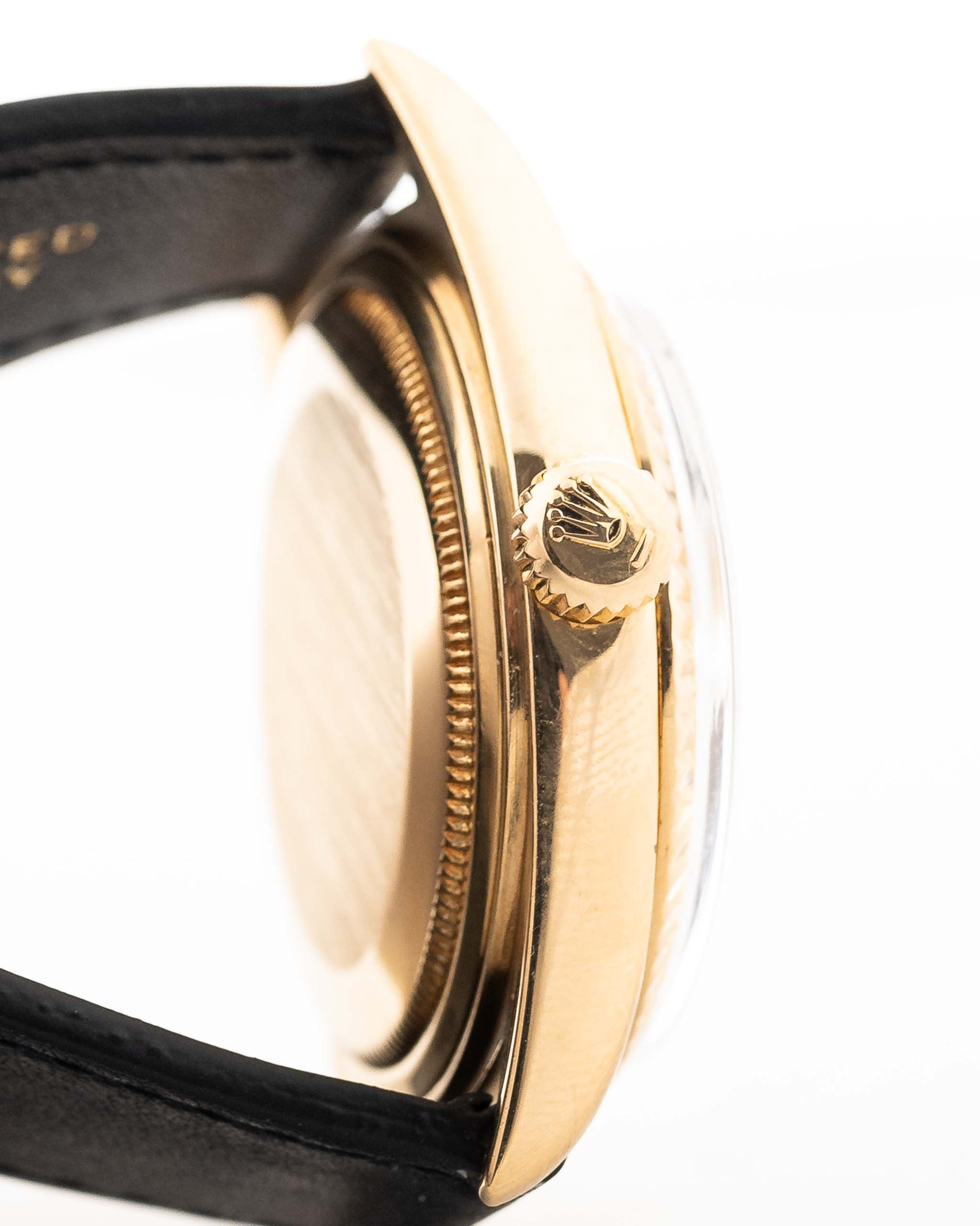 ساعة رولكس داي ديت 1803 بان عتيقة من رولكس داي ديت 1803 من عام 1966 على معصم. من الذهب الأصفر، عيار 36 مم أوتوماتيكي عيار 1556 بميناء ذهبي خالٍ من العيوب وحزام جلدي.