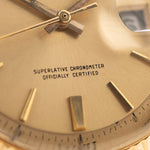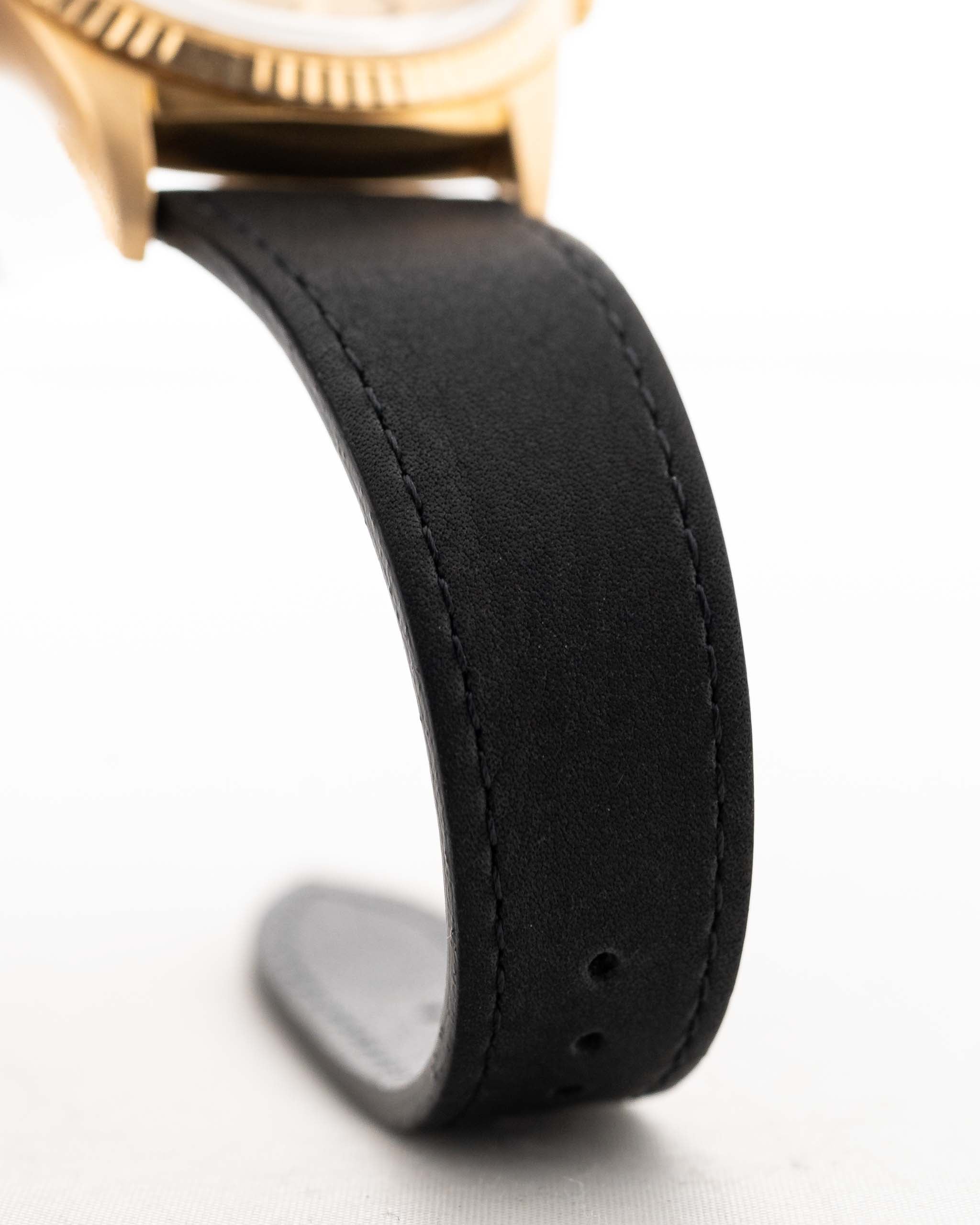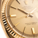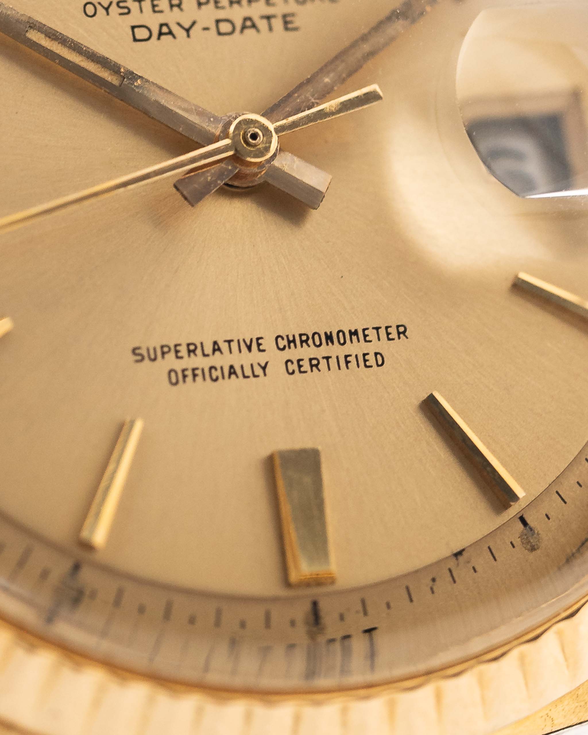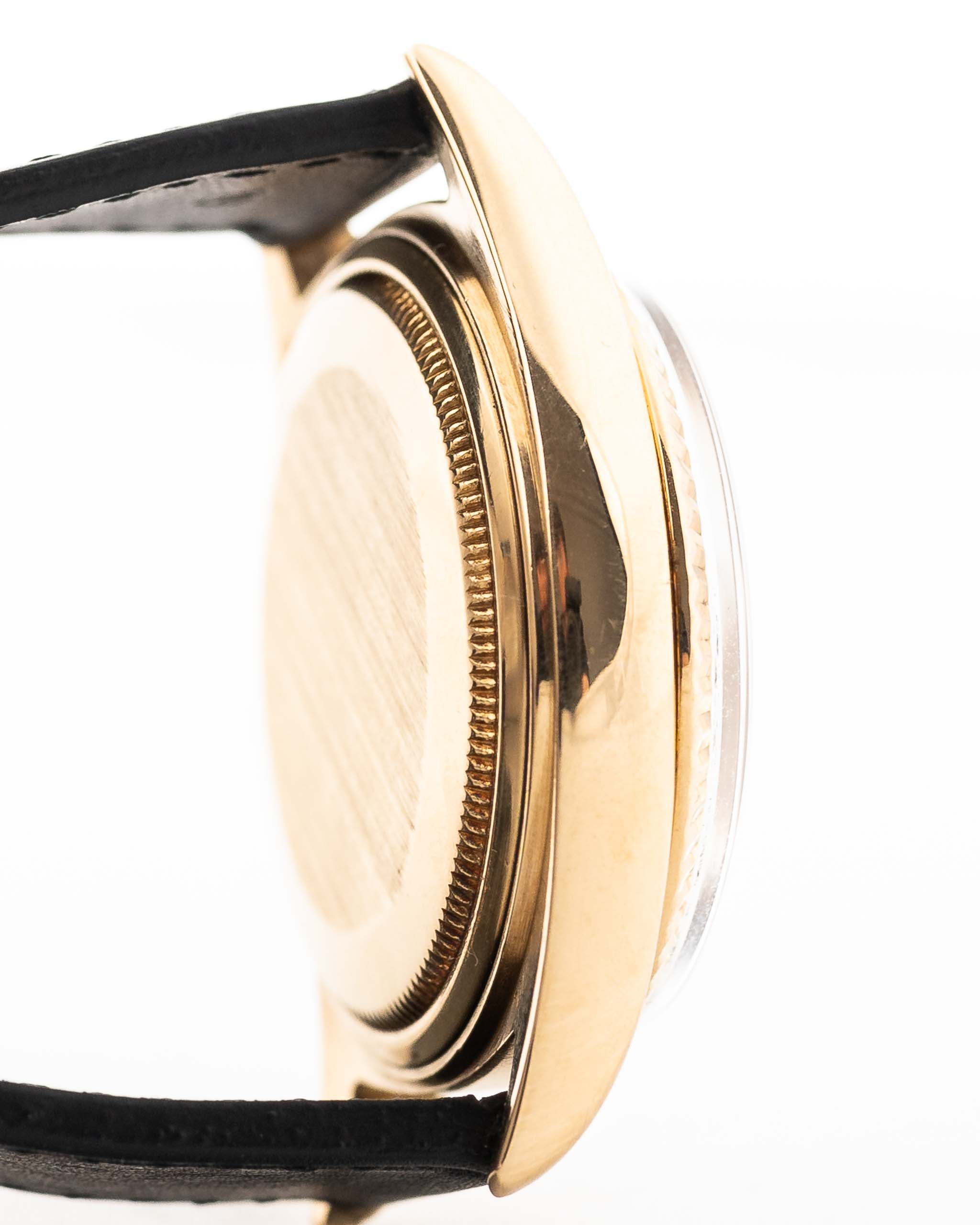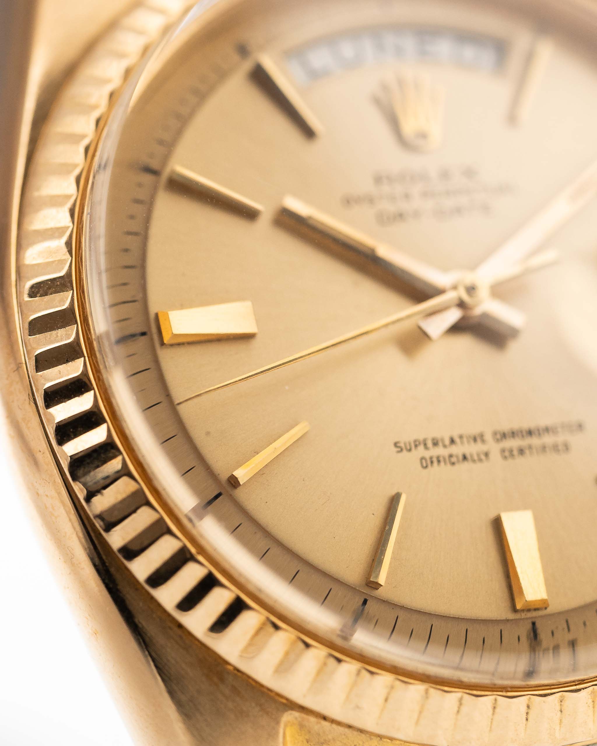 صورة مقرّبة لساعة رولكس داي ديت 1803 بان عتيقة من رولكس داي ديت 1803 من عام 1966. من الذهب الأصفر، عيار 36 م أوتوماتيكي عيار 1556 بميناء ذهبي ذهبي لا تشوبه شائبة وحزام جلدي.