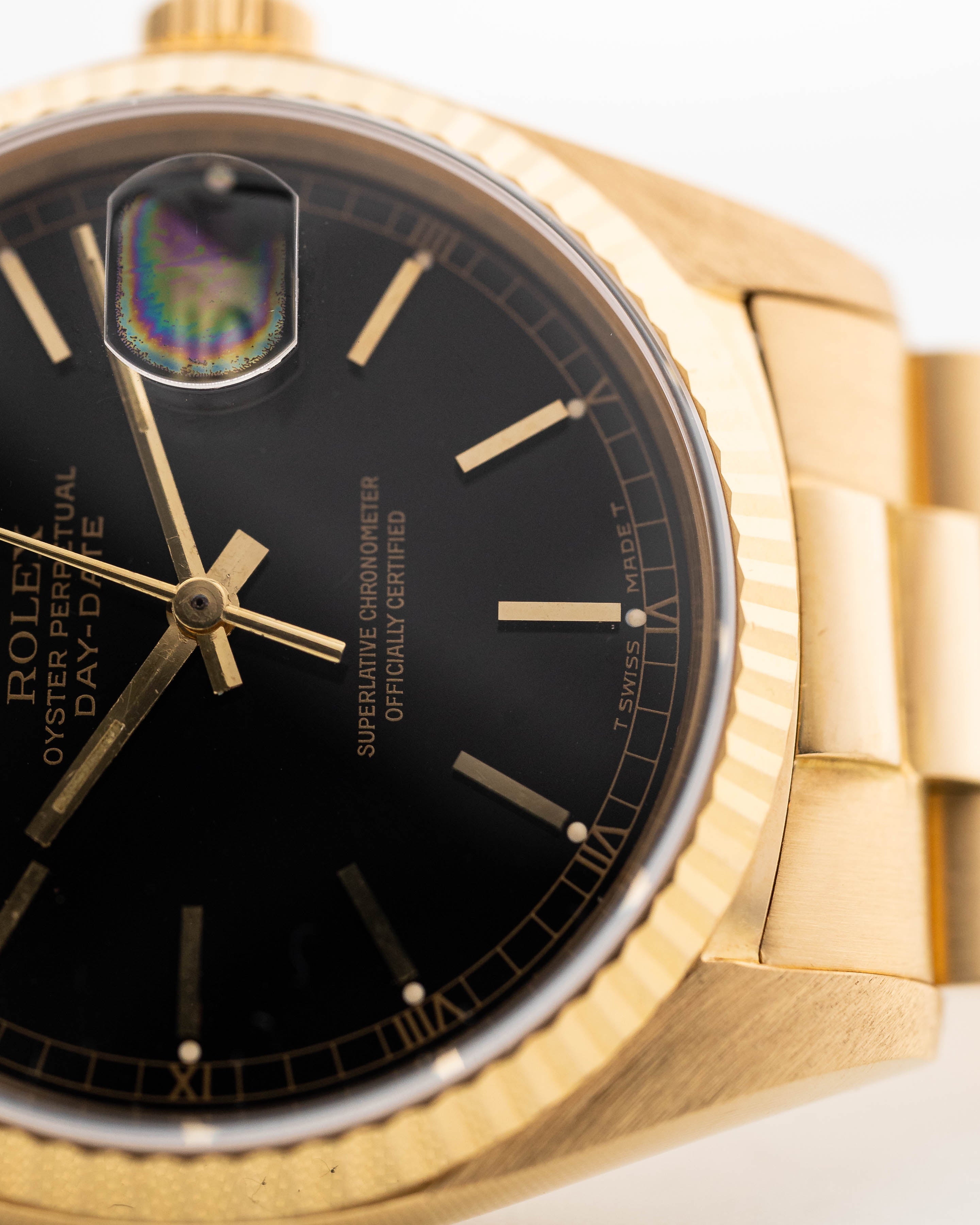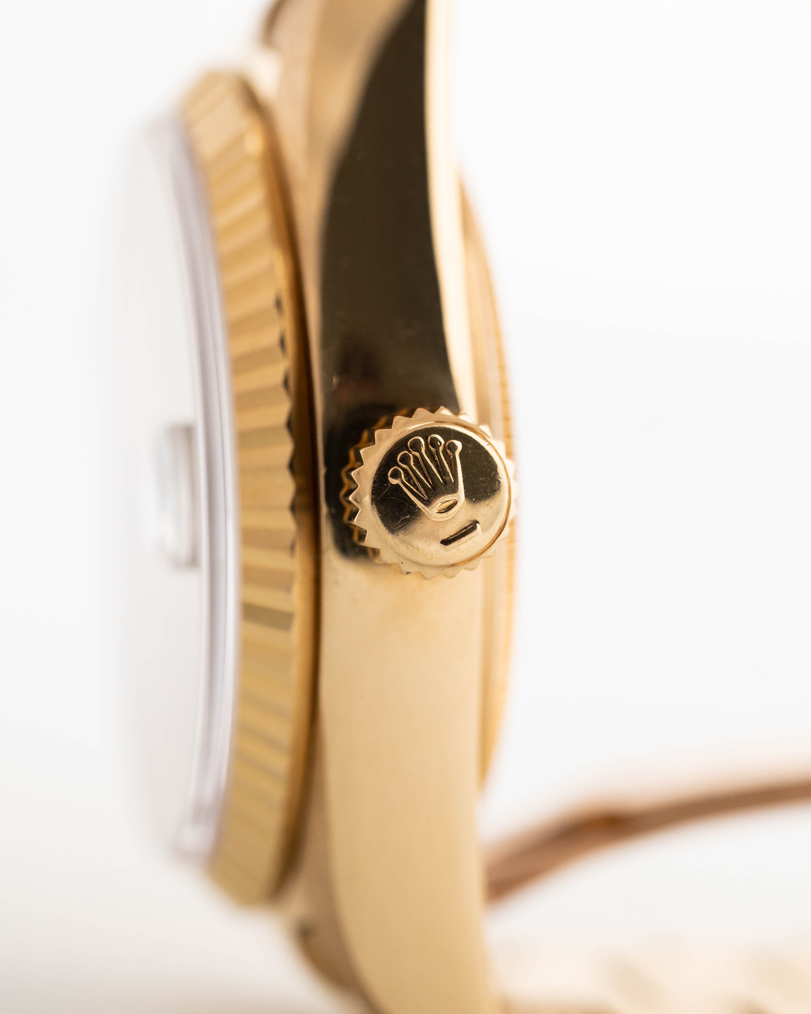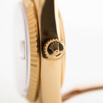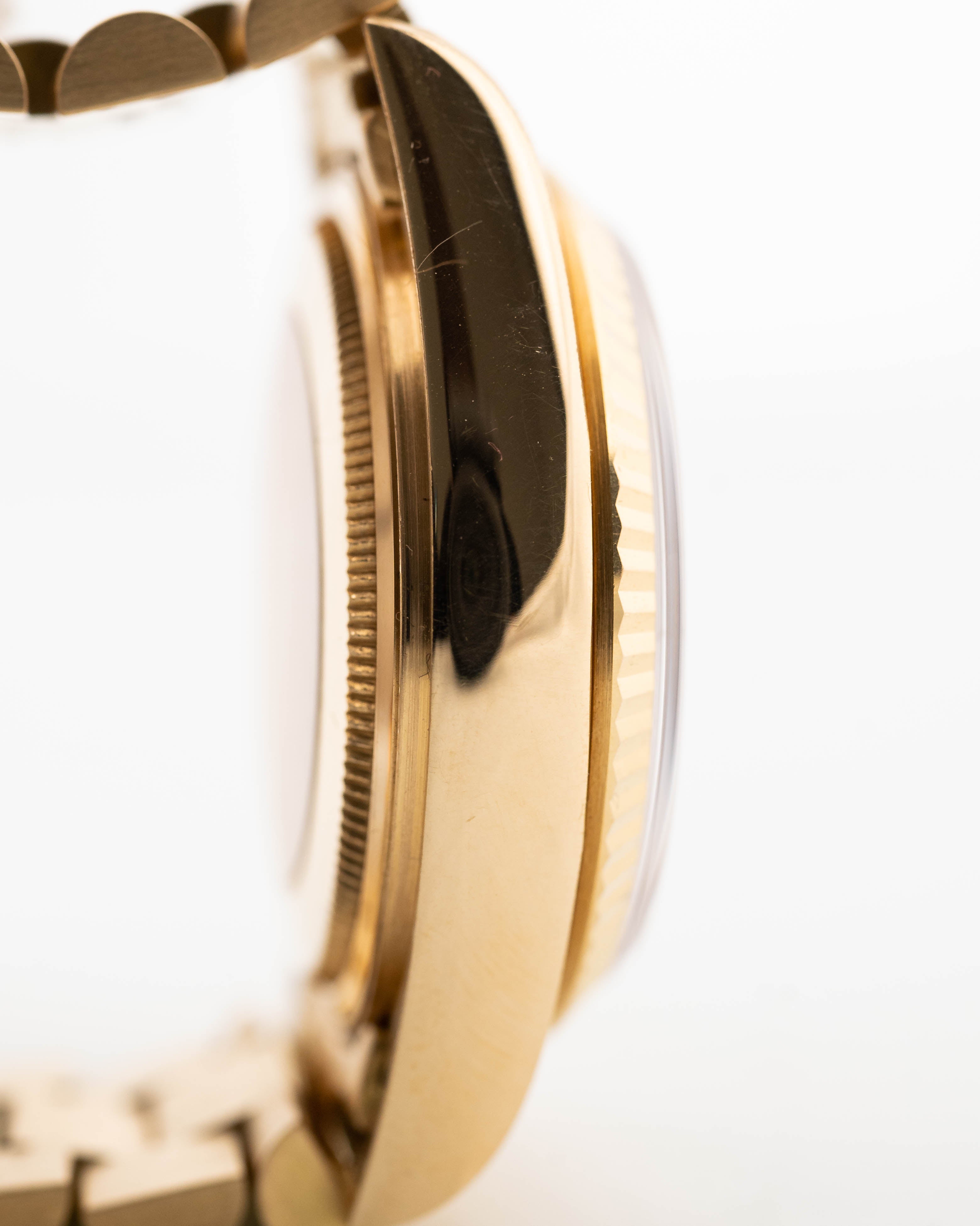 تُعدّ ساعة المرجع. 18038 هي ساعة Day-Date المثالية التي تكتمل بميناها الكلاسيكي الذي يحمل الاسم نفسه، وعلبة ذهبية صلبة مقاس 36 مم وإطار مخدّد. غير أن هذه النسخة المحدّثة تتميز بهيكل جديد مقاوم للماء، حيث صُمّمت الآن لتكون مقاومة للماء حتى عمق 100 متر، بالإضافة إلى بلورة من الياقوت الأزرق لمقاومة الخدوش بشكل أفضل. أما بالنسبة إلى الميناء، فقد عُرضت مجموعة متنوعة من التكوينات مع هذا الإصدار المرجعي، ولكن بالمقارنة مع الإصدارات السابقة، لم تعد حافة الميناء مائلة إلى الأسفل بأسلوب الفطيرة؛ بل أصبحت مسطحة.