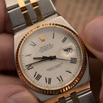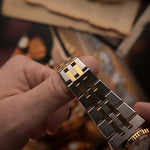 - سوار رولكس أصلي من الفولاذ المقاوم للصدأ/الذهب الأصفر Oysterquartz (VE) مع بعض التمدد الطفيف جدًا يناسب معصم يصل حجمه إلى 19.5 سم / بسمك 2.7 مم