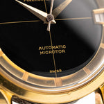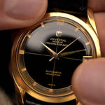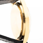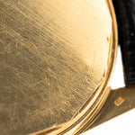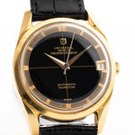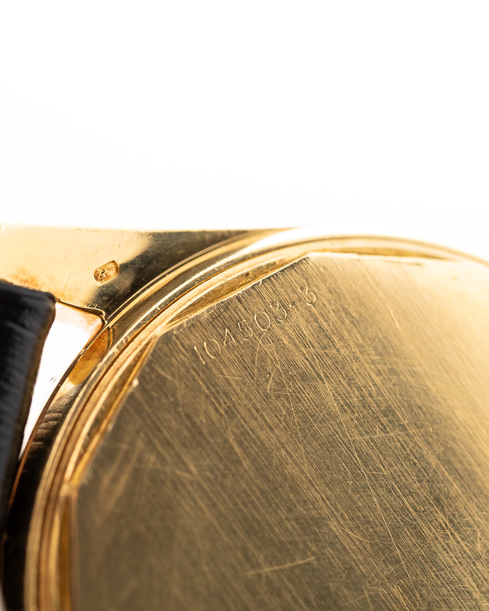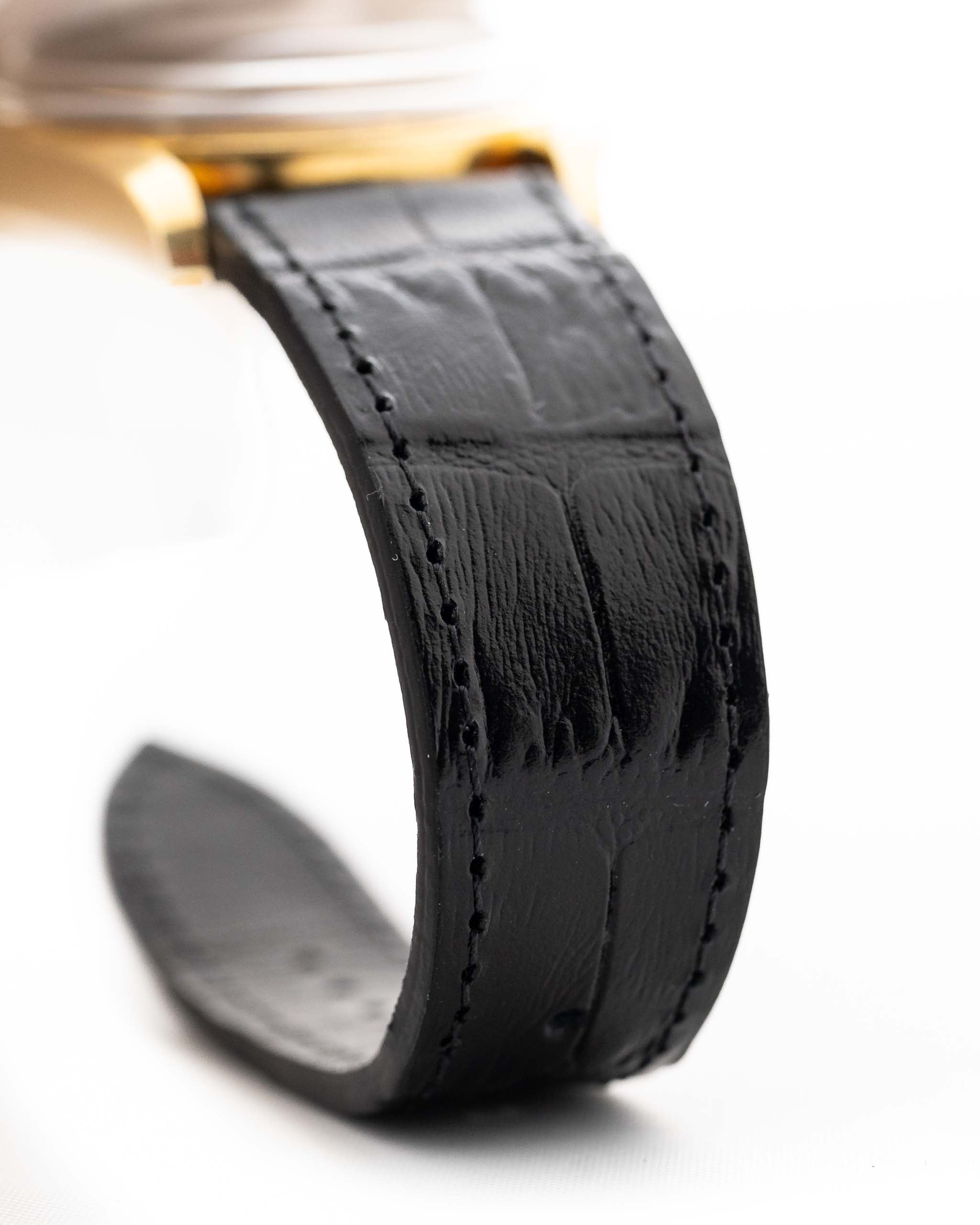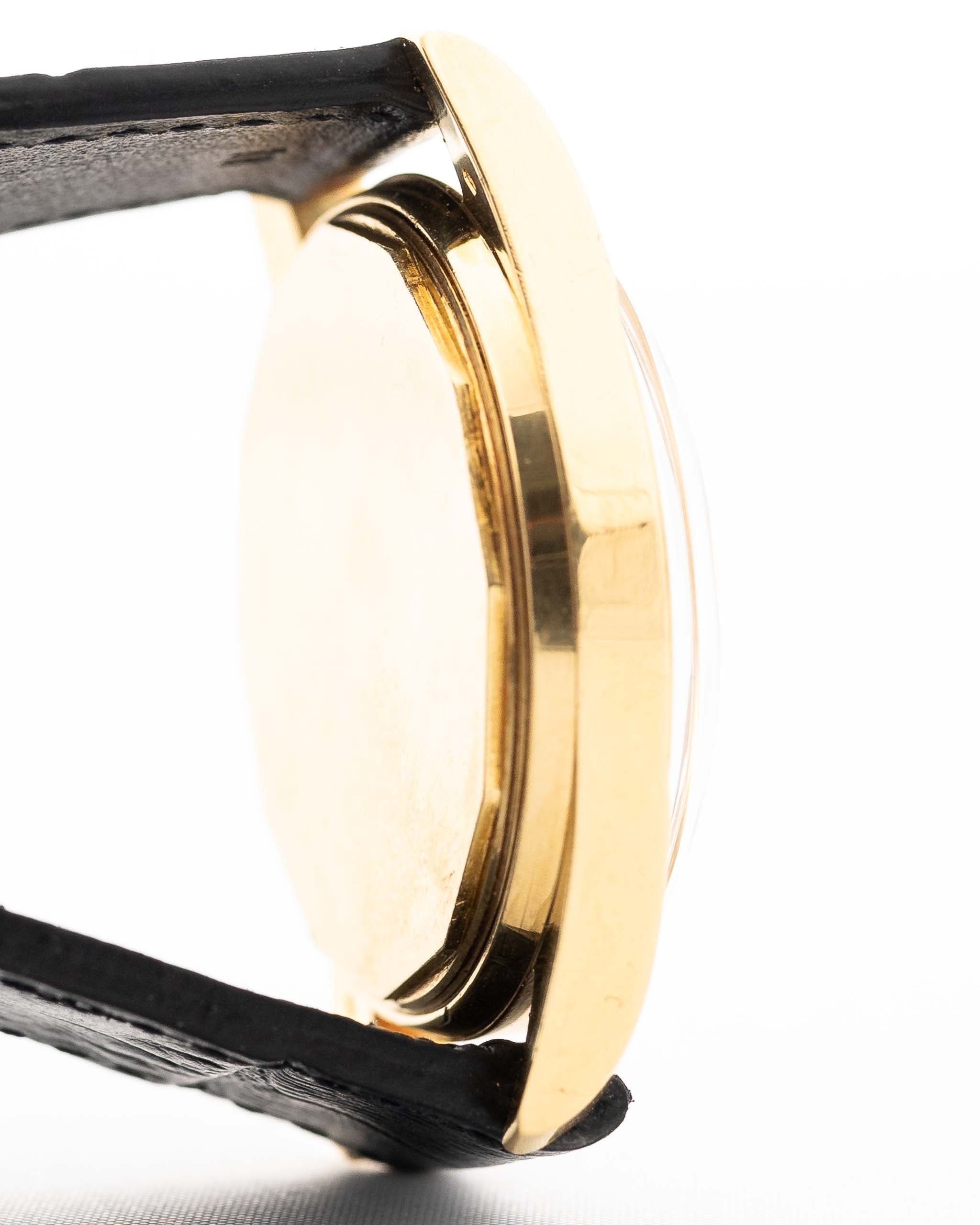 هذا المرجع النادر . 104503-3 النادرة واحدة من أكثر إصدارات بوليروتر أناقة على الإطلاق. صُنعت الساعة من الذهب الأصفر الخالص عيار 18 قيراطًا، وتتميز بعروات رفيعة وعلبة متناسقة بشكل جميل بقطر 34 مم وميناء أسود متقاطع مذهل ينضح بالفخامة الباهرة. لا يزال التاج الأصلي الموقّع بتوقيع UG والإبزيم المطلي بالذهب موجودين - وهي تفاصيل تجعل من هذه الساعة قطعة استثنائية لهواة جمع الساعات.