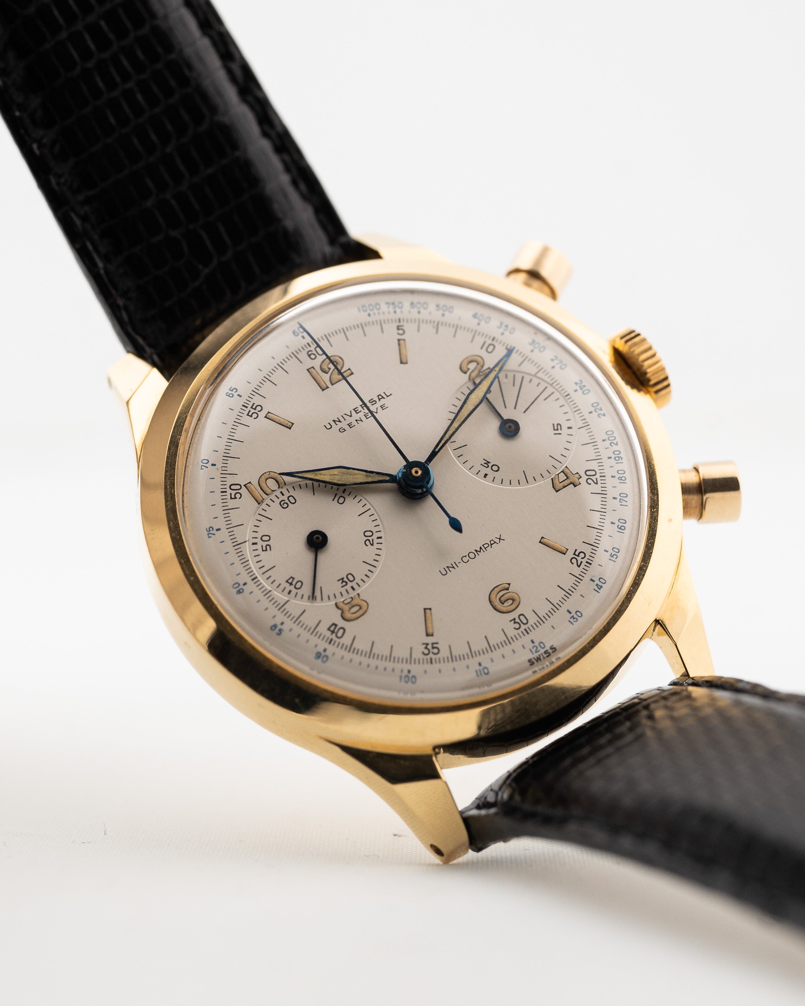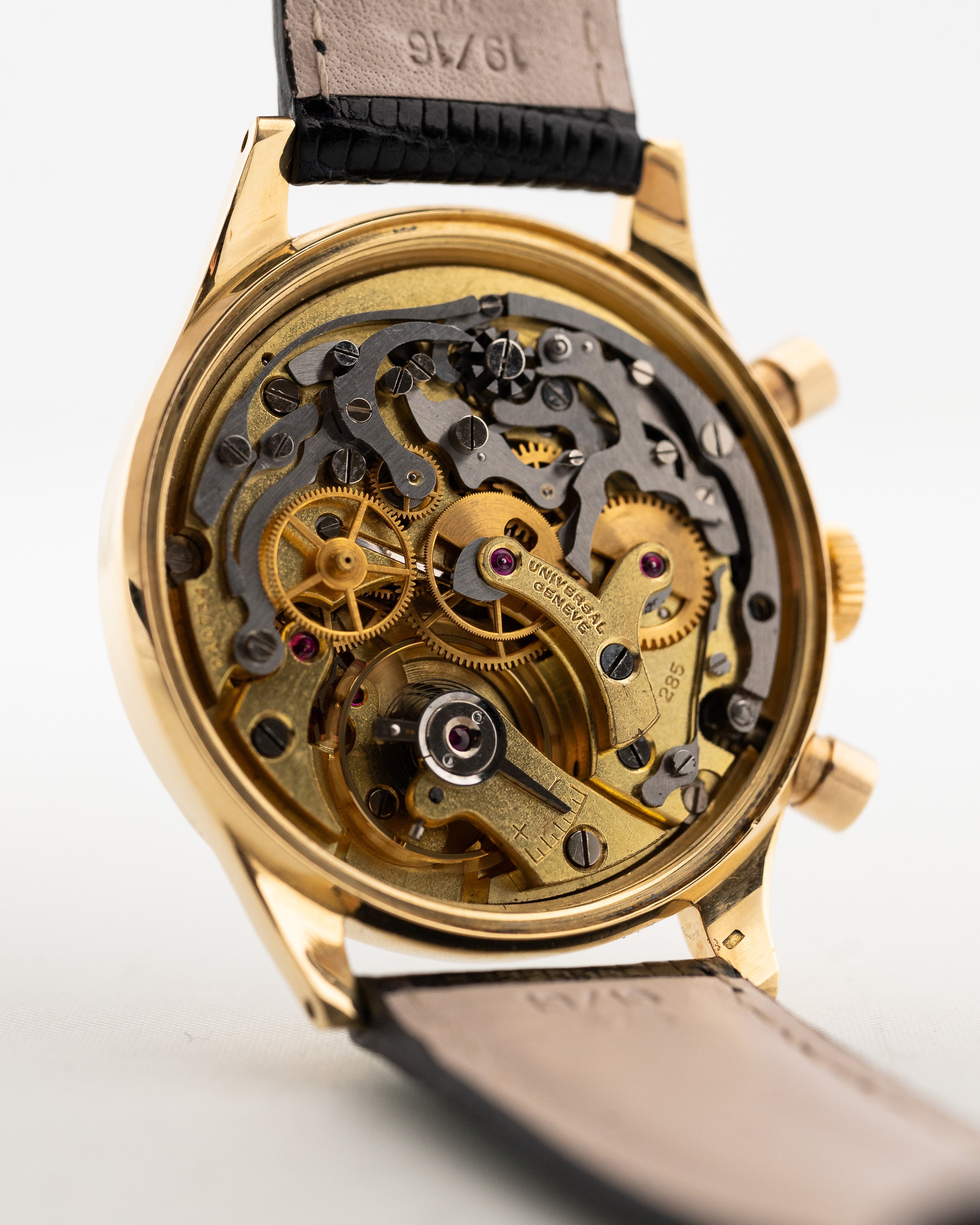 تُعدّ ساعة Universal Geneve Uni-Compax مثالاً رائعاً على ما أبدعته الشركة المصنعة في أربعينيات القرن الماضي. تضمّ علبة ساعة جامبو المصنوعة من الذهب الأصفر عيار 18 قيراطًا والمزوّدة بأزرار دائرية الحركة المرغوبة عيار 285.