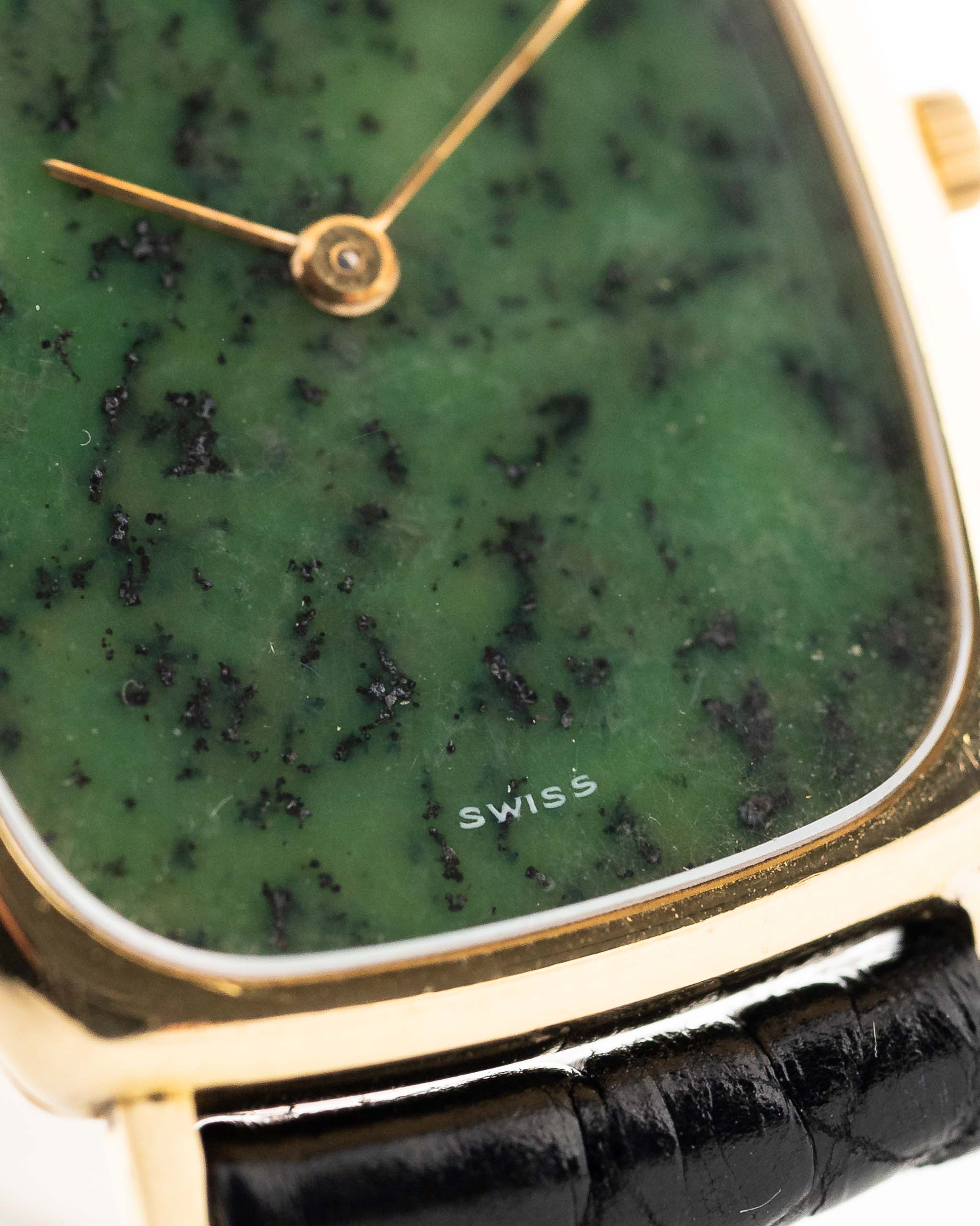 تتميّز هذه القطعة بالذات بميناها الفريد من نوعه المصنوع من اليشم وعقاربها وعلامات ساعاتها الذهبية وشعار فاشرون وعلبة قوية من الذهب الأصفر عيار 18 قيراطًا.