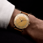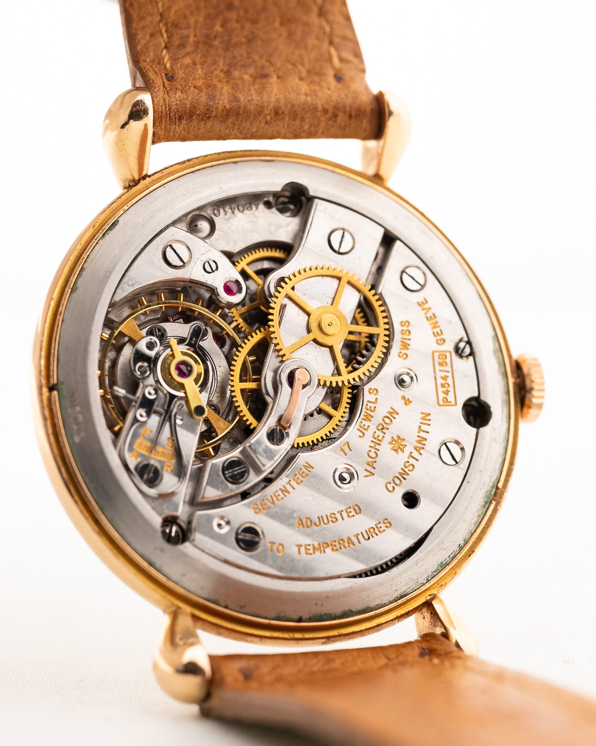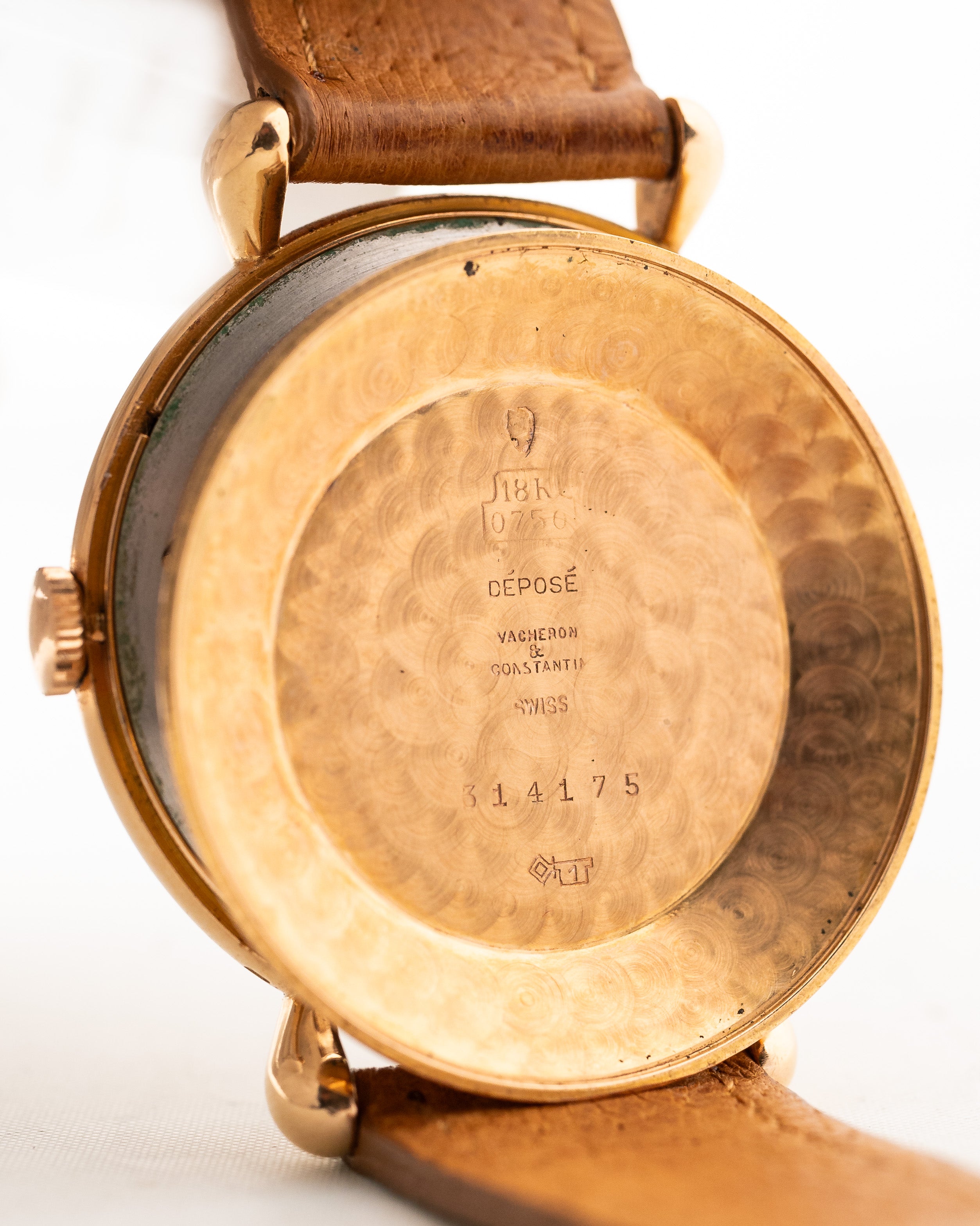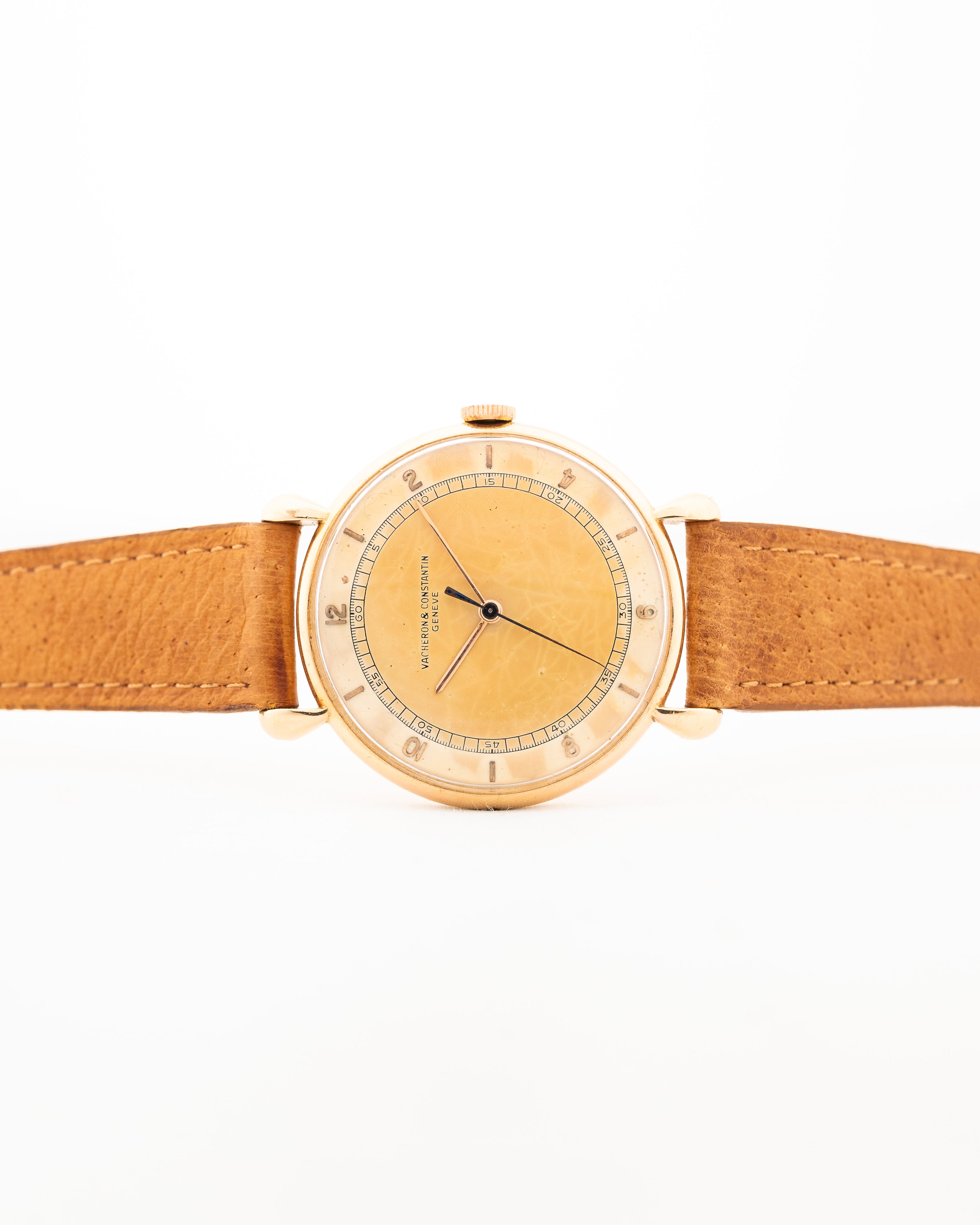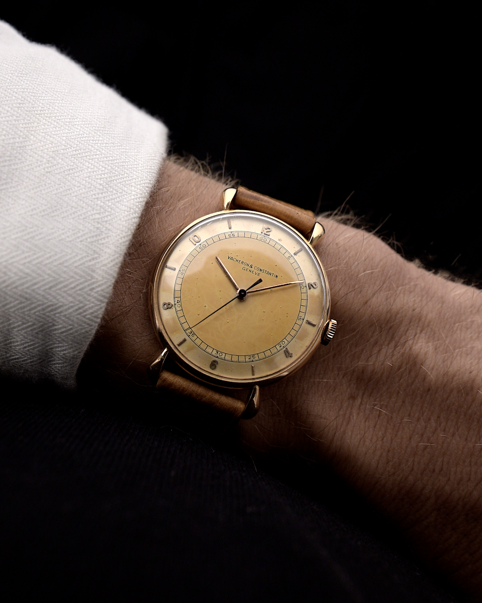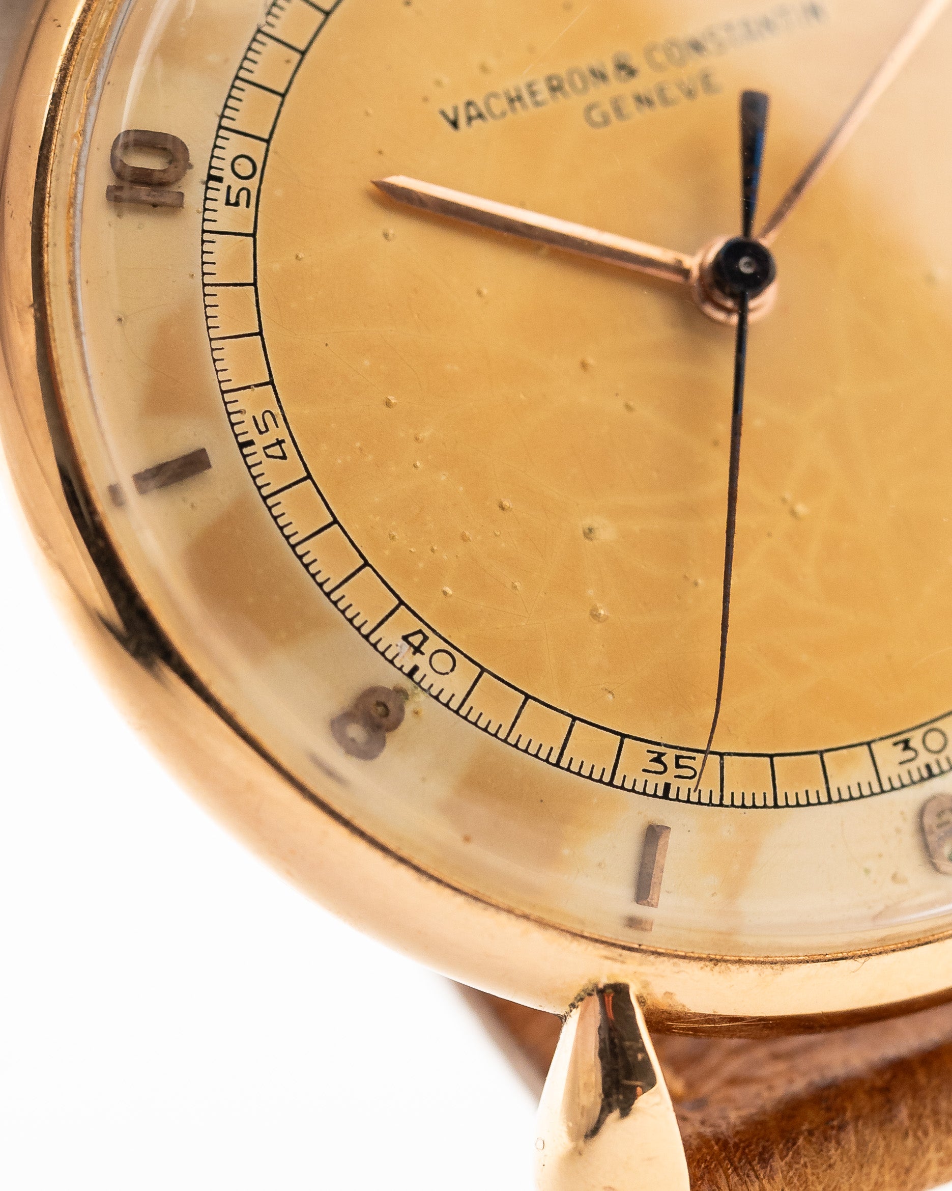 لدينا هنا ساعة فساتين ڤاشرون كونستانتين ذات تشطيبات جميلة تعود إلى أربعينيات القرن العشرين بعروات فريدة من نوعها على شكل دمعة وميناء مصمم بشكل مذهل بتفاصيل كثيرة يصعب ذكرها كلها. ونحن نميل إلى تسميتها بالعسلية لأن هذا ما يتبادر إلى أذهاننا عندما نرى هذا الميناء الجميل الدافئ والمتساوي.