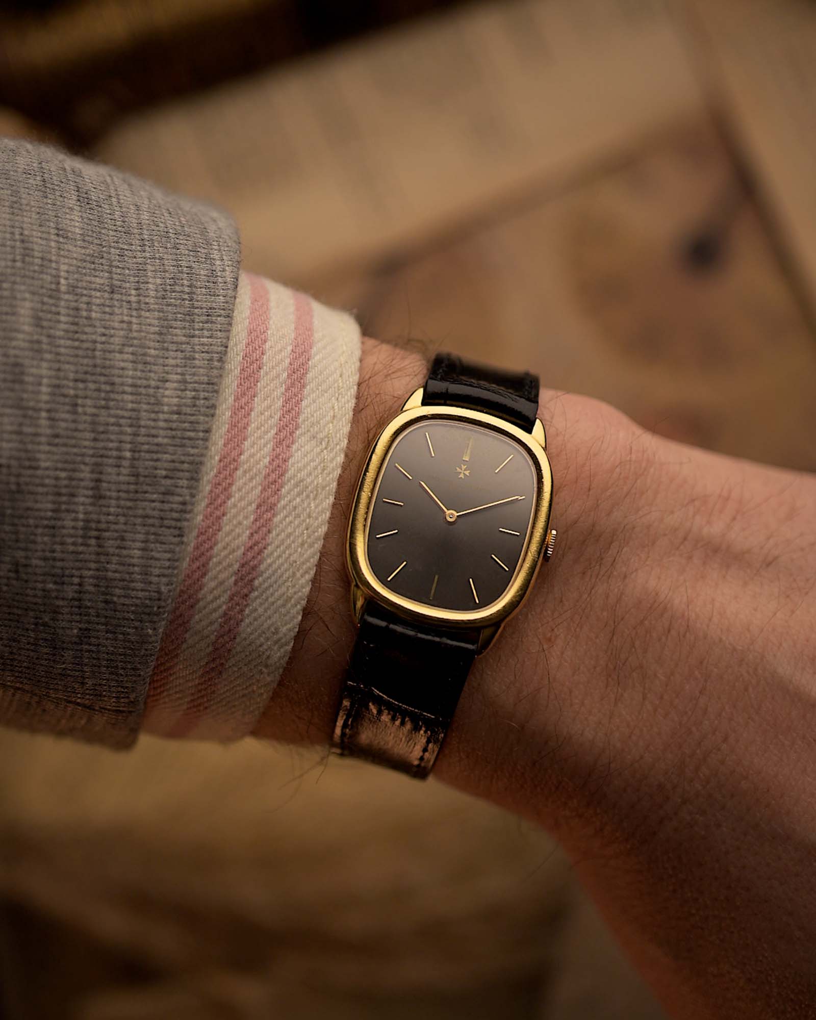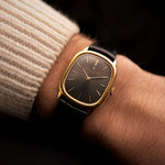 ساعة Vacheron Constantin 39007 Ellipse عتيقة من الذهب عيار 18 قيراط، بعلبة بيضاوية الشكل، وميناء رمادي، وحزام جلدي أسود، موضوعة على يد أمام خلفية ضبابية.