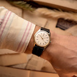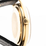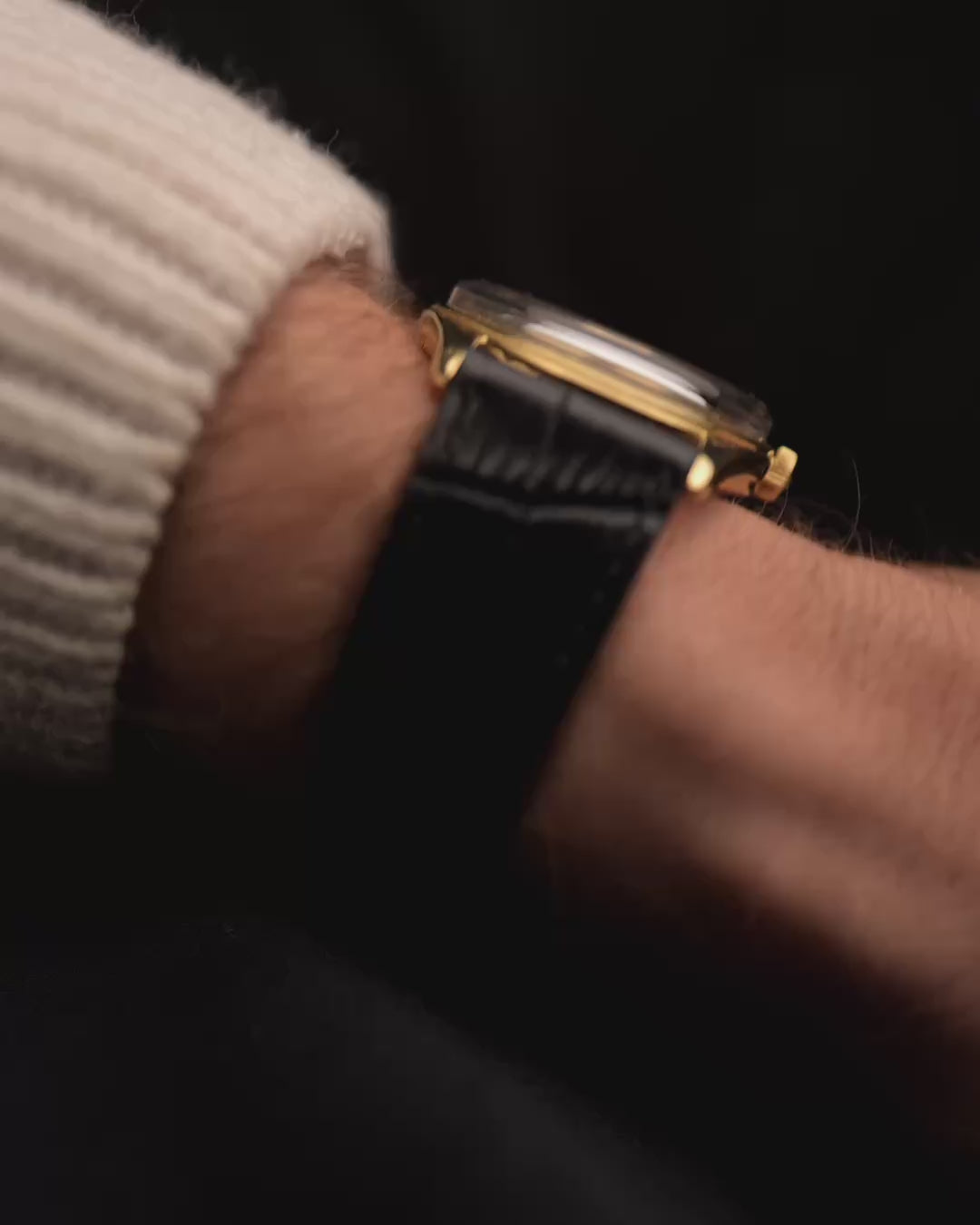 Crafted in 18k yellow gold, the case measures a generous 36mm, offering a perfect vintage proportion with contemporary wearability. The clean silver dial with gold hour markers and stick handset is a masterclass in minimalism, allowing the exquisite lines of the case to take center stage.