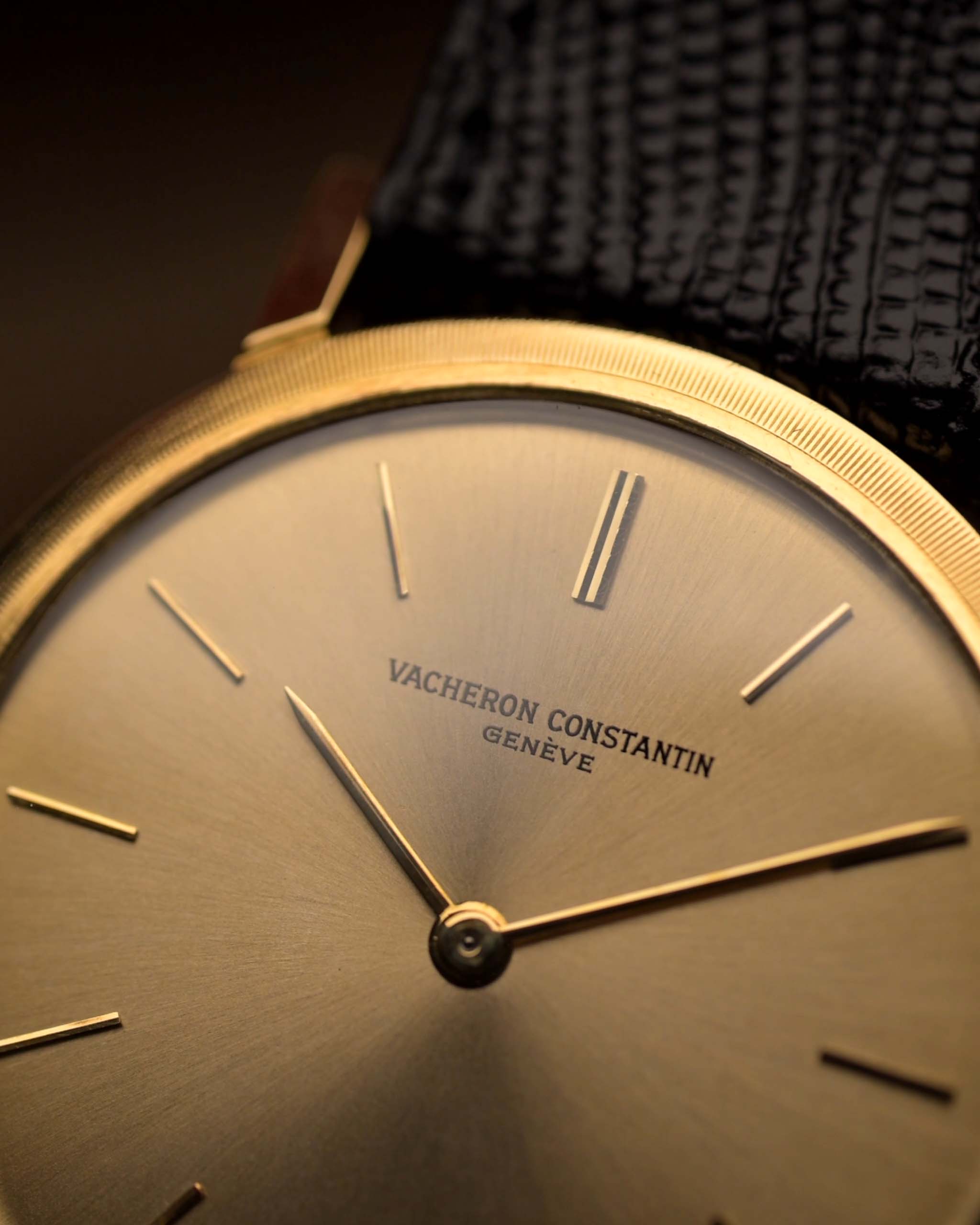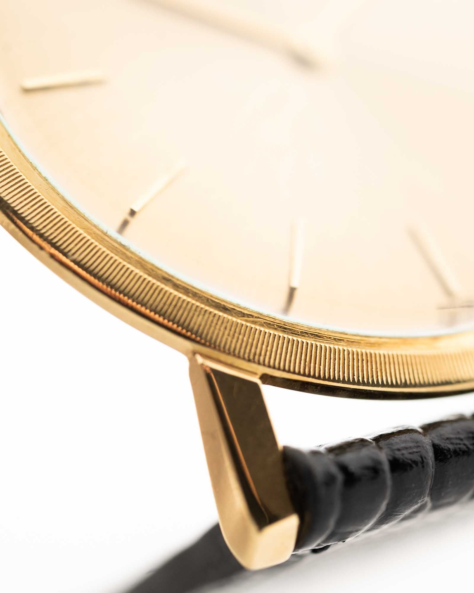 ساعة فاخرة من مجموعة Patrimony من Vacheron Constantin تعود إلى ستينيات القرن الماضي، تتميز بعلبة رفيعة للغاية من الذهب الأصفر عيار 18 قيراط وإطار أنيق بلمسة نهائية على شكل عملة معدنية. يتميز الميناء الذهبي المزخرف بنمط أشعة الشمس والمحفوظ بشكل جميل بعقارب ومؤشرات ساعات على شكل عصا، مما يخلق تباينًا دقيقًا ولكنه ملفت للنظر يجسد الرقي الذي ساد منتصف القرن.