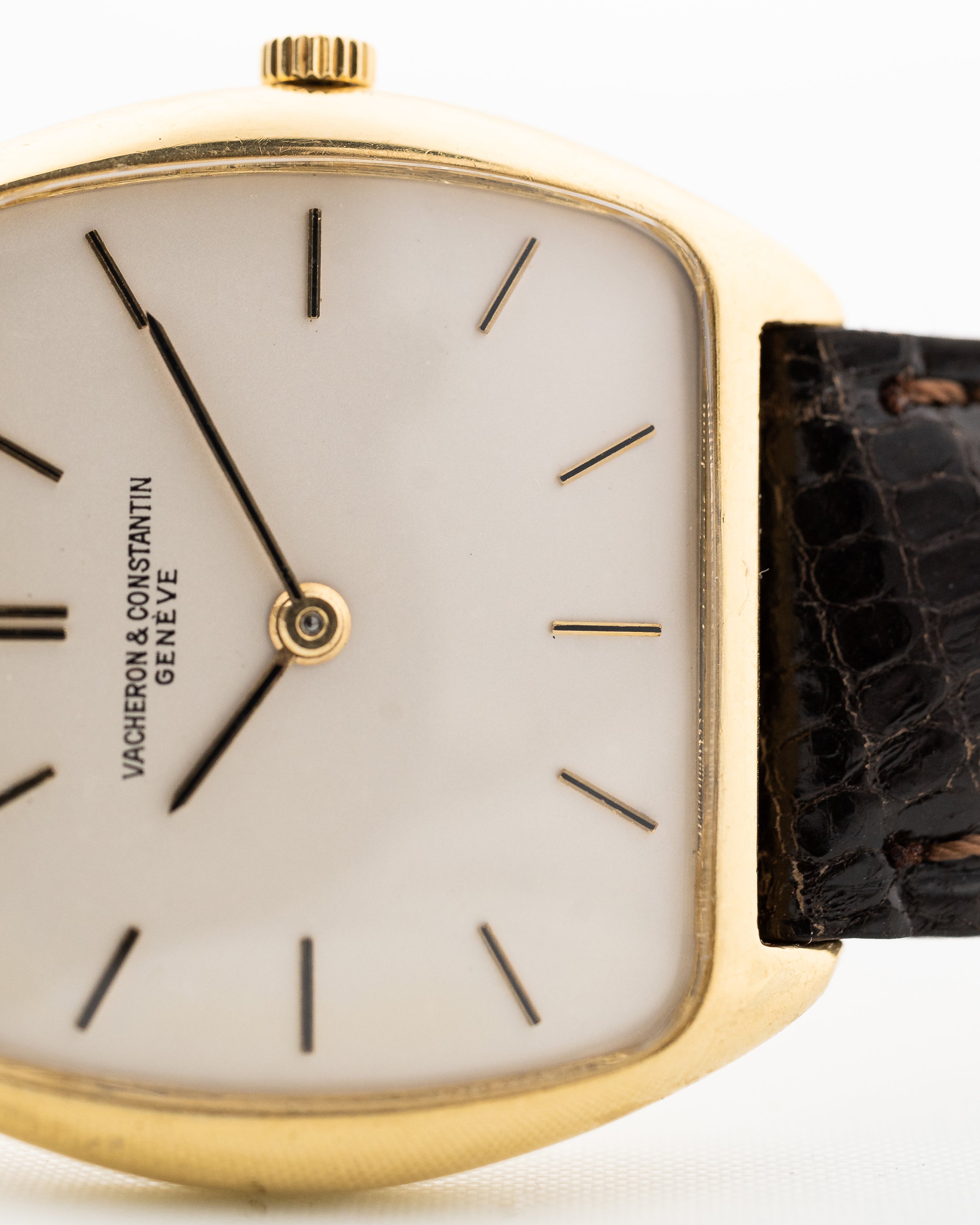 لدينا هنا ساعة فساتين ڤاشرون كونستانتين من الذهب الأصفر عيار ١٨ قيراطًا من الذهب الأصفر عيار ١٨ قيراطًا من سبعينيات القرن العشرين. وتتميز هذه القطعة بالذات بميناها الأبيض الجميل وعلبتها القوية غير المصقولة من الذهب الأصفر عيار 18 قيراطًا وعلامات ساعات وعقارب من الأونيكس.