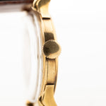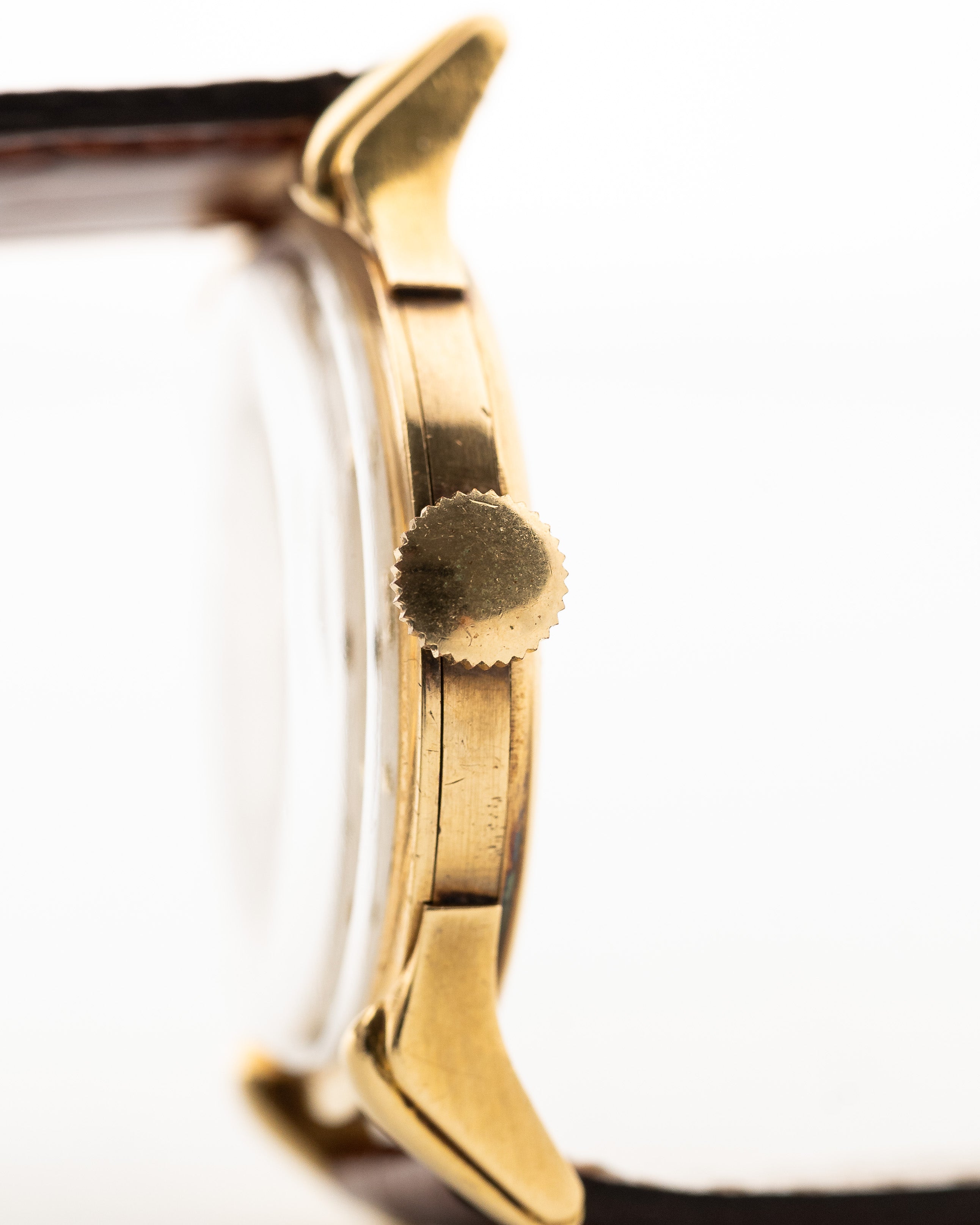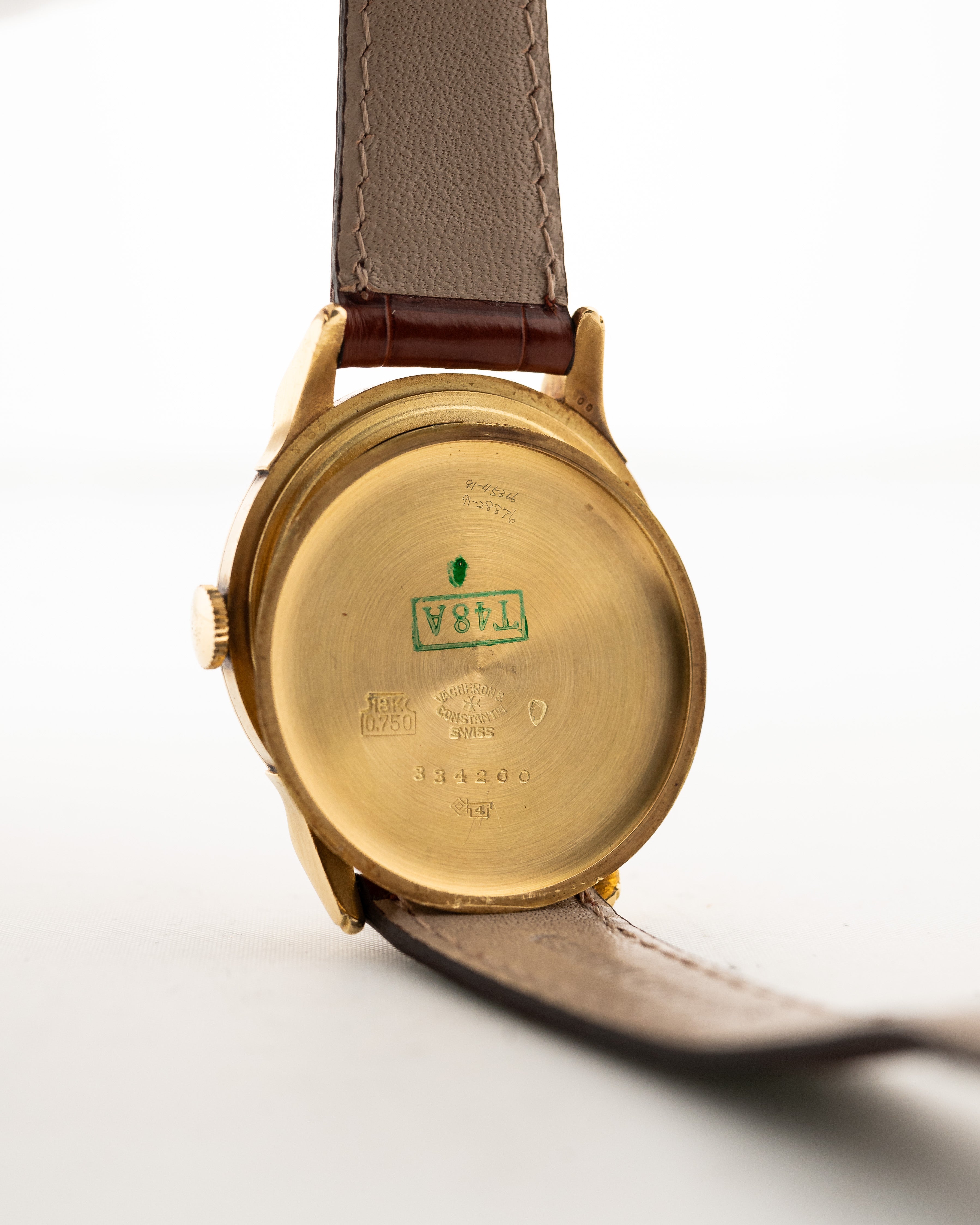 لدينا هنا مثال جميل لساعة ڤاشرون كونستانتين من الذهب الأصفر عيار ٣٦ مم عيار ١٨ قيراطًا من الذهب الأصفر عيار ١٨ قيراطًا من جيرلاخ غراسهوبر من خمسينيات القرن الماضي.
