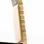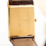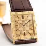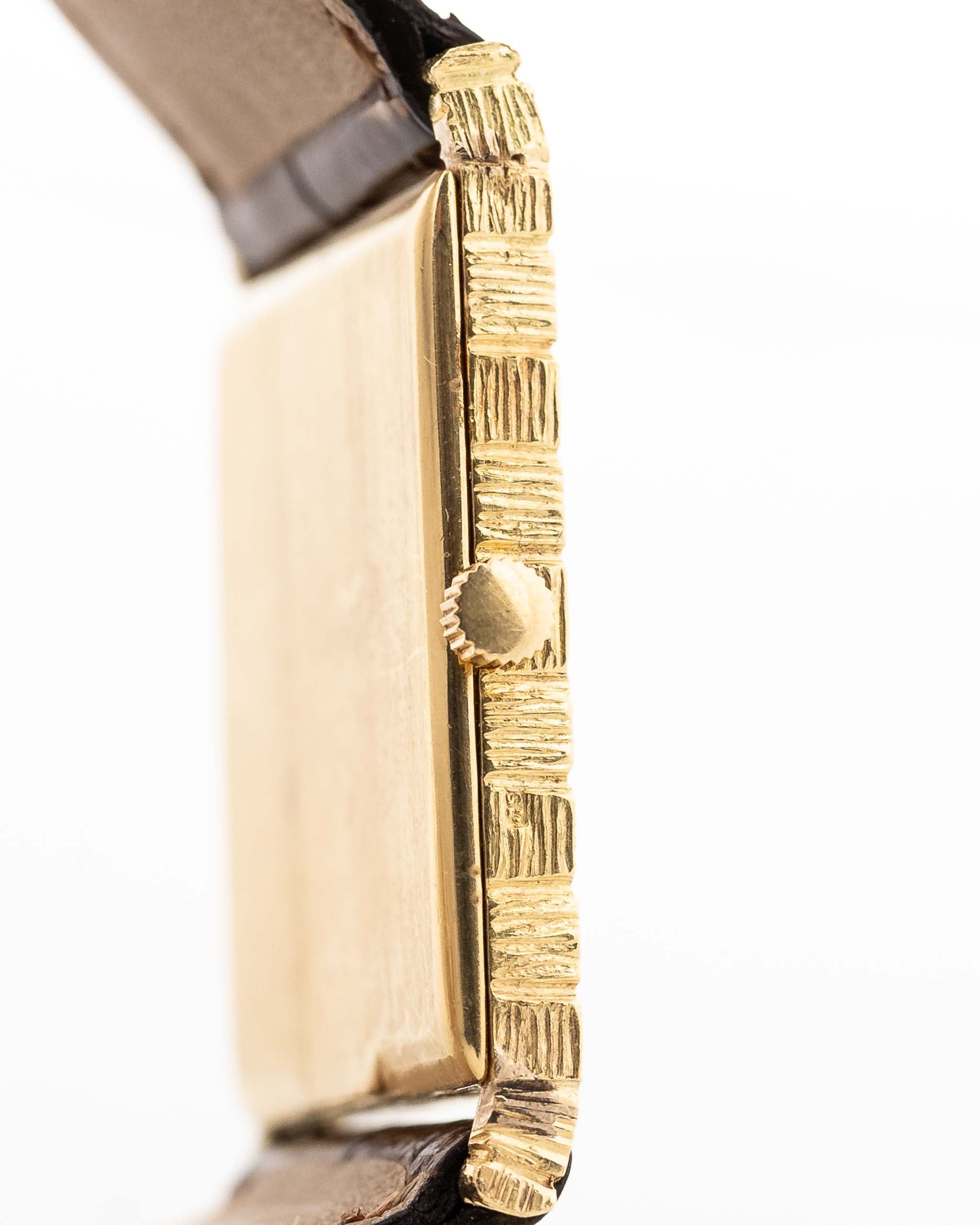 لدينا هنا ساعة فساتين ڤاشرون كونستانتين من الذهب الأصفر عيار ١٨ قيراطًا من الذهب الأصفر عيار ١٨ قيراطًا بتصميم مستطيل الشكل من سبعينيات القرن الماضي. وتتميز هذه القطعة بالذات بتشطيباتها المثقوبة على شكل سلة مثقوبة بالكامل، وهو ما نراه للمرة الأولى. إنها ساعة رائدة حقيقية للحرفية السويسرية في السبعينيات.