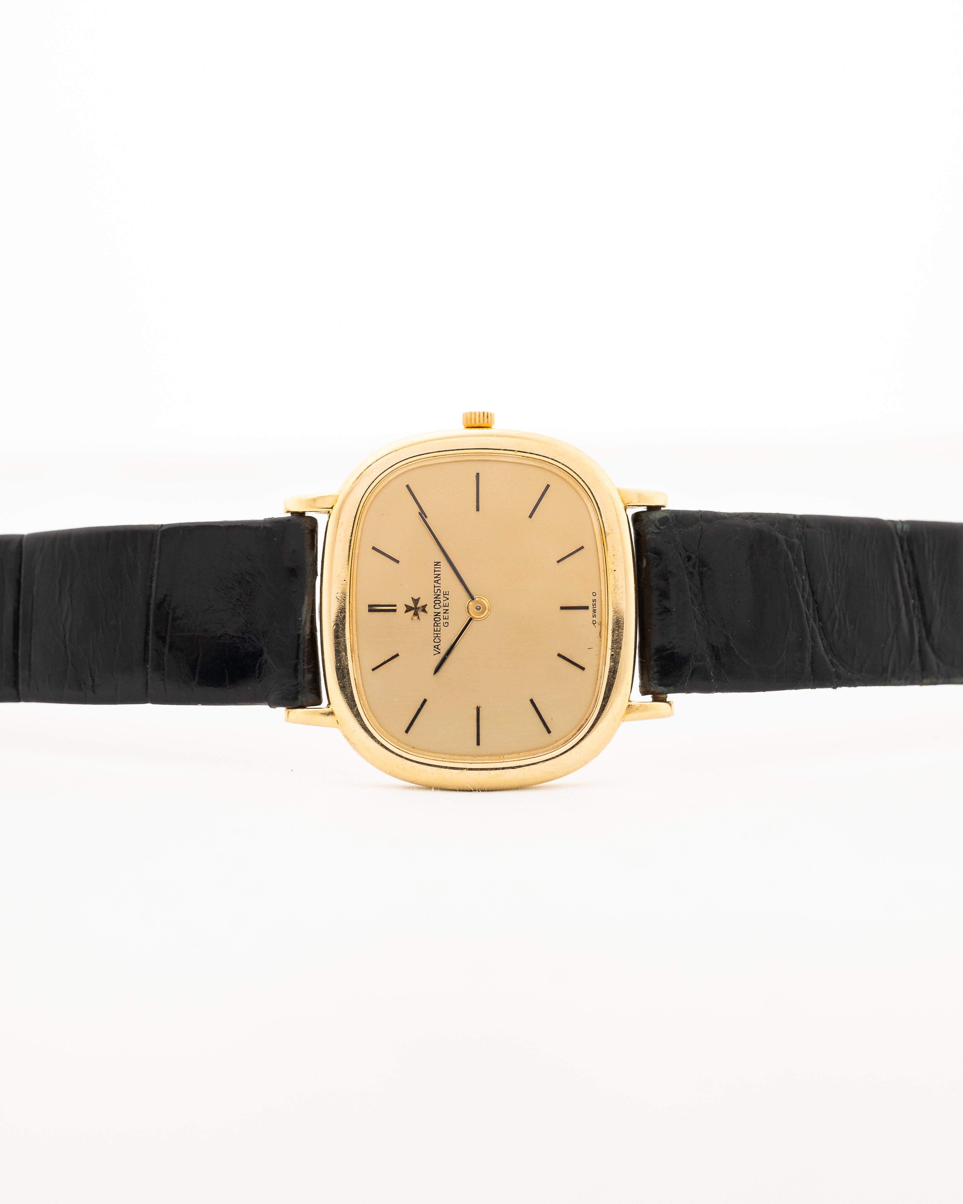 لدينا هنا ساعة فساتين ڤاشرون كونستانتين من الذهب الأصفر عيار ١٨ قيراطًا بتصميم دبابة من السبعينيات. وتتميّز هذه القطعة بالذات بمينا سيغما الجميل عيار ١٨ قيراطًا وشعار ڤاشرون المطبوع عليها وعلبة قوية من الذهب الأصفر عيار ١٨ قيراطًا وعقارب ذات طبقات من العقيق اليماني وعلامات للساعات. وتأتي مع حزام فاشرون الجلدي الأصلي وإبزيم VC من الذهب الأصفر عيار 18 قيراطًا.