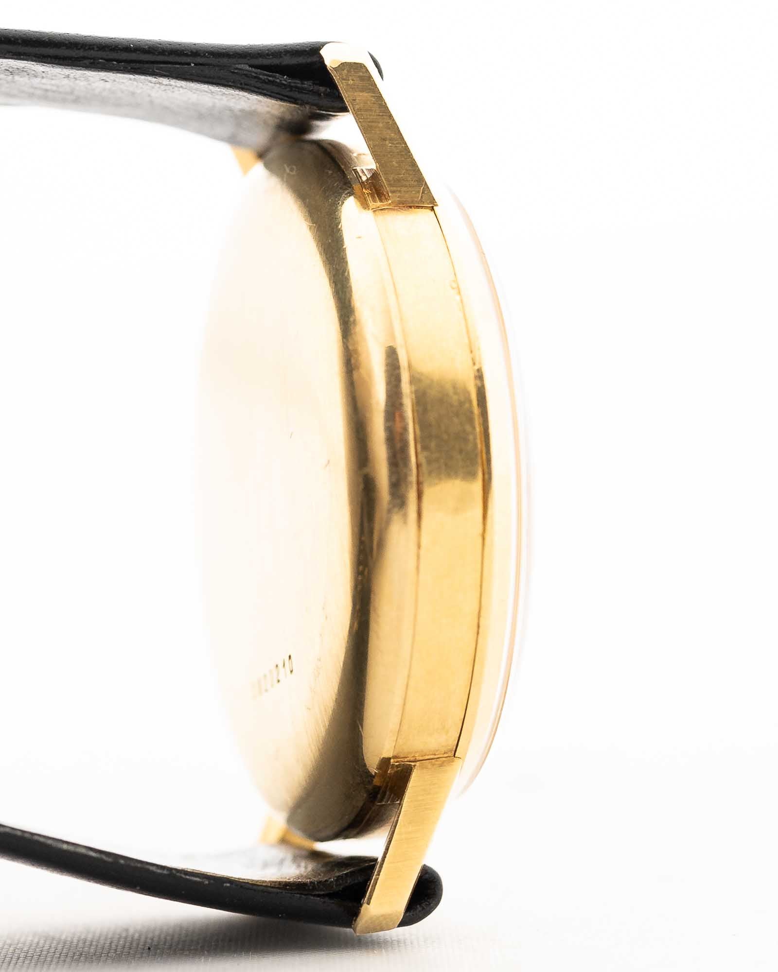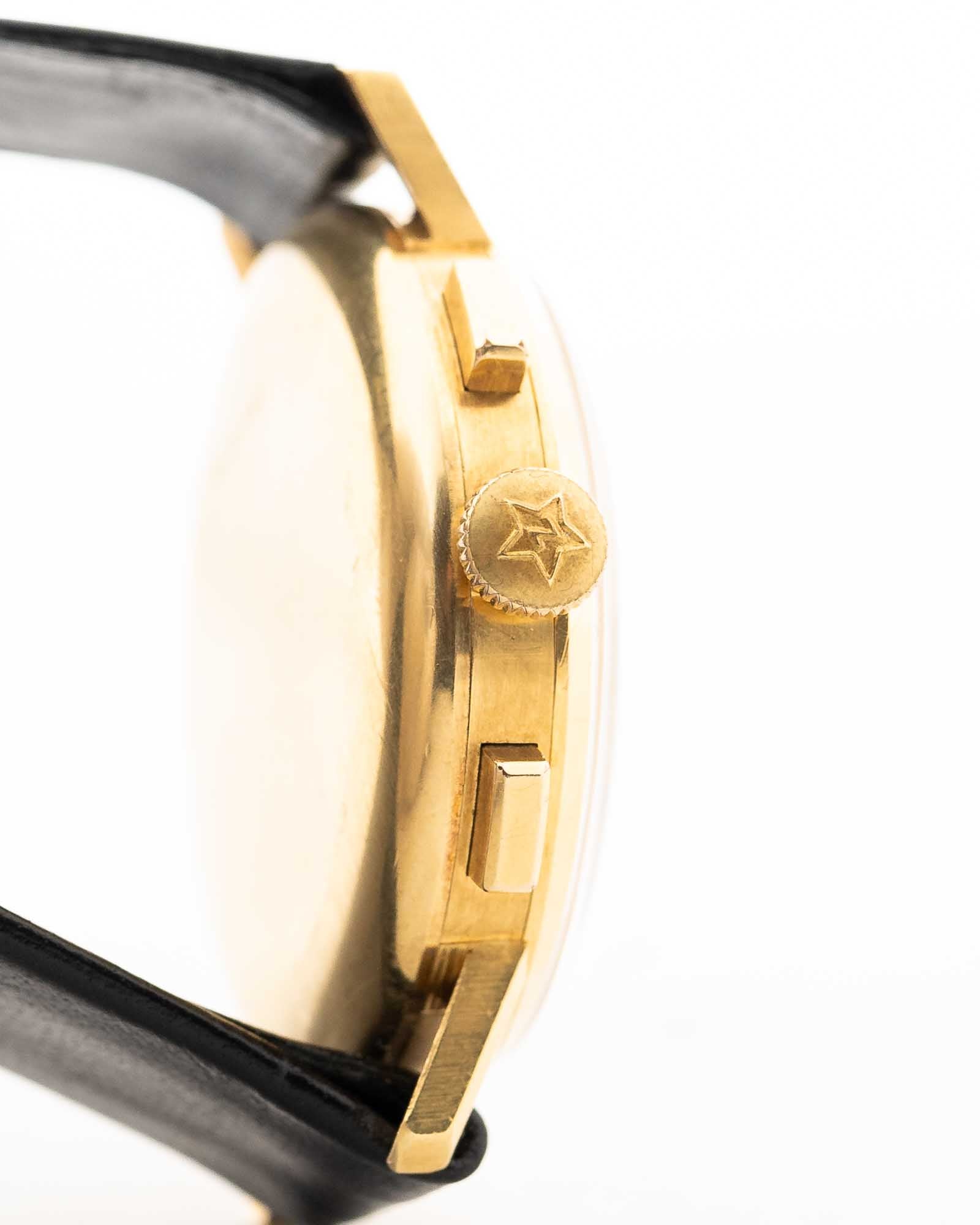 قبل أن تُحدث زنيت ثورة في صناعة الساعات مع ساعة El Primero، كانت تصنع بالفعل ساعات كرونوغراف من الدرجة الأولى - وهذه القطعة تثبت ذلك. تتميّز ساعة الكرونوغراف هذه من زنيت التي تعود إلى ستينيات القرن الماضي، والموضوعة في علبة دافئة من الذهب الأصفر عيار 18 قيراطًا، بالكرونوغراف عيار 146، وهي حركة يدوية الريح من صنع مارتيل الأسطوري - المعروف أيضًا بتزويده لشركة Universal Genève.