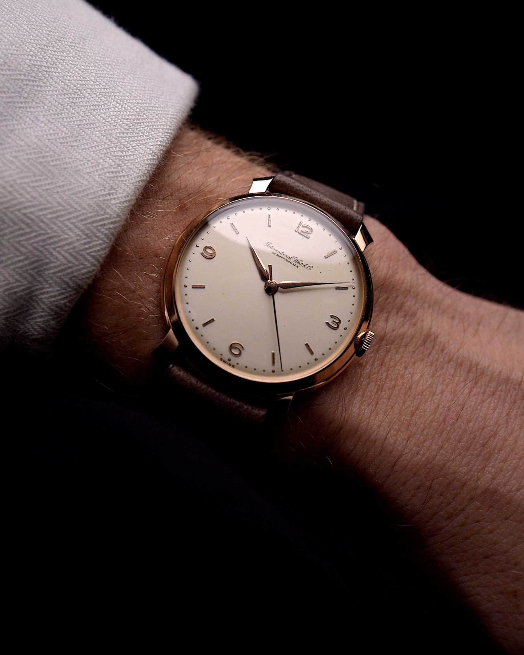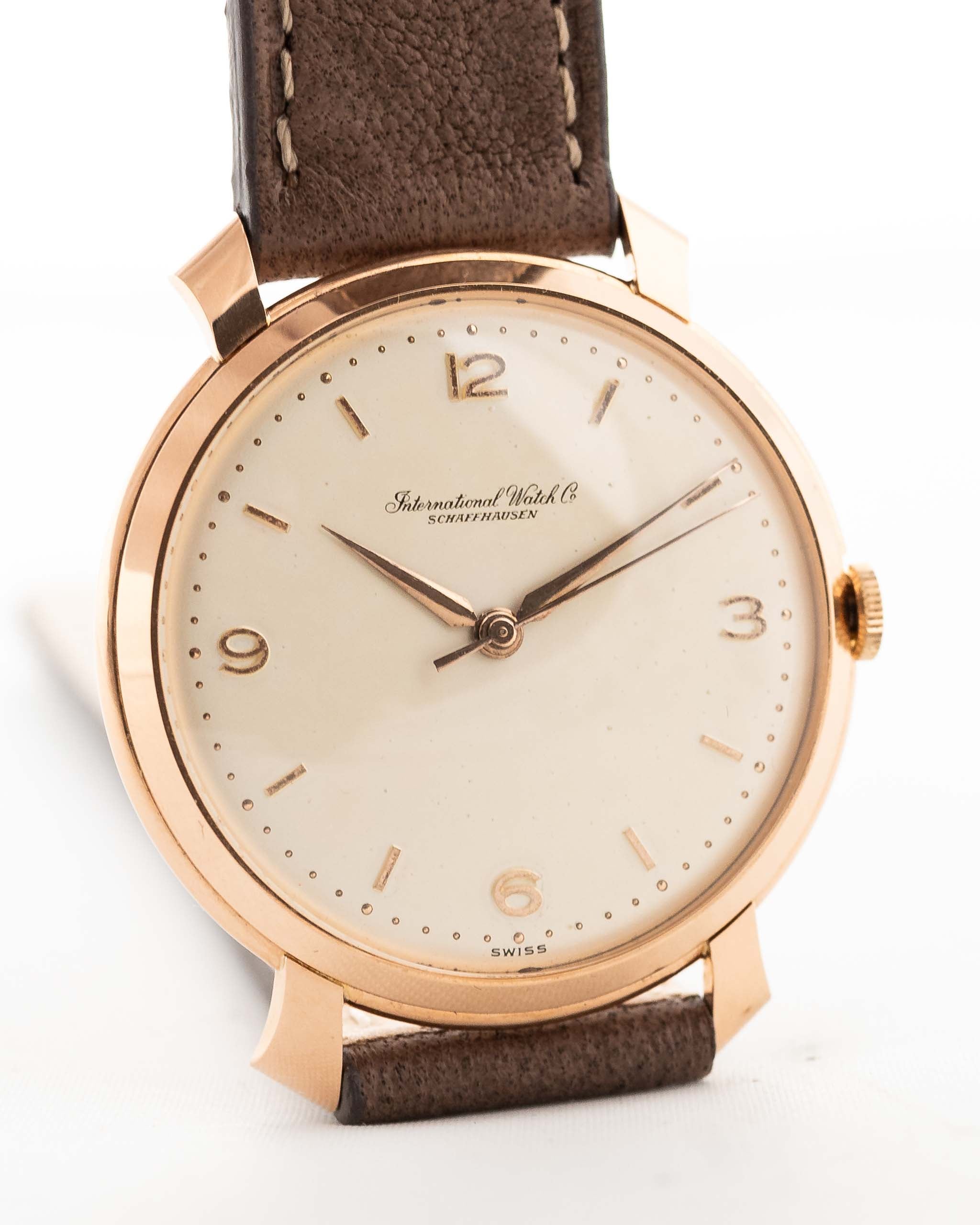 IWC has produced a very wide variety of wristwatches from an early time ranging from dress watches to aviation watches. This example, in 18k rose gold with it's white/silver dial with twelve, three, six nine layout would remain a constant in anyone's collections, especially as it comes with beautiful shark fin lugs.