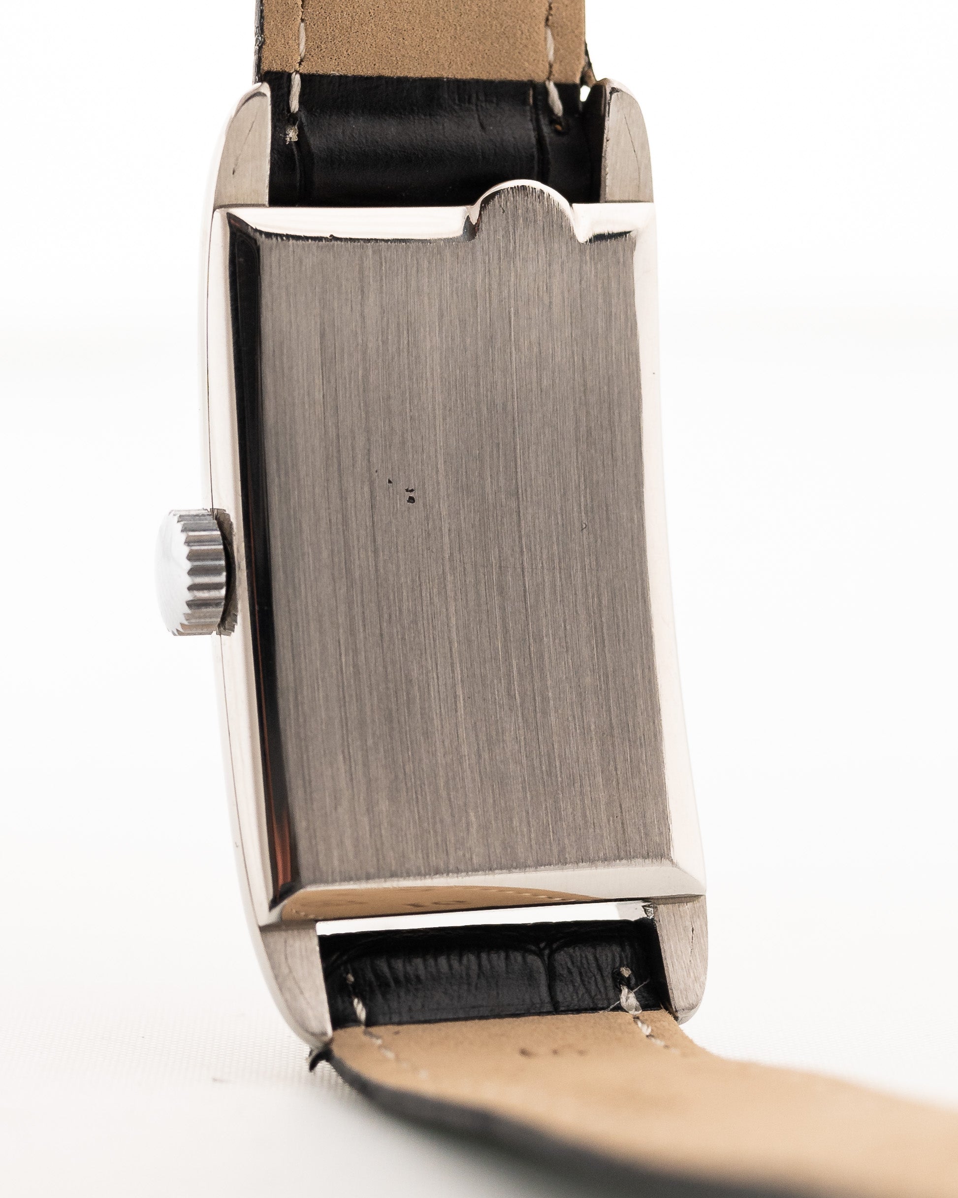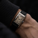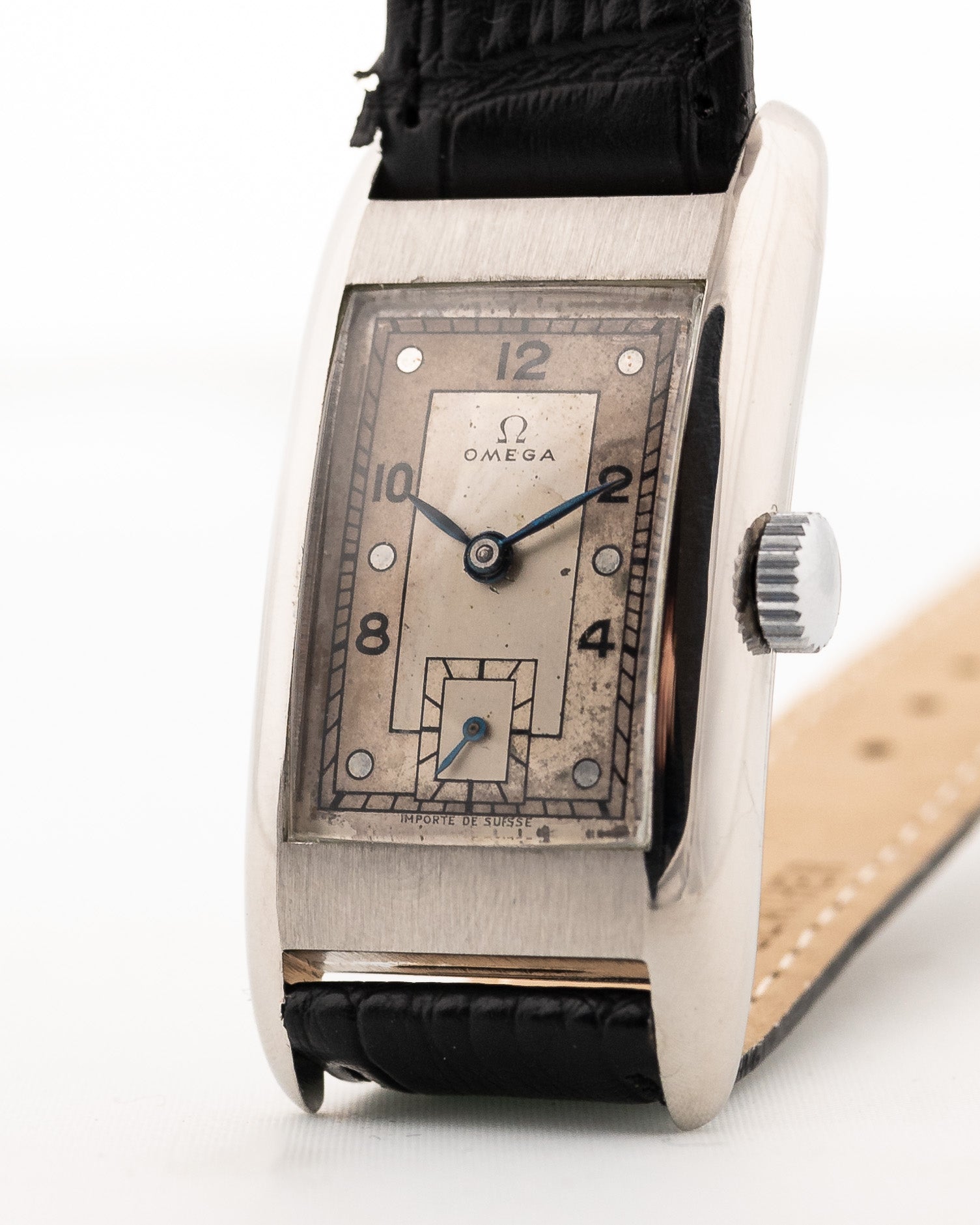 This isn't the first Omega Art Deco Dress Watch we have fallen in love with. This example features a huge rectangular steel case and is made even more attractive due to its fantastic blue leaf hands and cream colored two tone dial with Art Deco Arabic numerals and a subsidiary second and it wears bigger due to the huge lug to lug diameter.