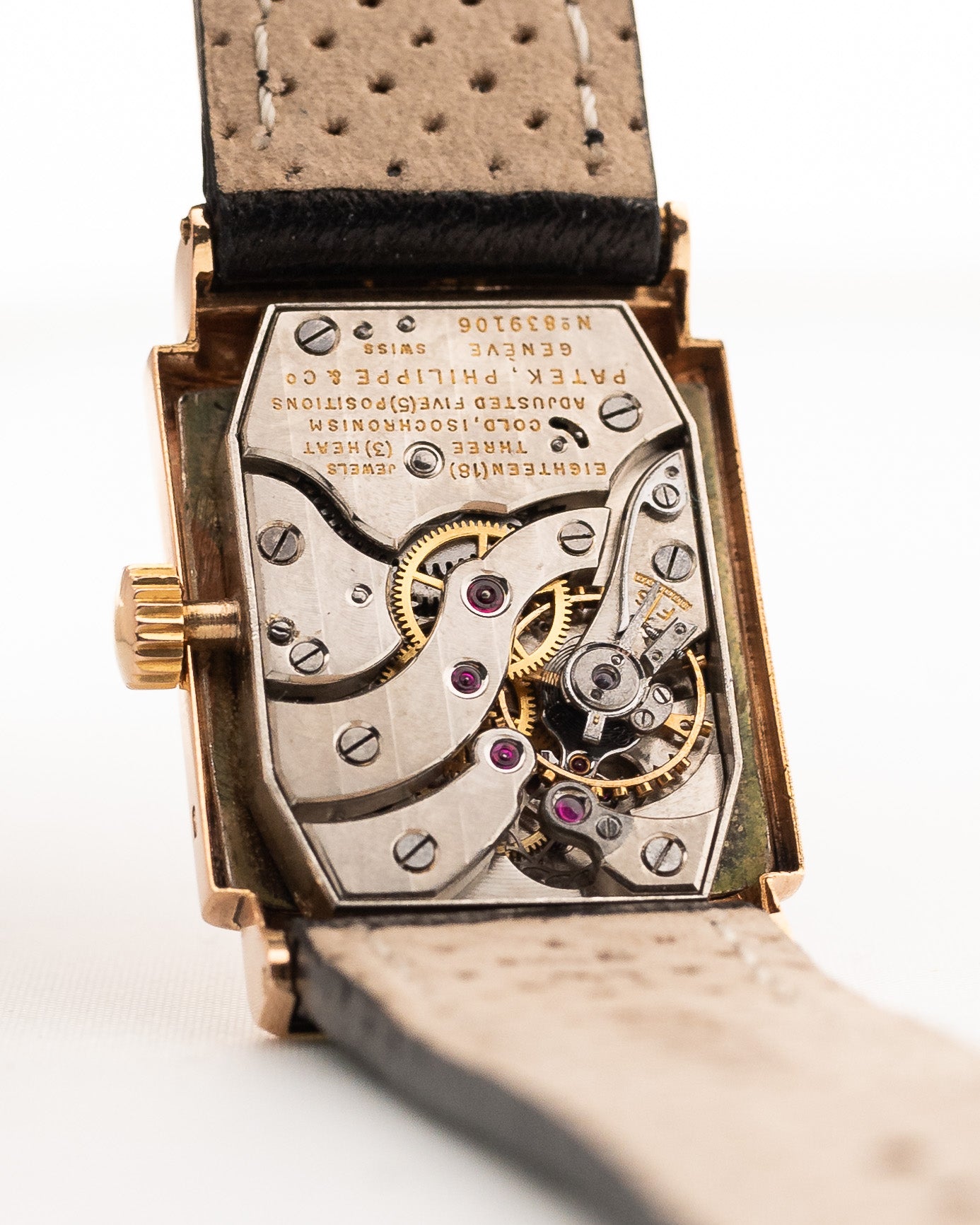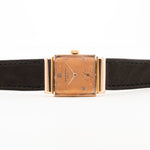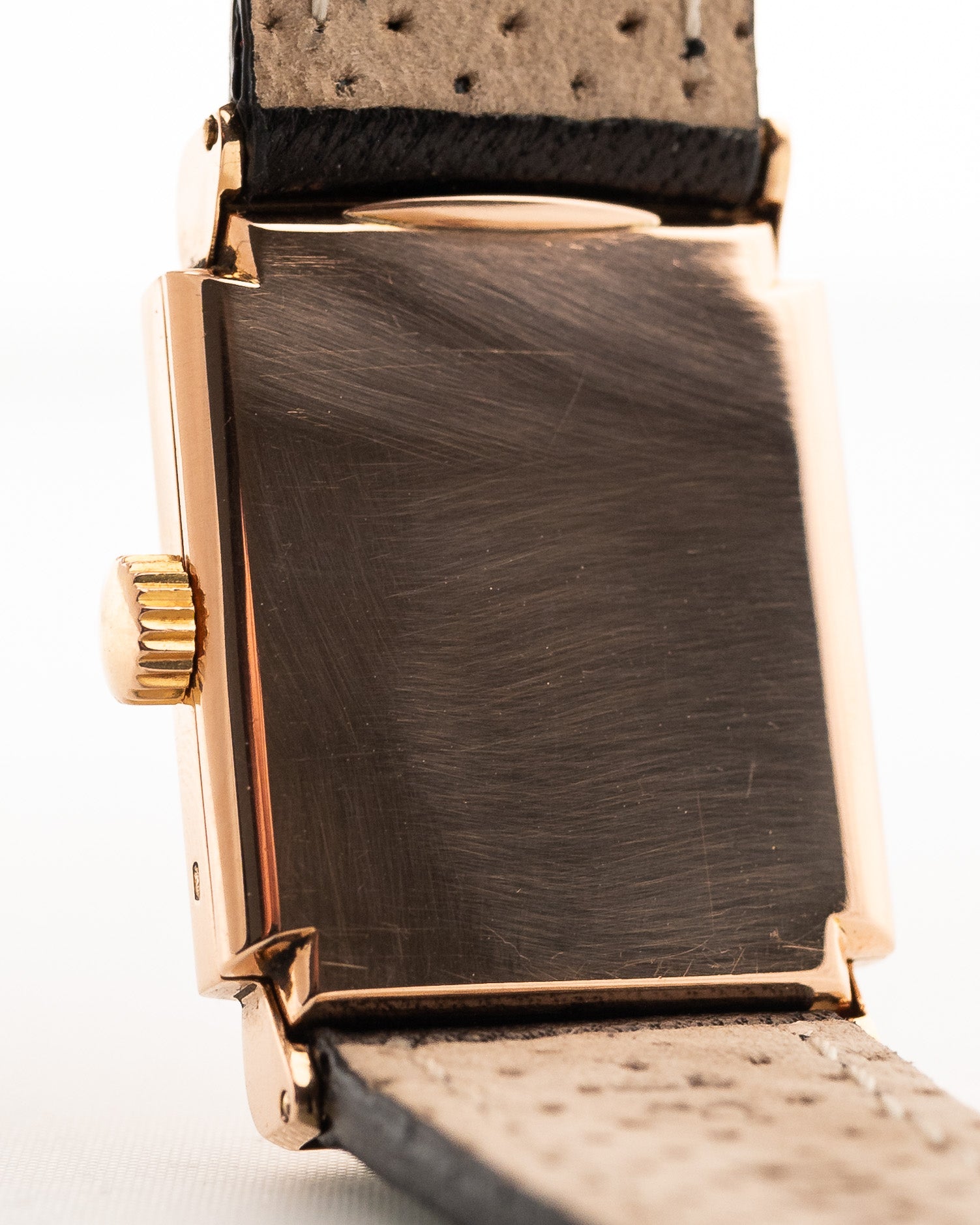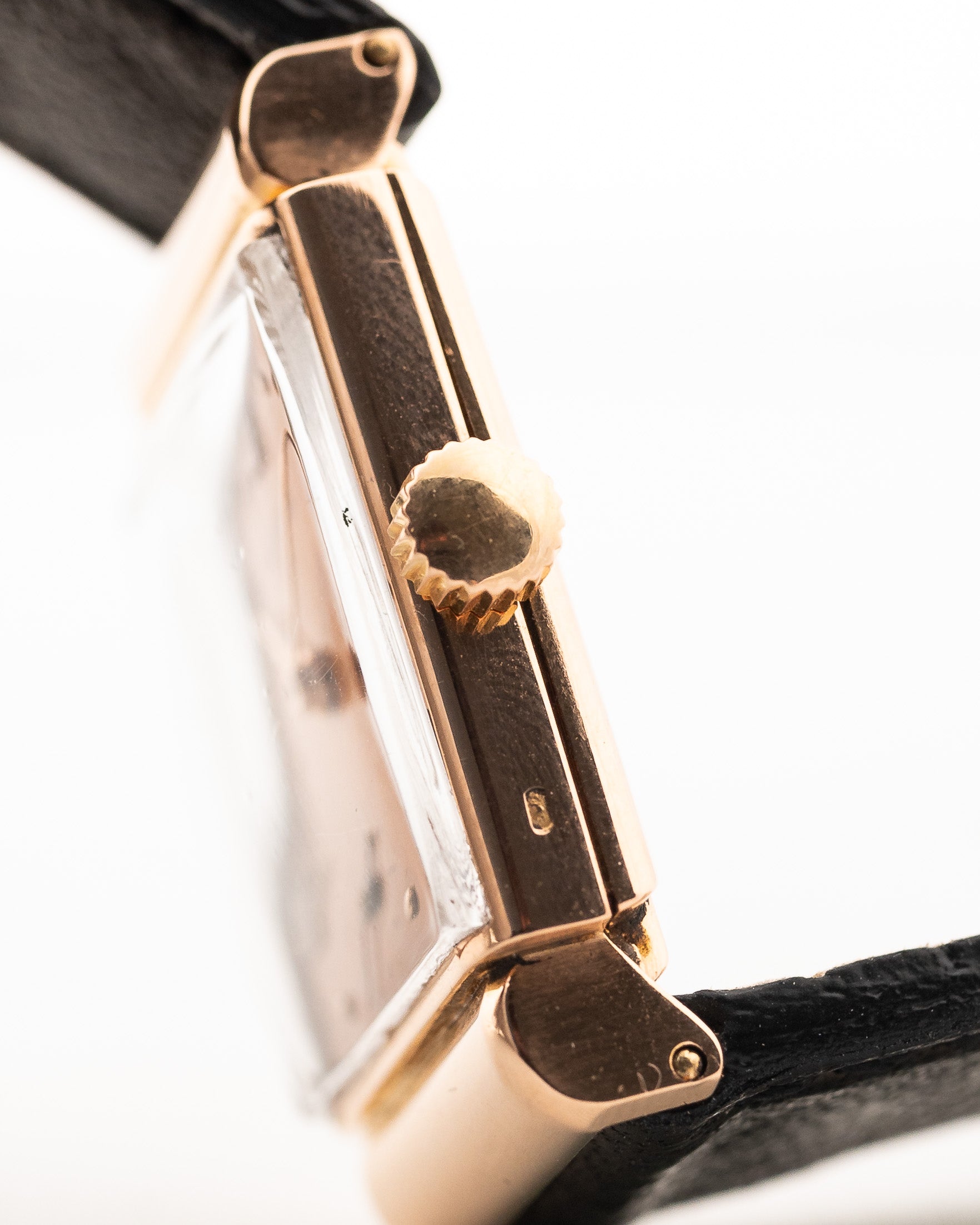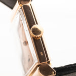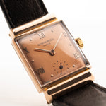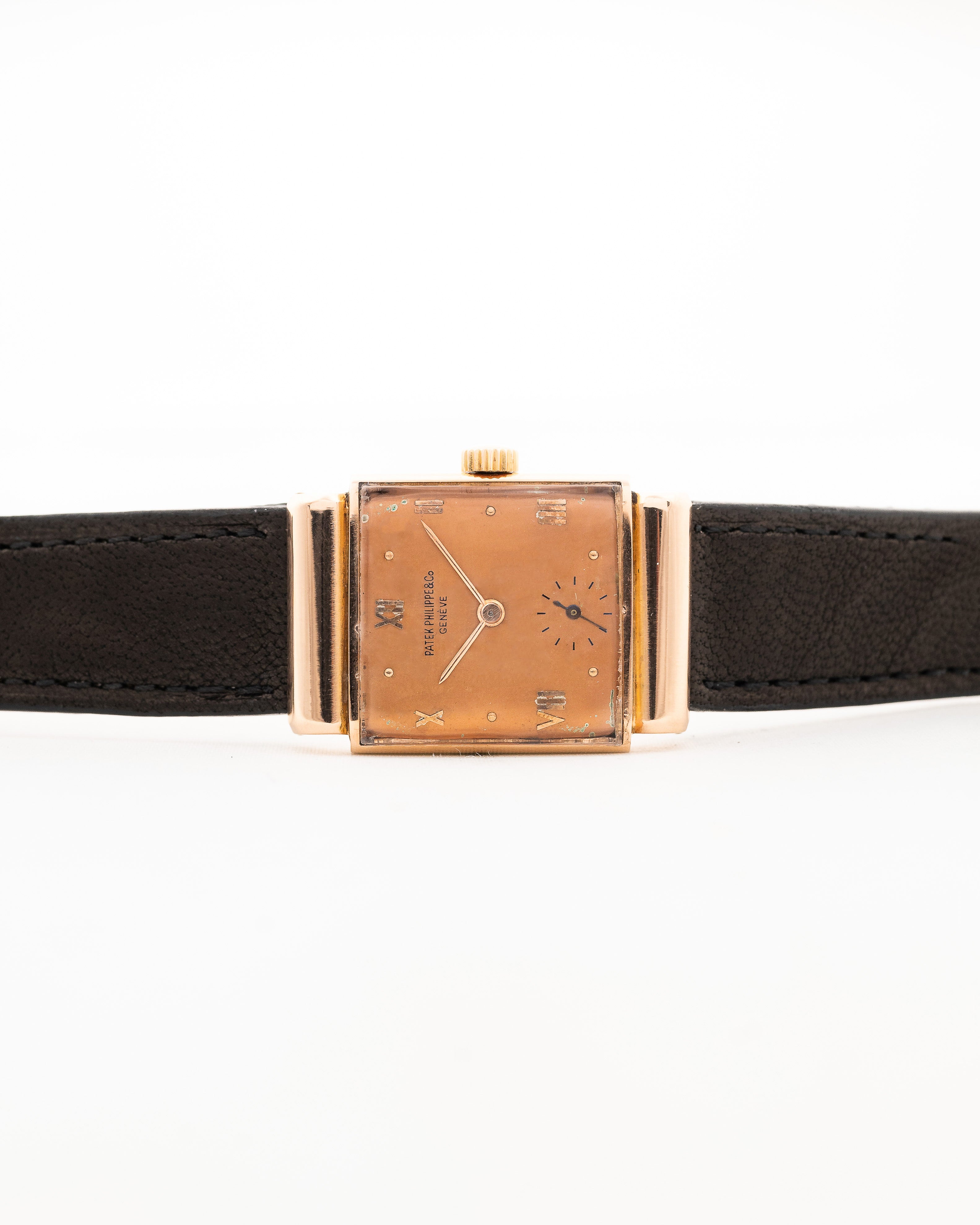 Here we have a rare, Rectangular-cased 1940s, 18k rose gold Patek Philippe with a beautiful, untouched Salmon Art Deco dial, which also has the beautiful addition of a subsidiary seconds and hooded lugs.