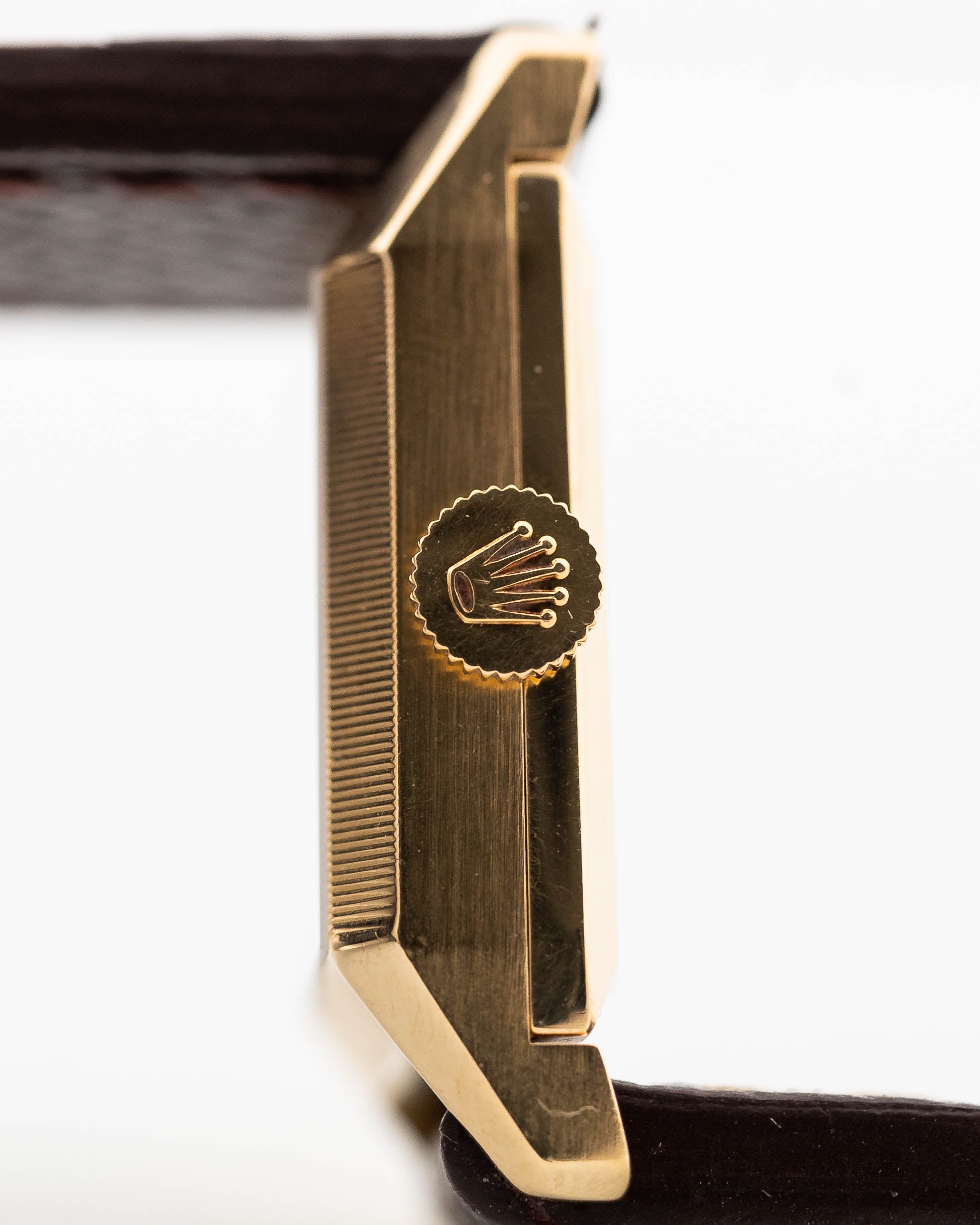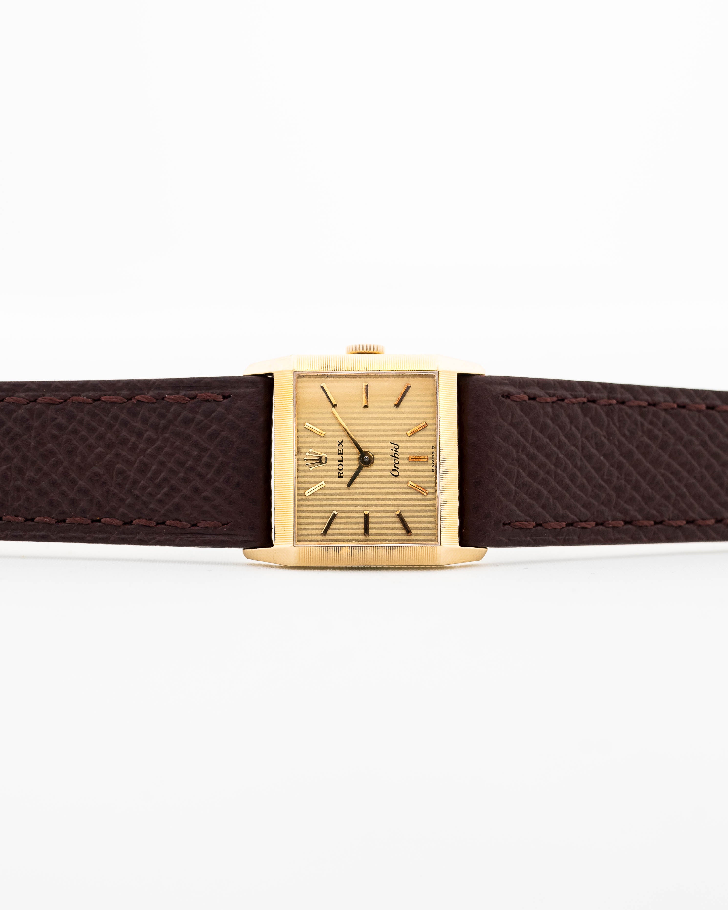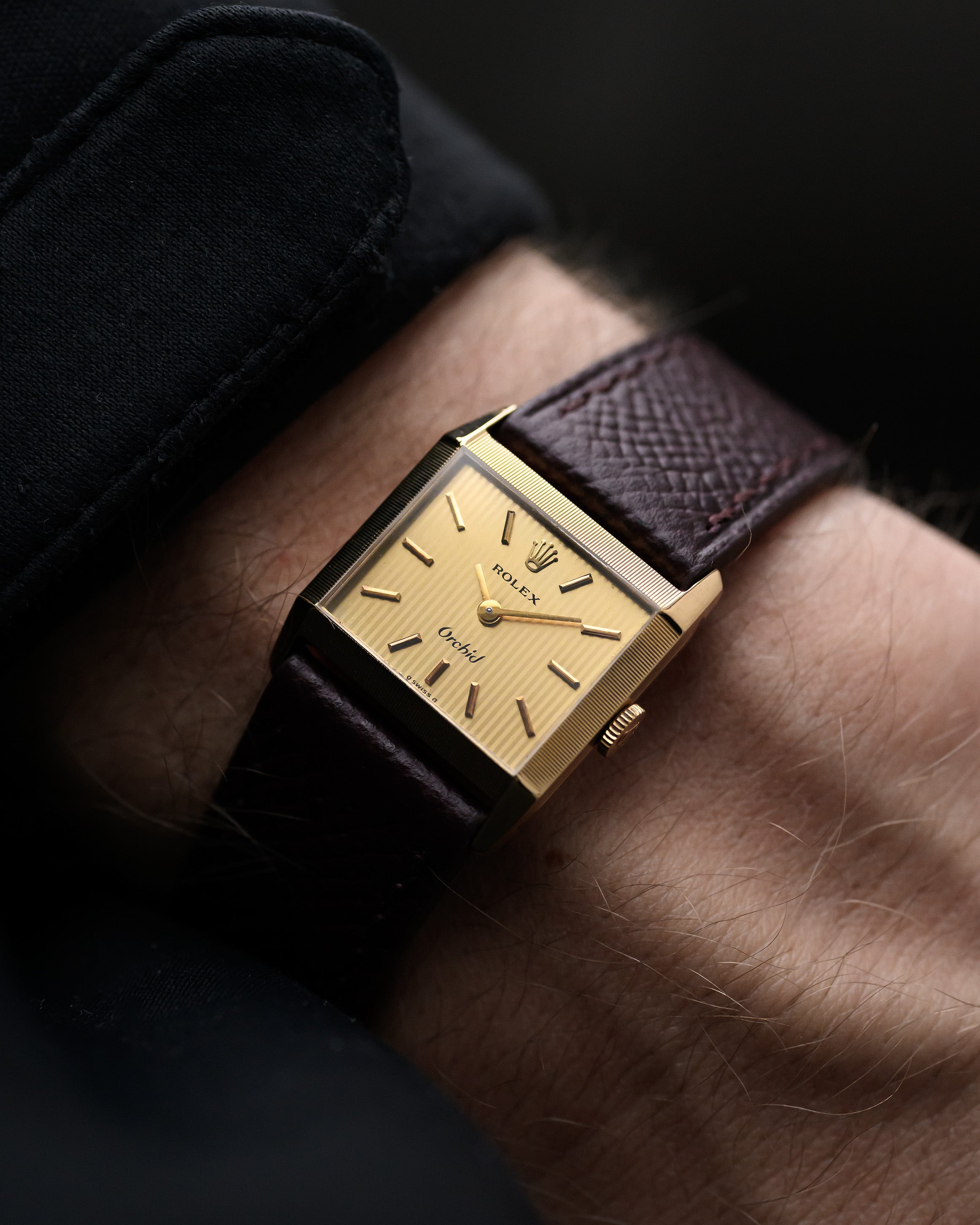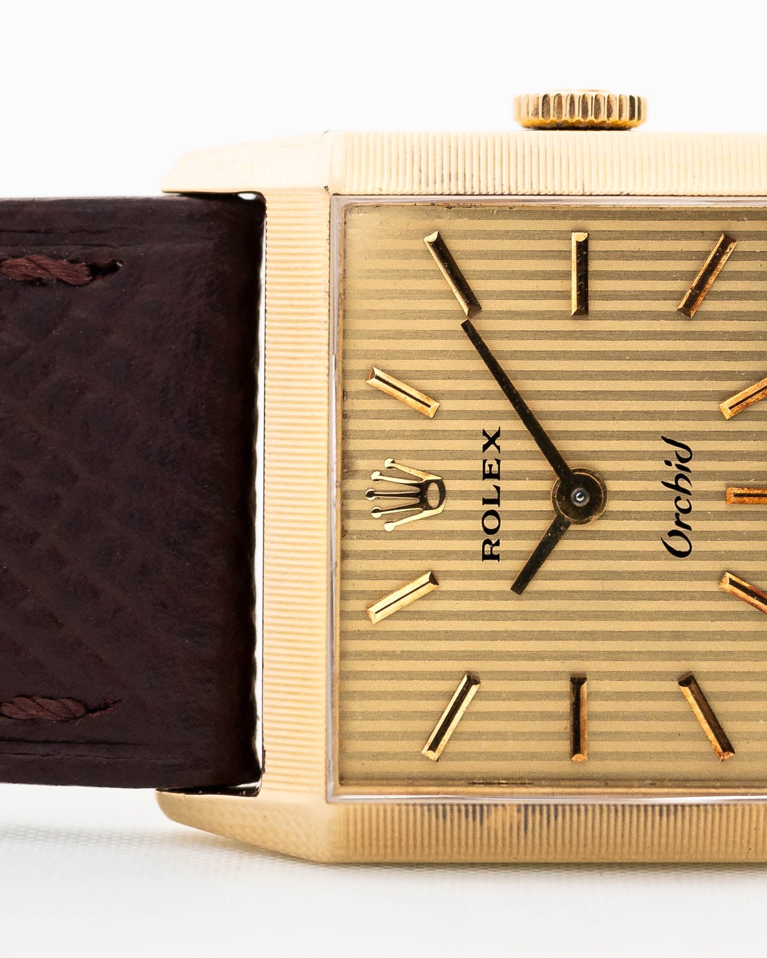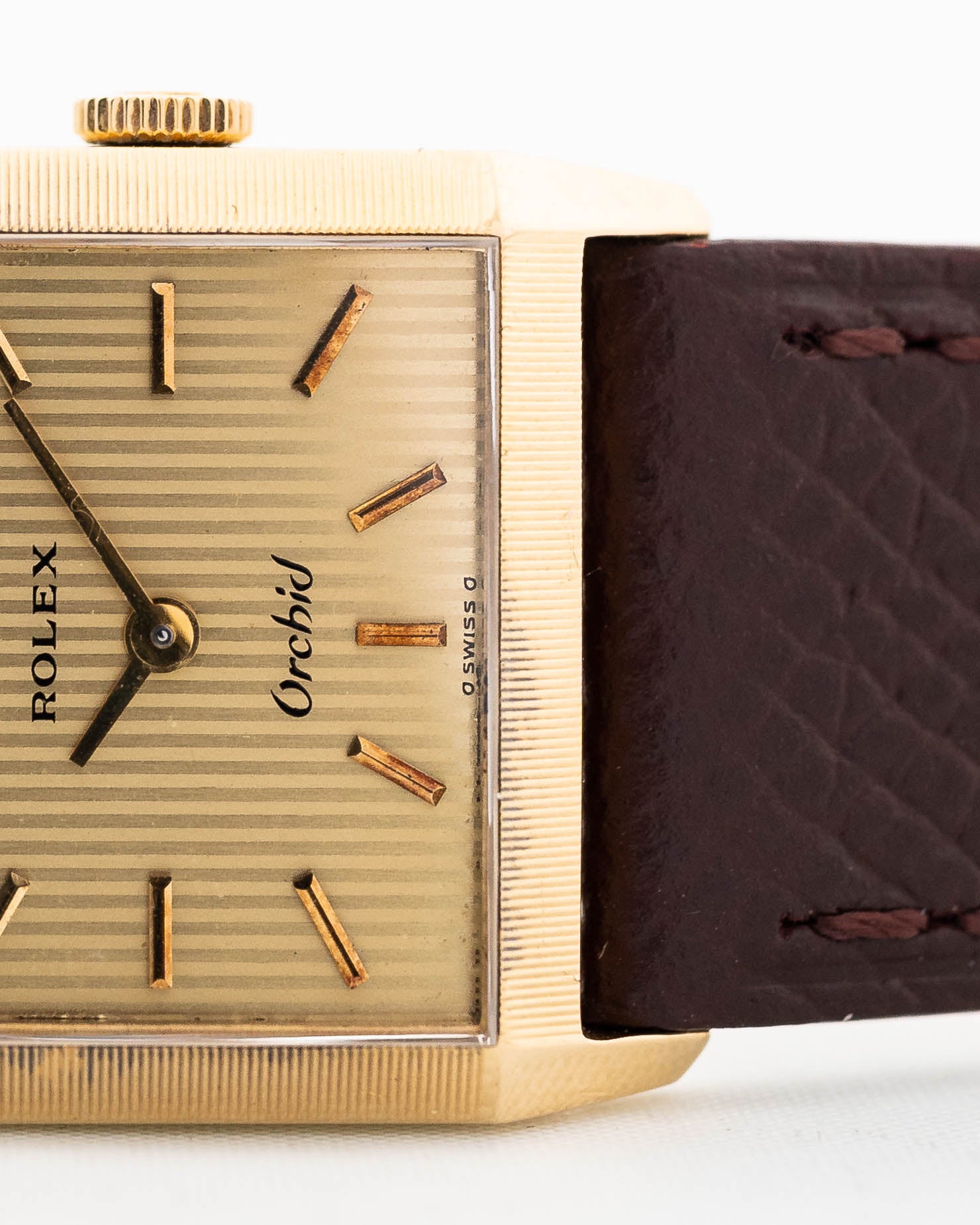 The Rolex Orchid line showcases the dressier side of Rolex compared to its more well-known sport models. This version is fitted in a 18k-yellow-gold rectangular shaped case, which is an unusual case shape for Rolex.