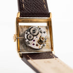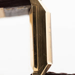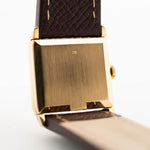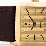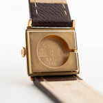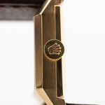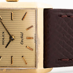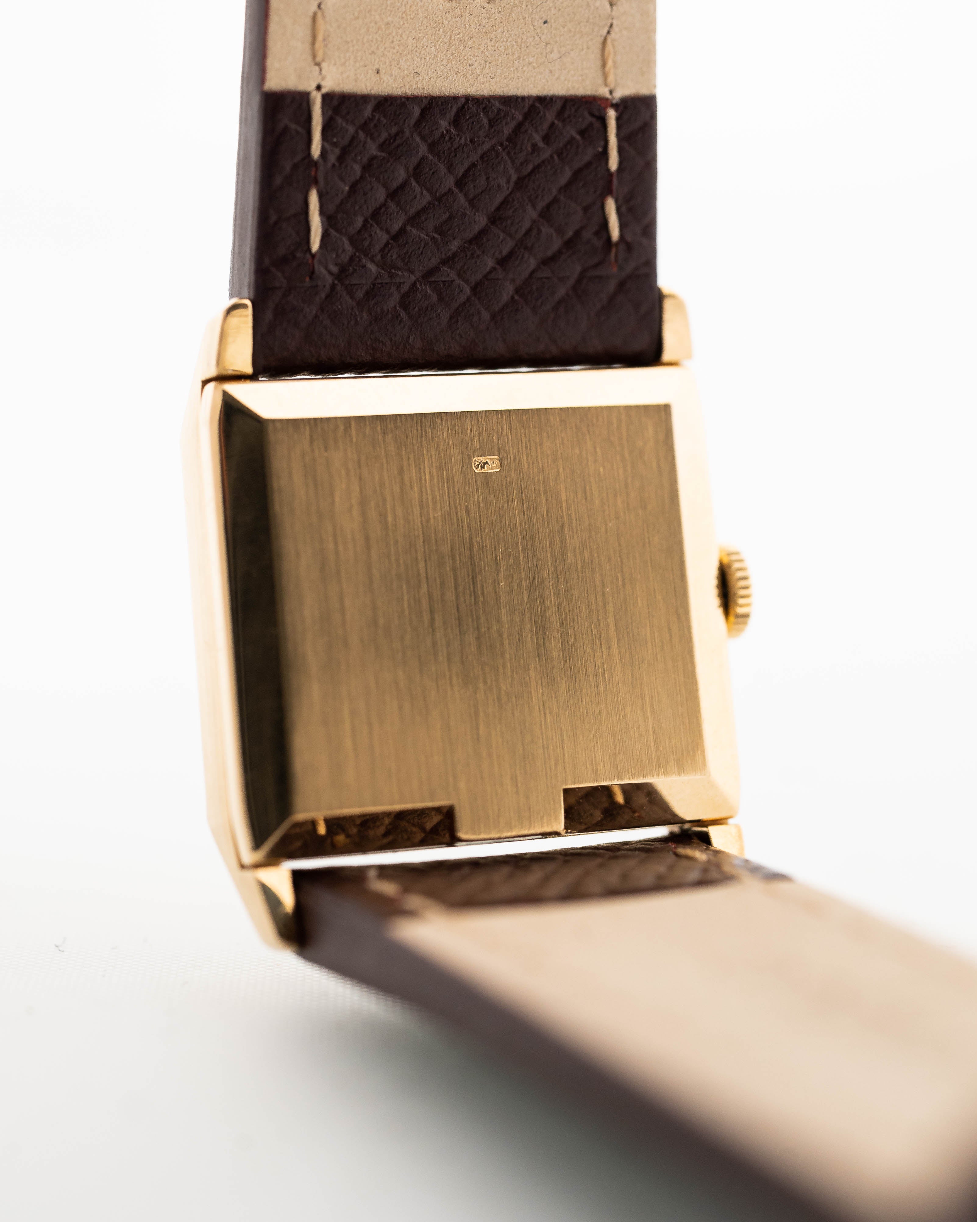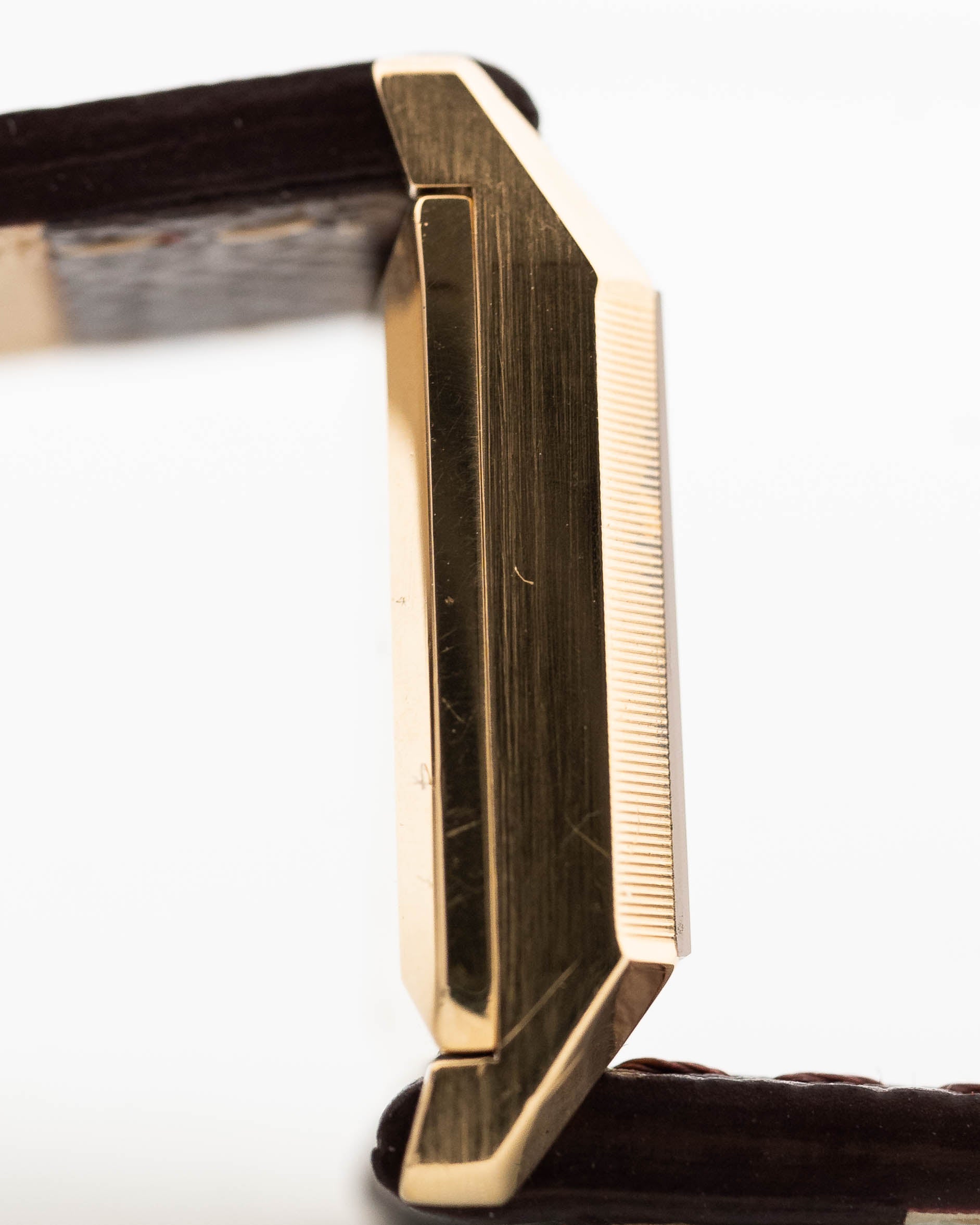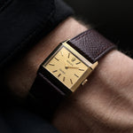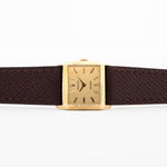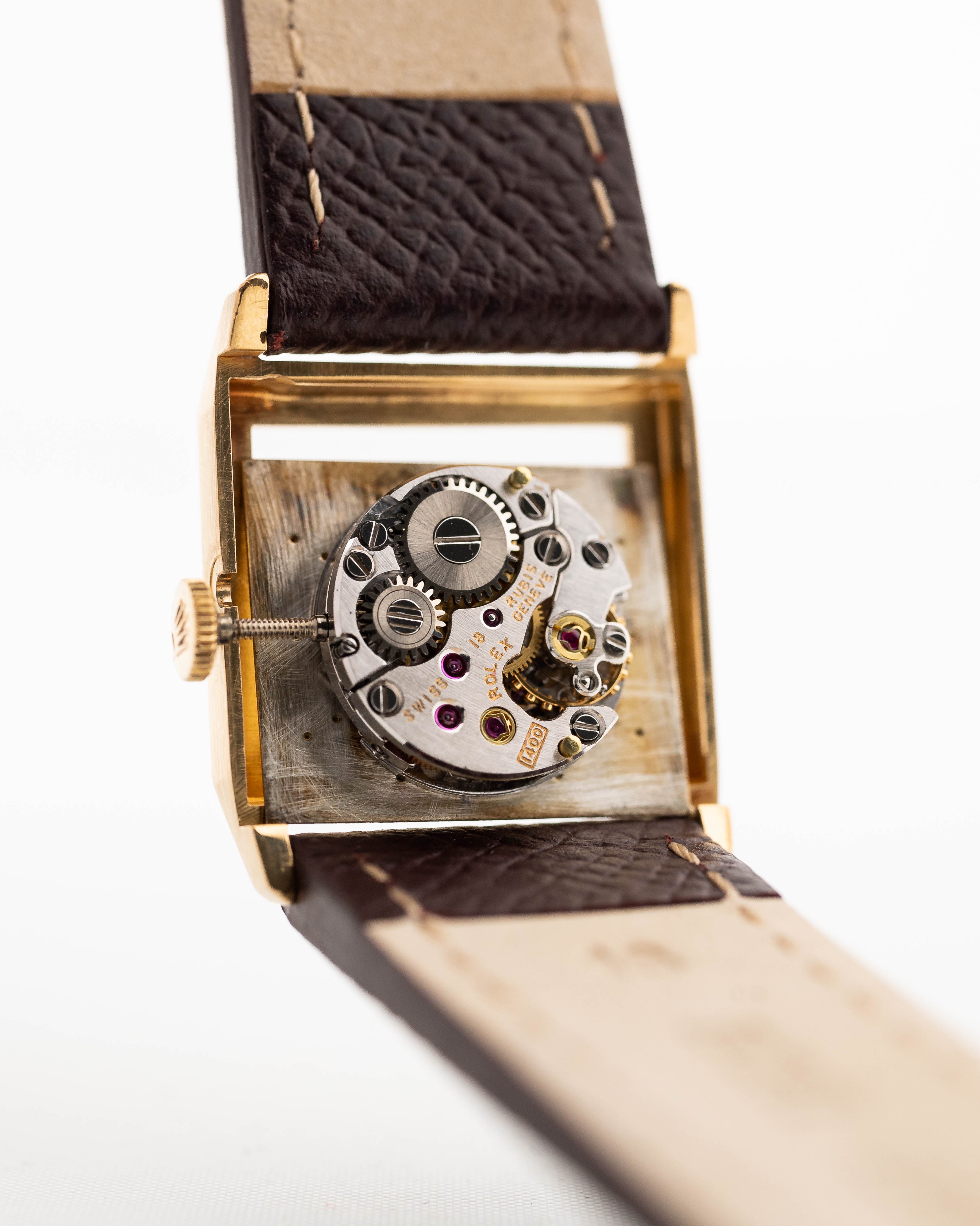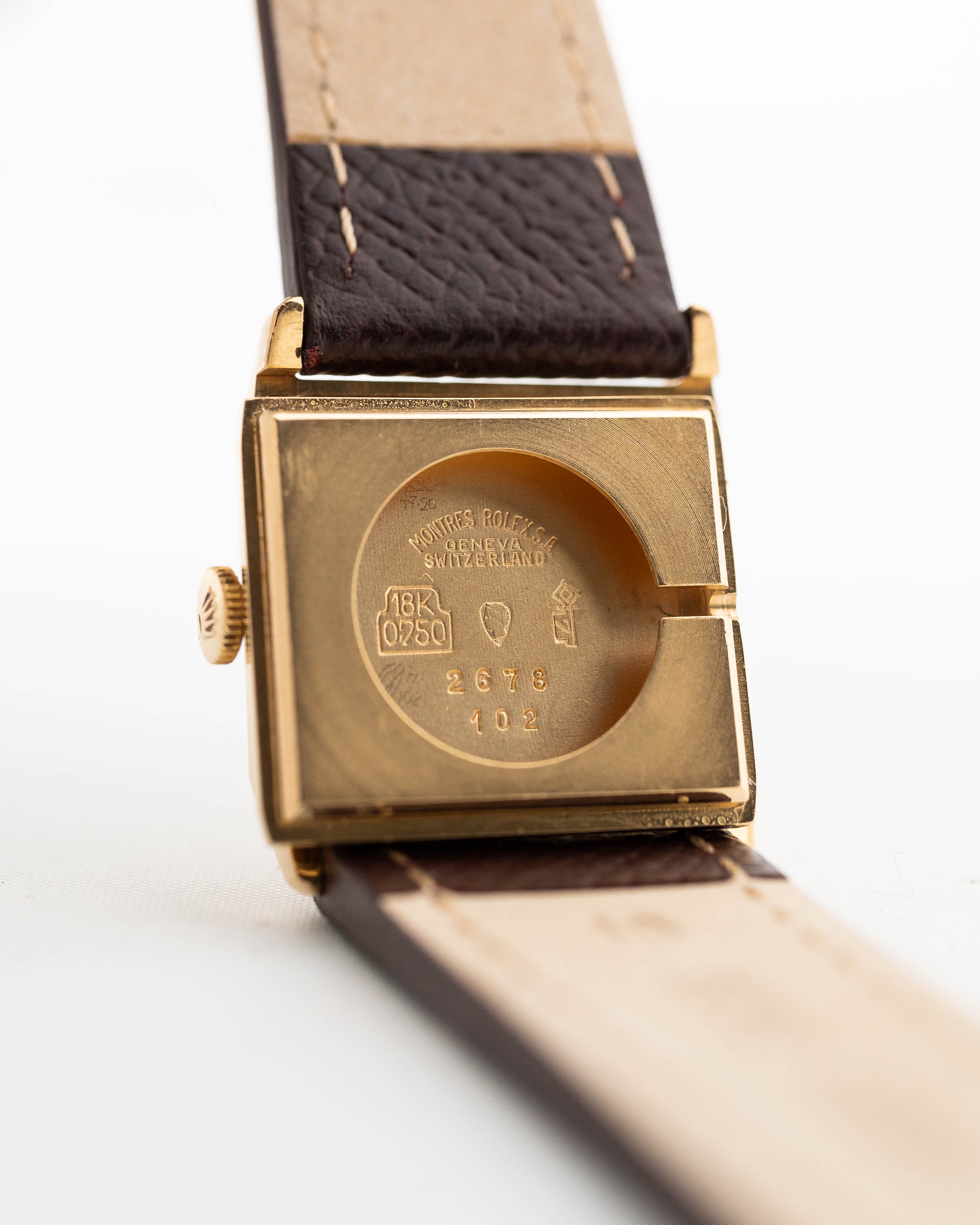 The Rolex Orchid line showcases the dressier side of Rolex compared to its more well-known sport models. This version is fitted in a 18k-yellow-gold rectangular shaped case, which is an unusual case shape for Rolex.