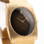 The Rolex Cellini line showcases the dressier side of Rolex compared to its more well-known sport models. This version is fitted in a 14k-yellow-gold square-shaped case with an oval passepartout look for the dial, which is an unusual shape for Rolex.