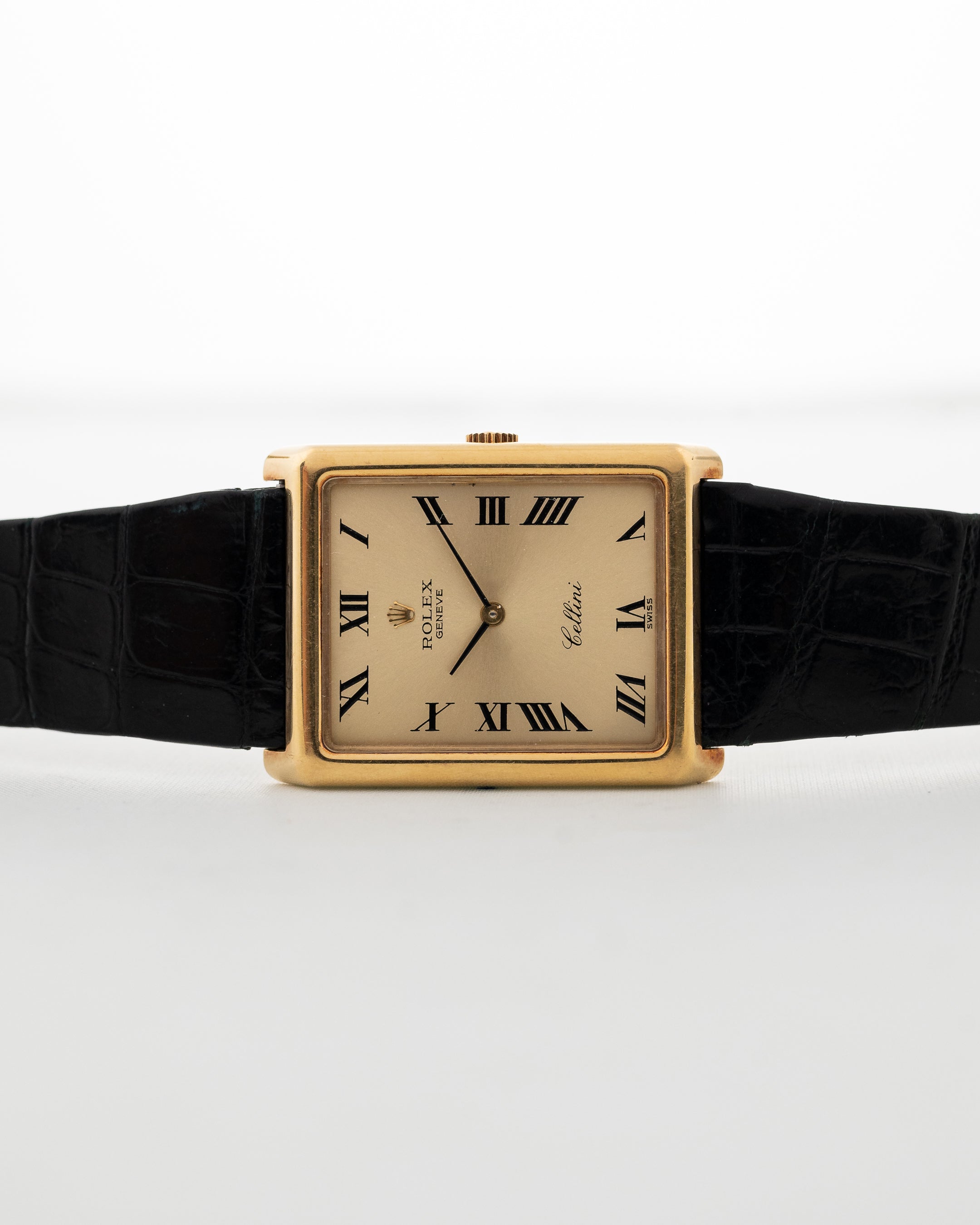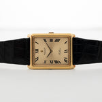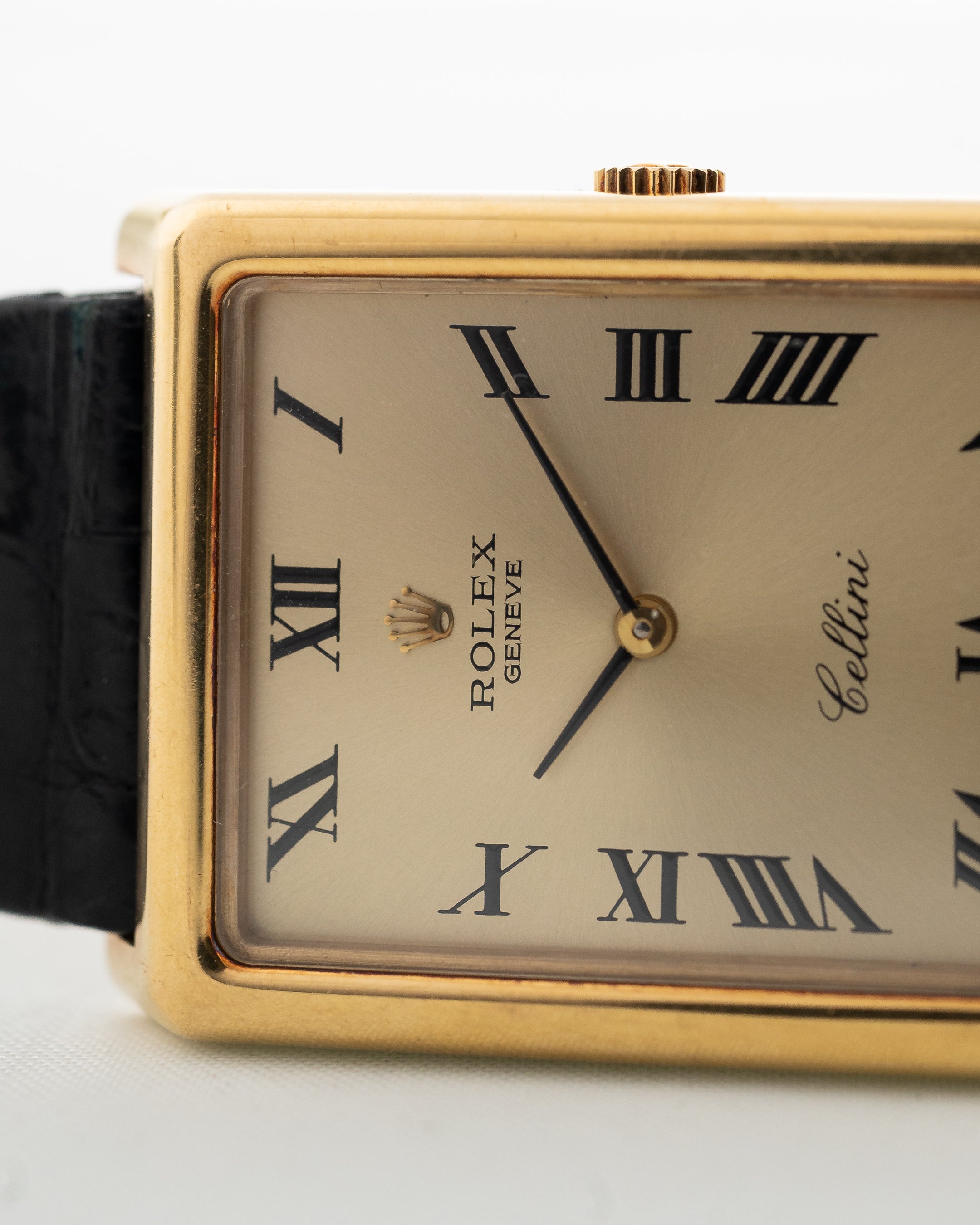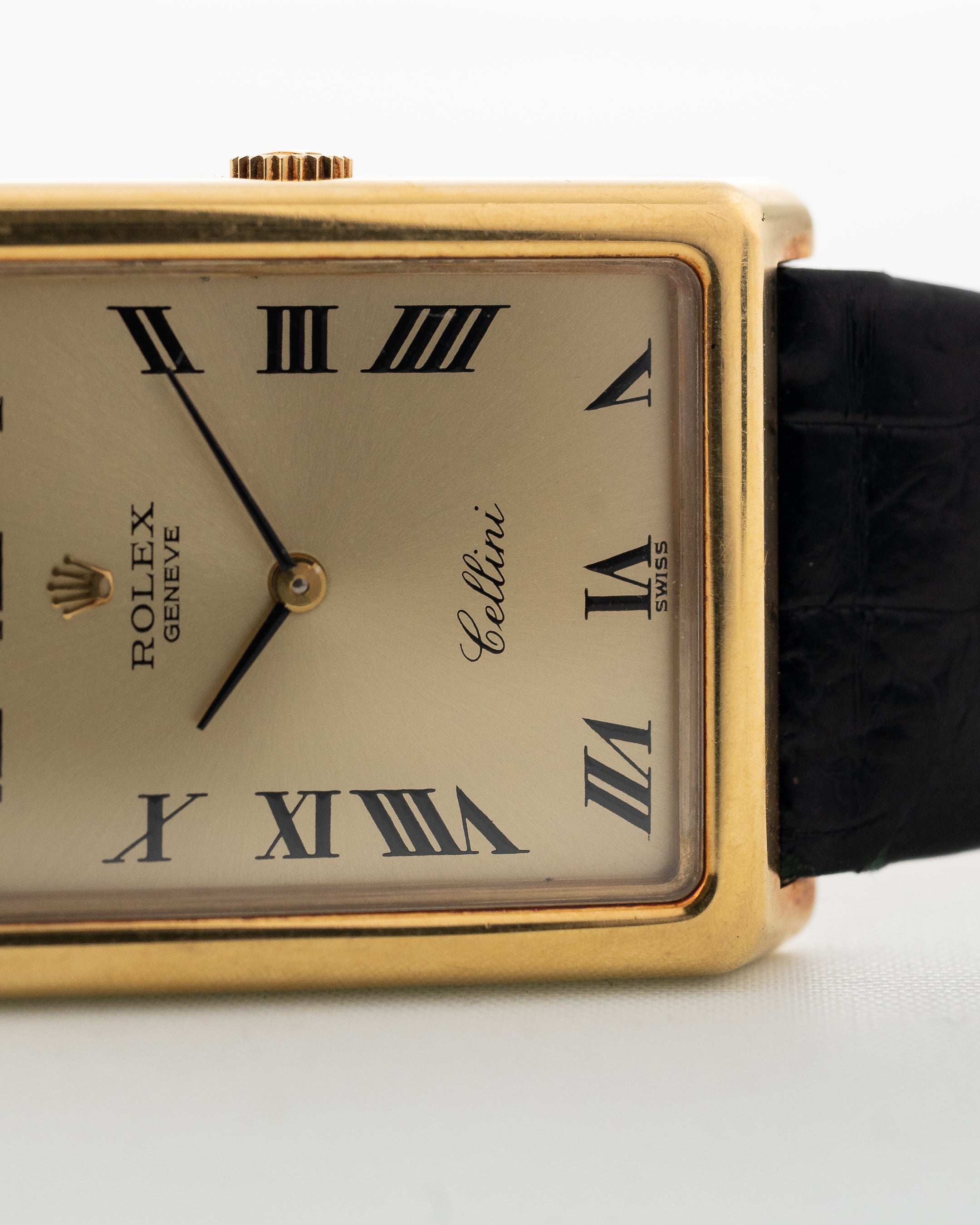 The Rolex Cellini line showcases the dressier side of Rolex compared to its more well-known sport models. This version is fitted in a 18k-yellow-gold rectangular shaped case, which is an unusual case shape for Rolex.