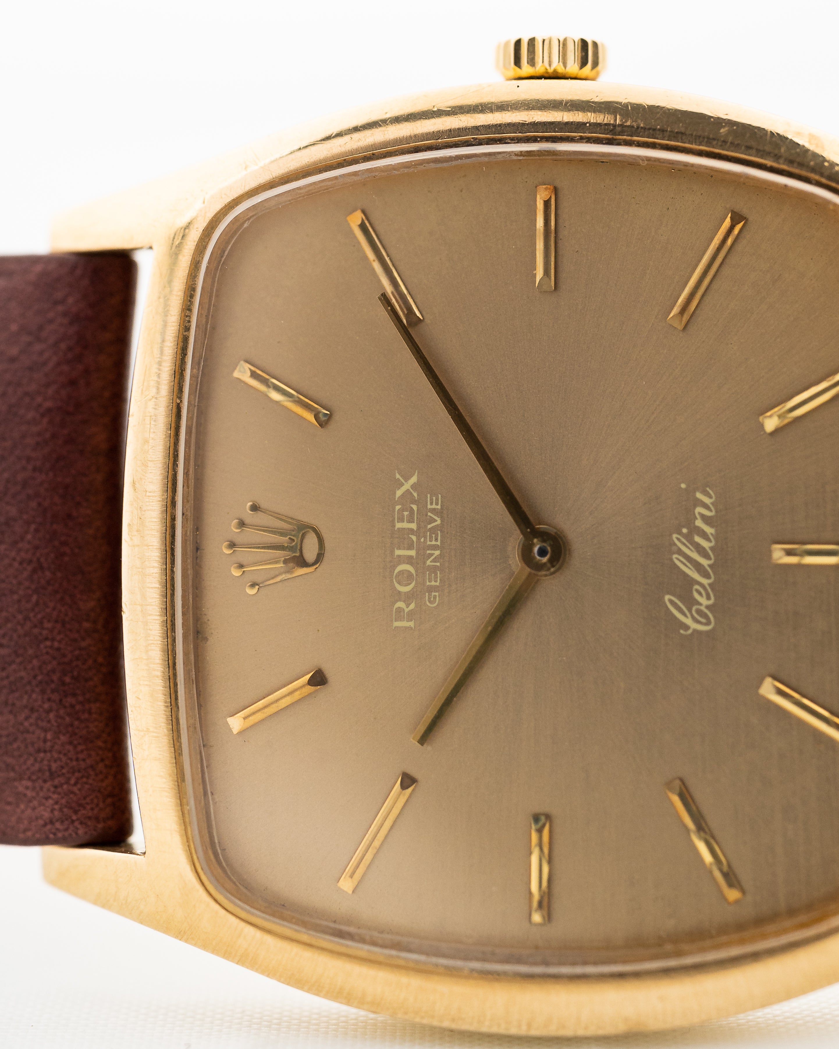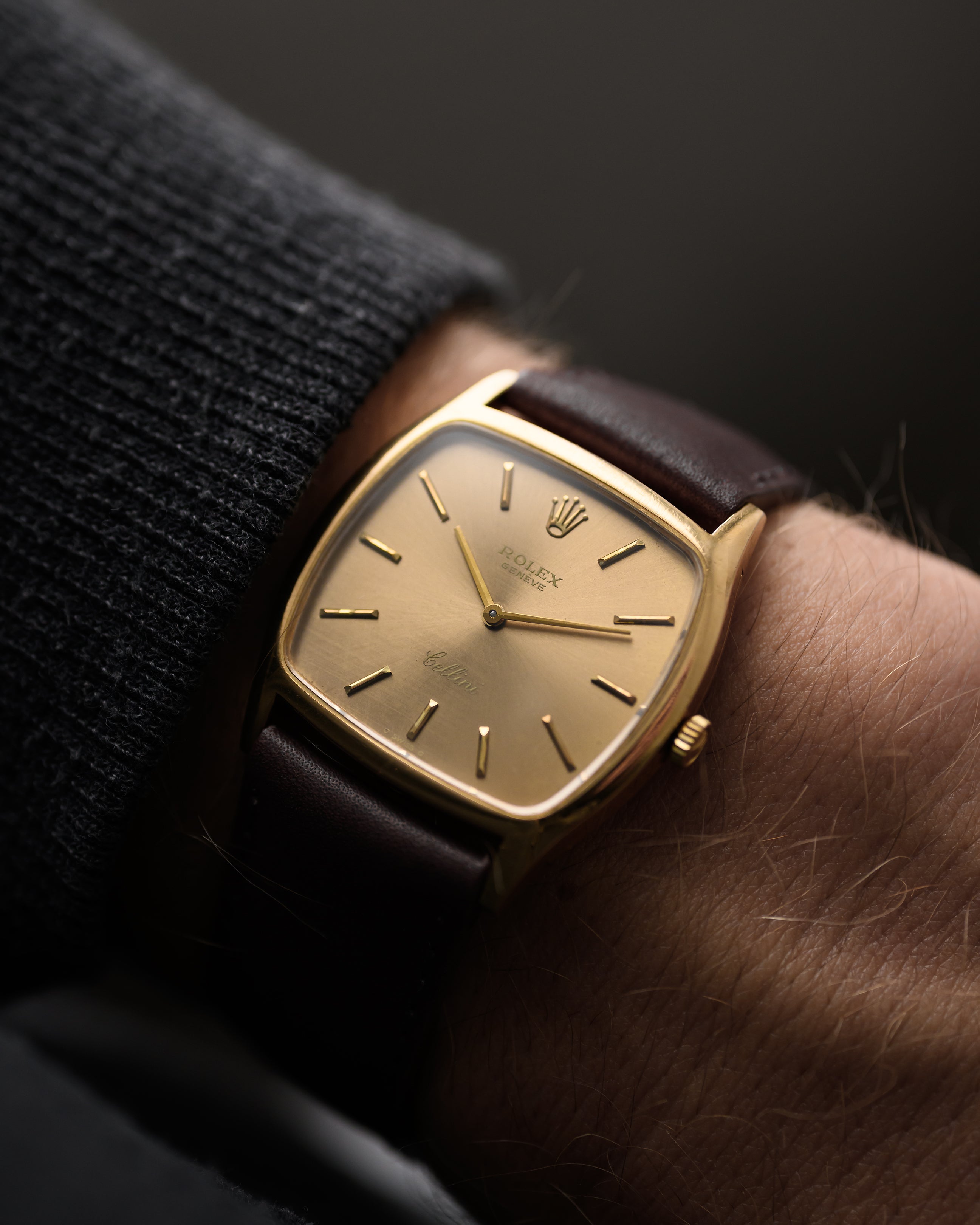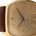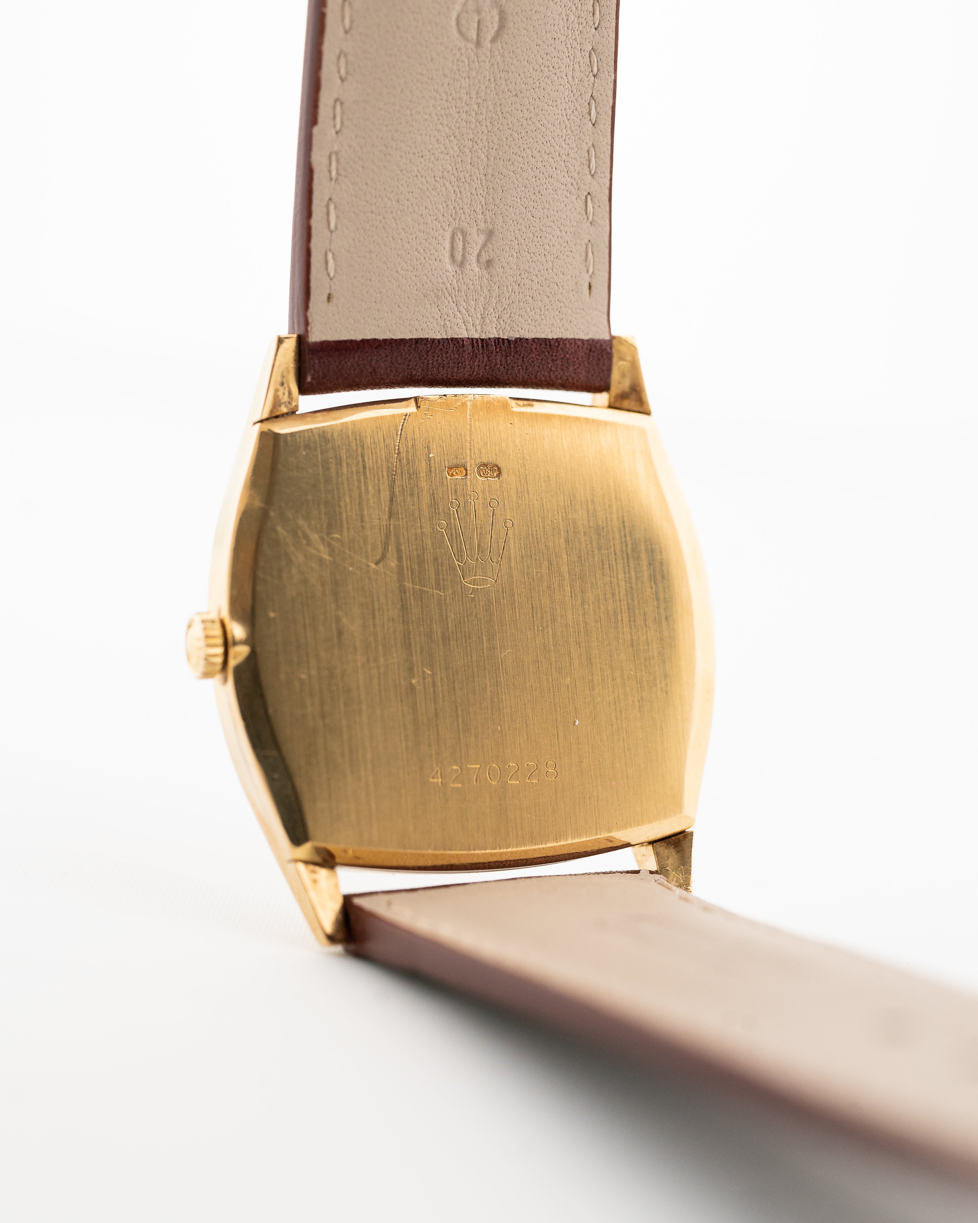 The Rolex Cellini line showcases the dressier side of Rolex compared to its more well-known sport models. This version is fitted in a 18k-yellow-gold tonneau shaped case, which is an unusual case shape for Rolex.