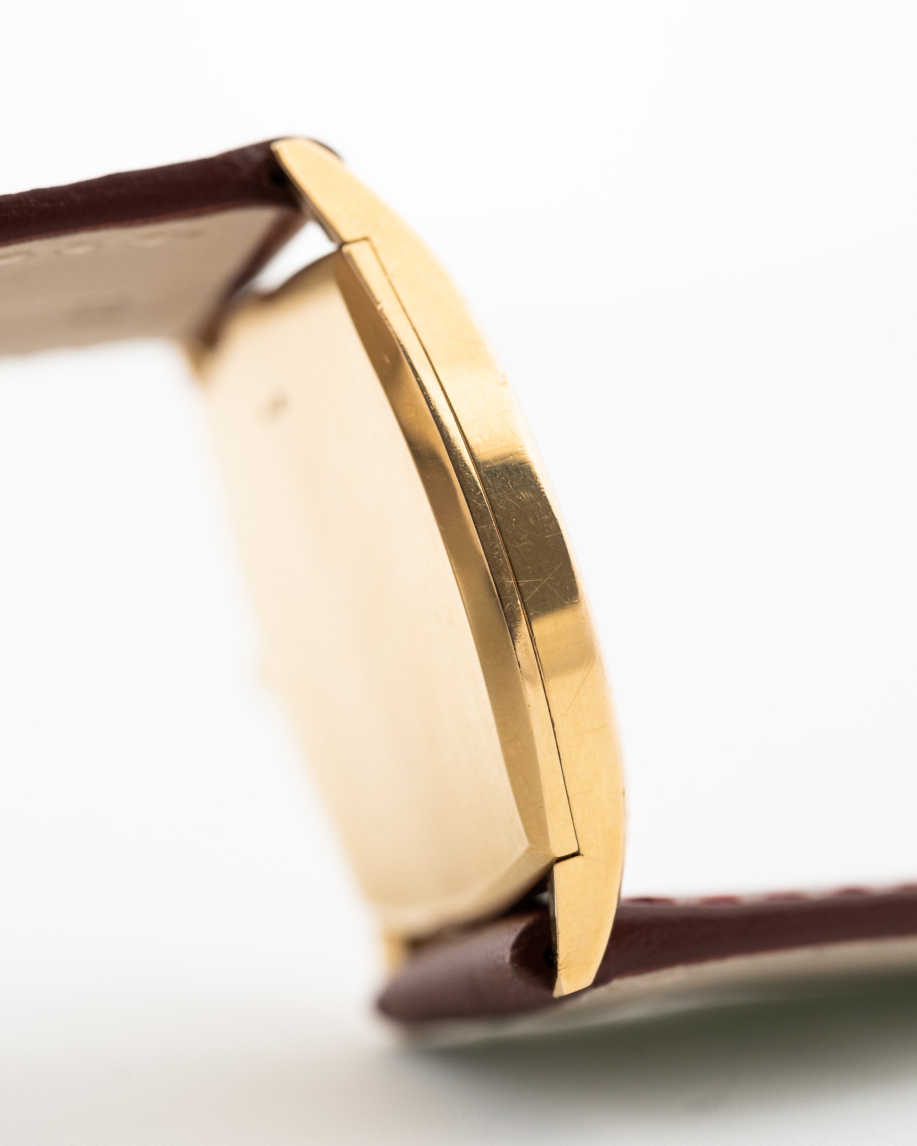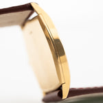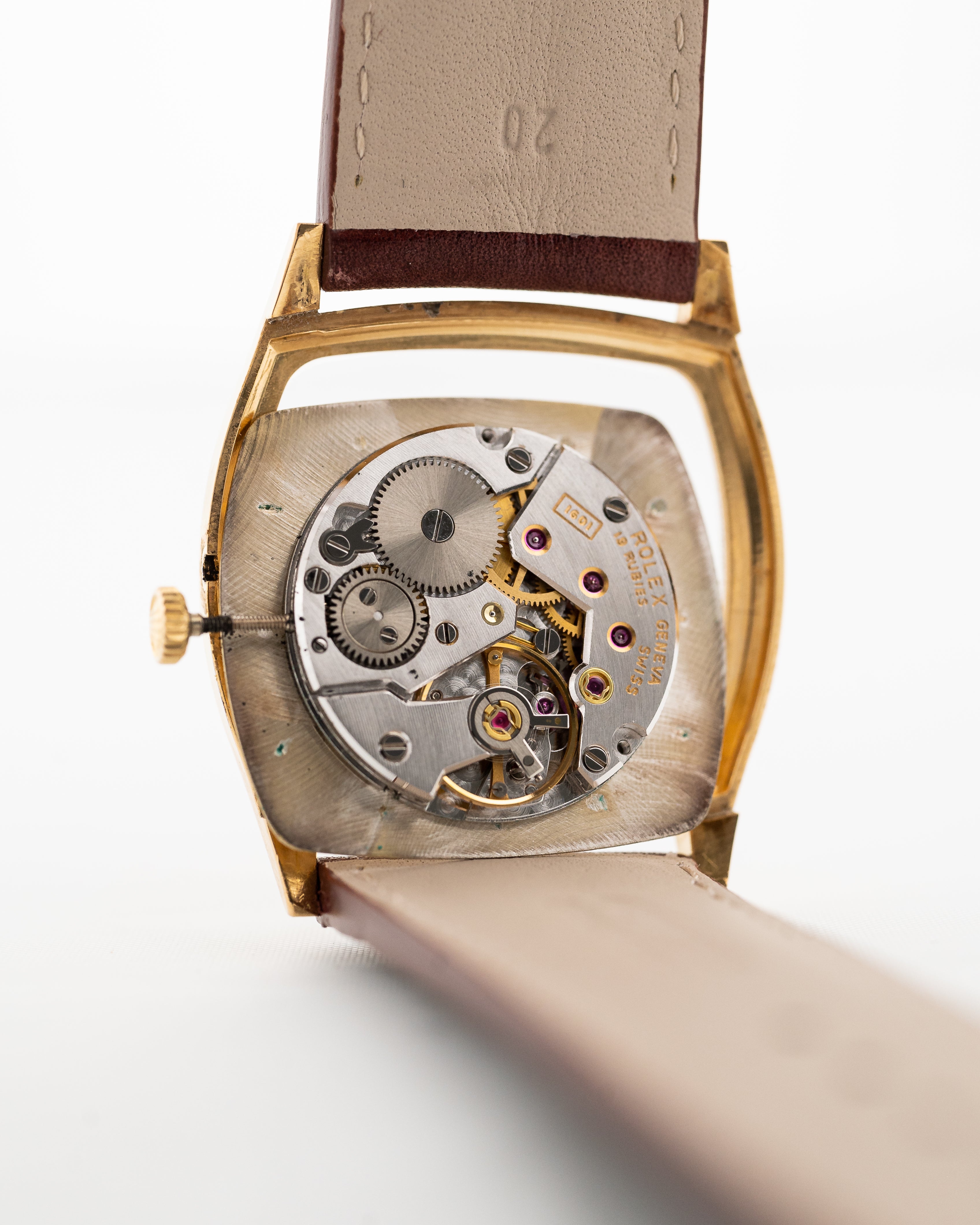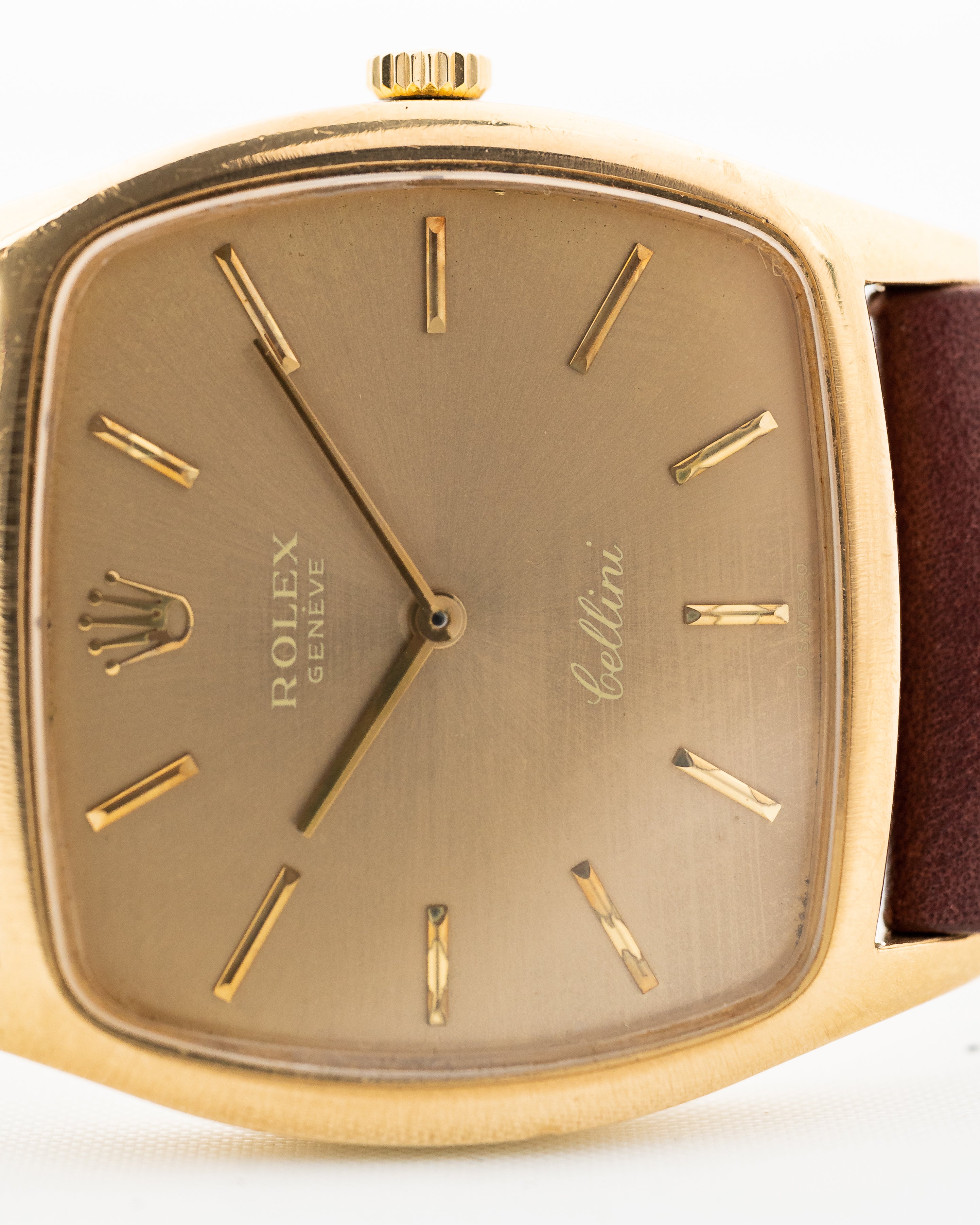 The Rolex Cellini line showcases the dressier side of Rolex compared to its more well-known sport models. This version is fitted in a 18k-yellow-gold tonneau shaped case, which is an unusual case shape for Rolex.