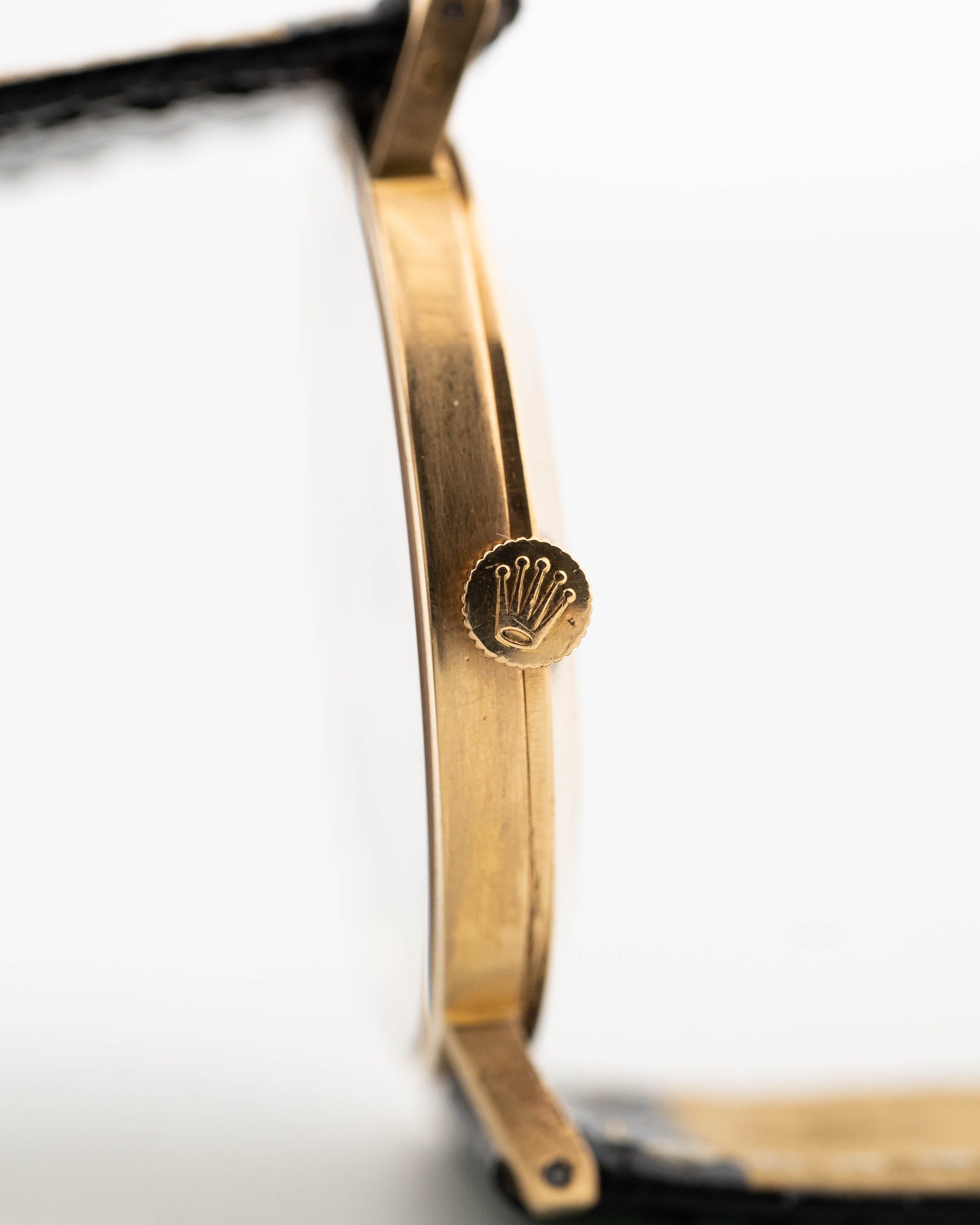 The Rolex Cellini line showcases the dressier side of Rolex compared to its more well-known sport models. Our Ref. 3833 is fitted in a 18k-yellow-gold case, the dial color is yellow gold, which was a popular color for dress watches produced in this era. It comes with the original gold plated Rolex buckle and is overall in great condition.