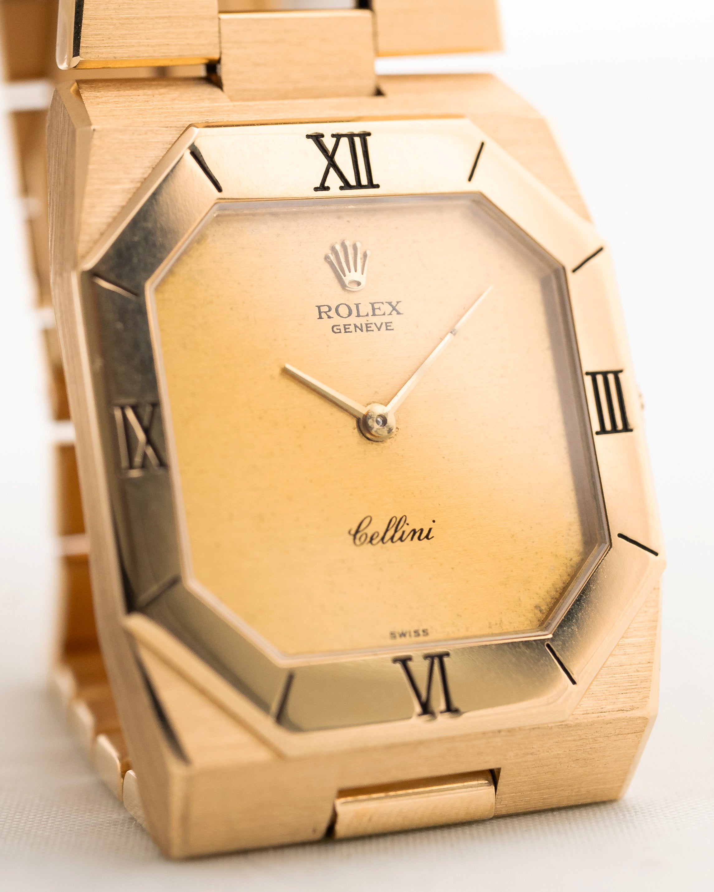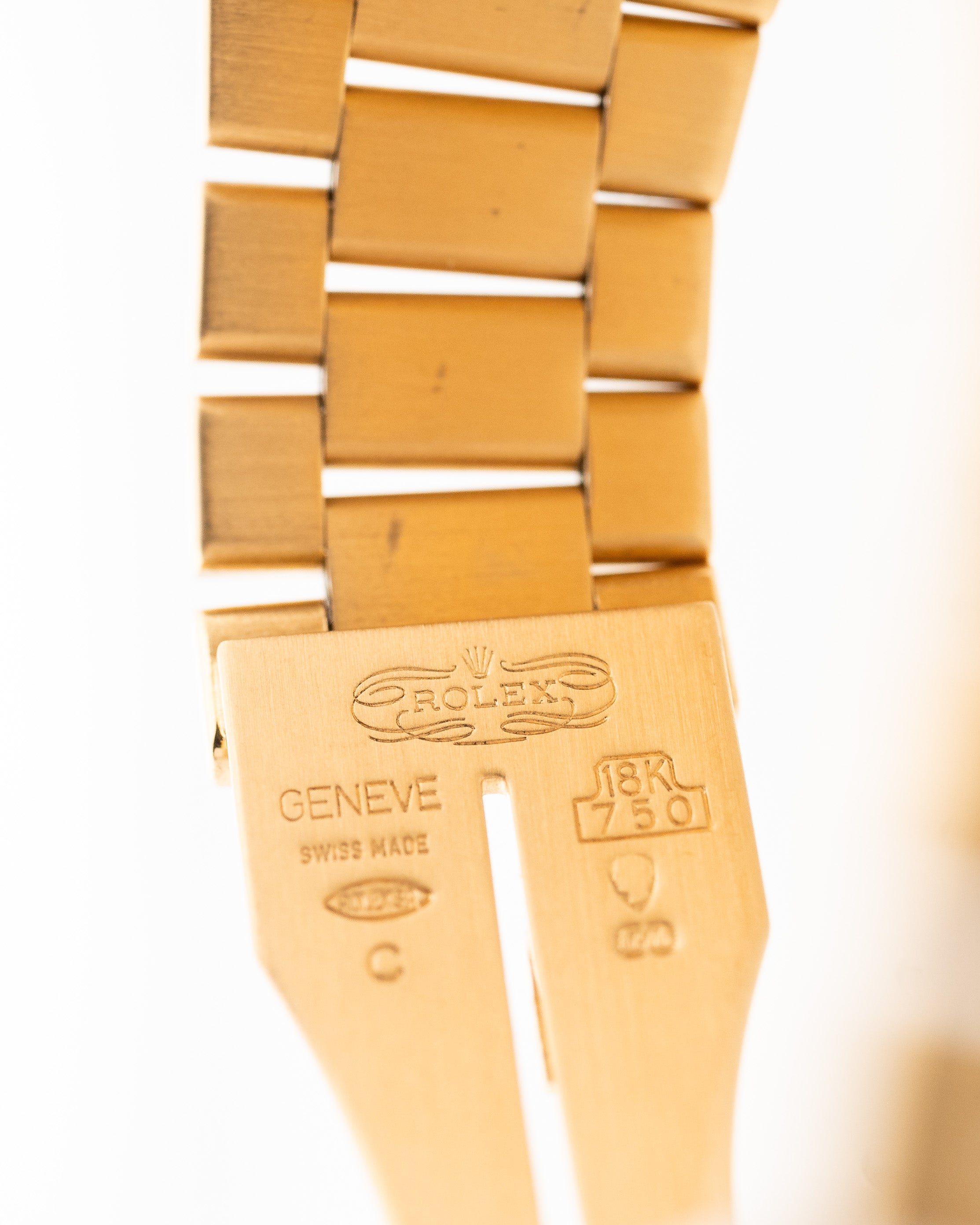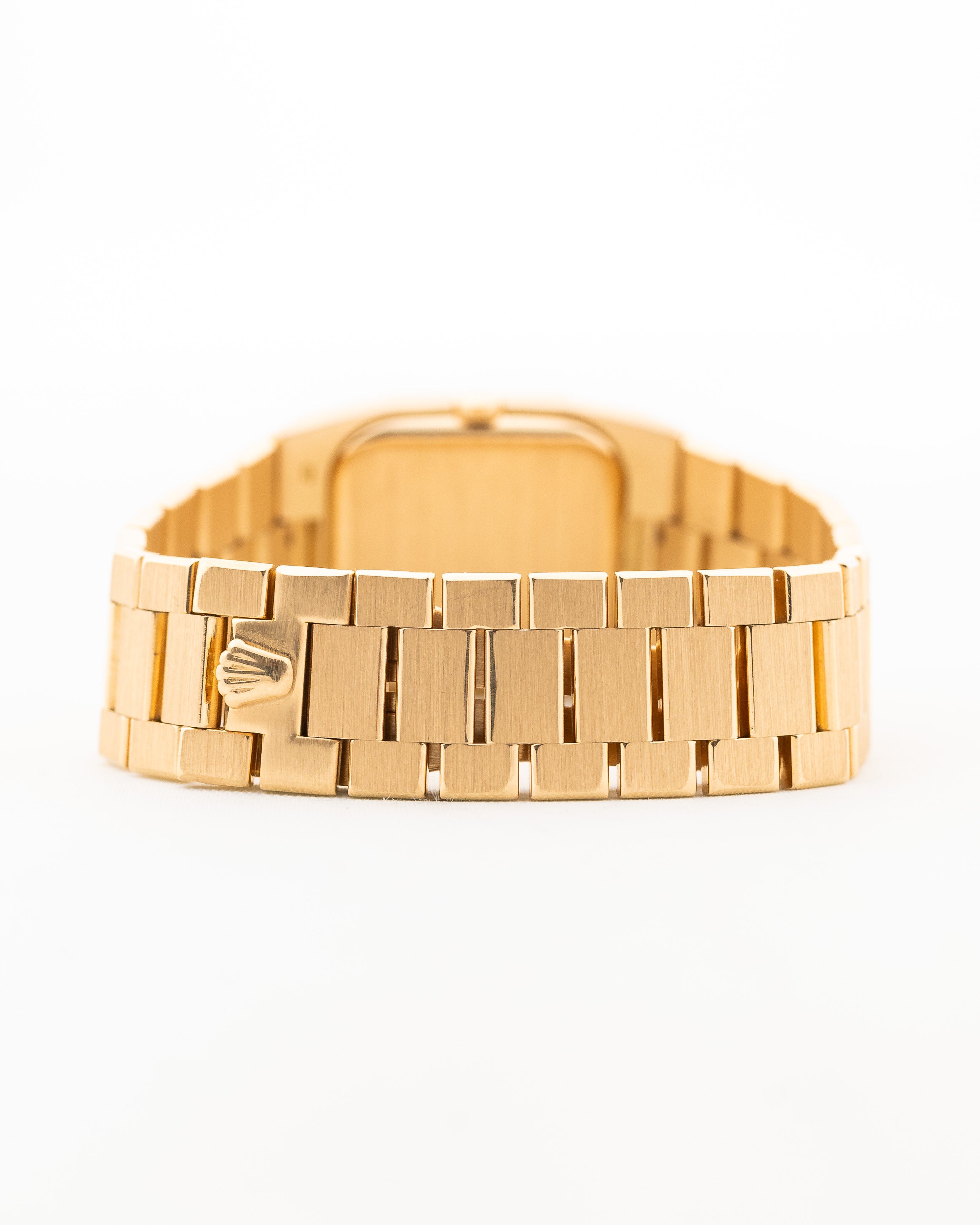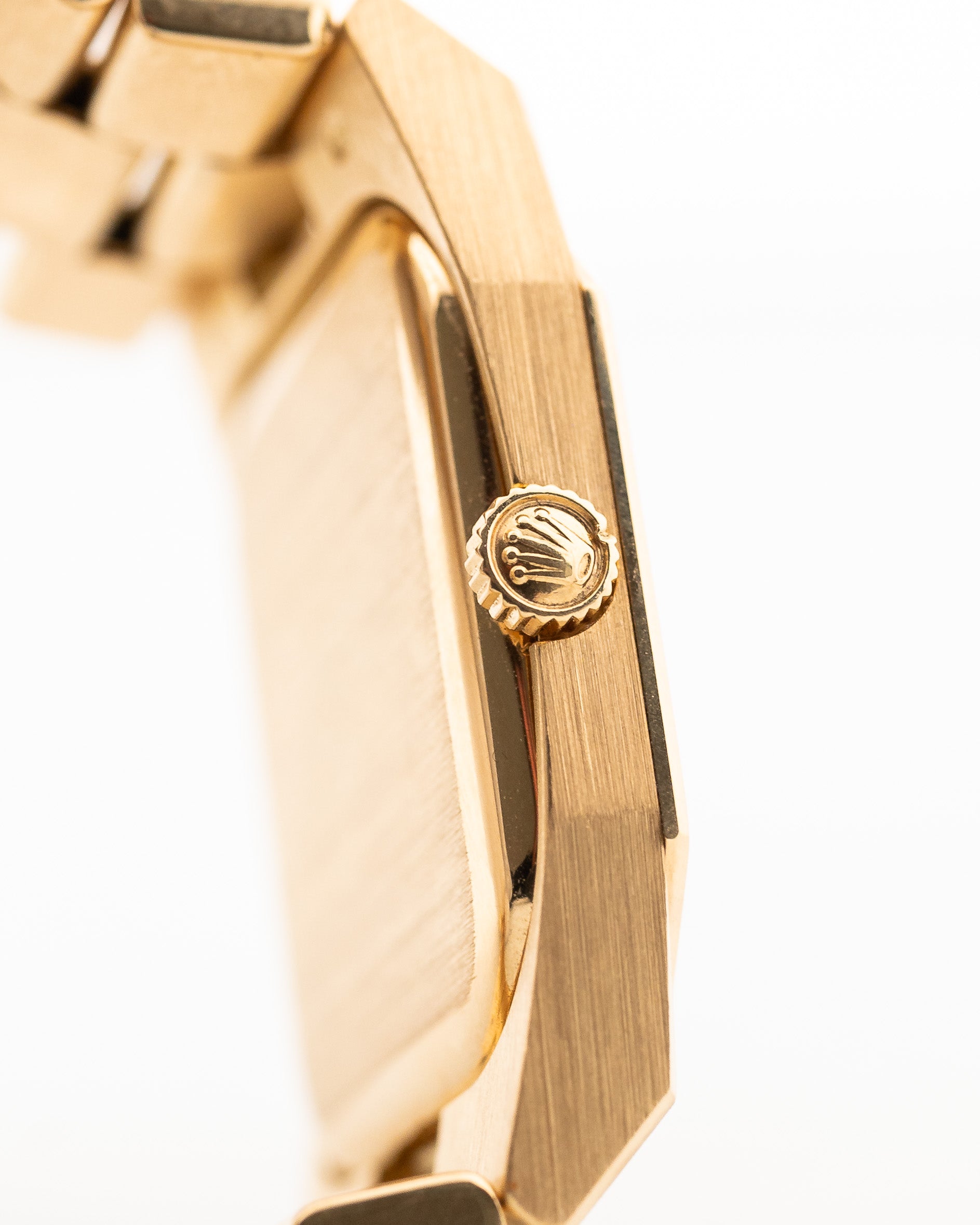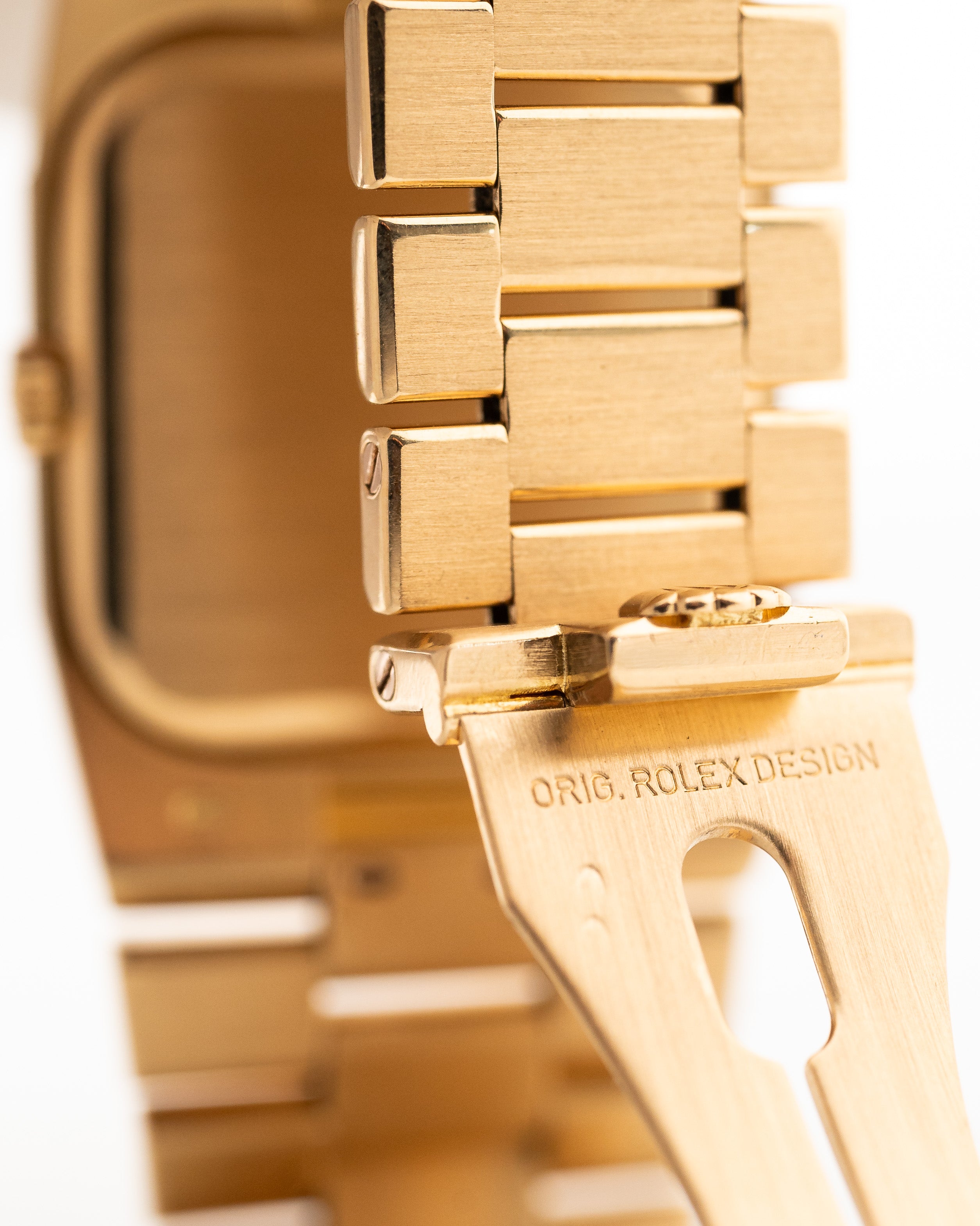 The Rolex Cellini line showcases the dressier side of Rolex compared to its more well-known sport models. Our Ref. 4350 is fitted in a 18k-yellow-gold square-shaped case, which is an unusual case shape for Rolex and a perfectly fitting 18k President bracelet with 18k folding clasp without any stretch and in fabulous condition.