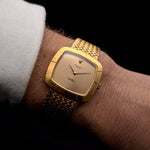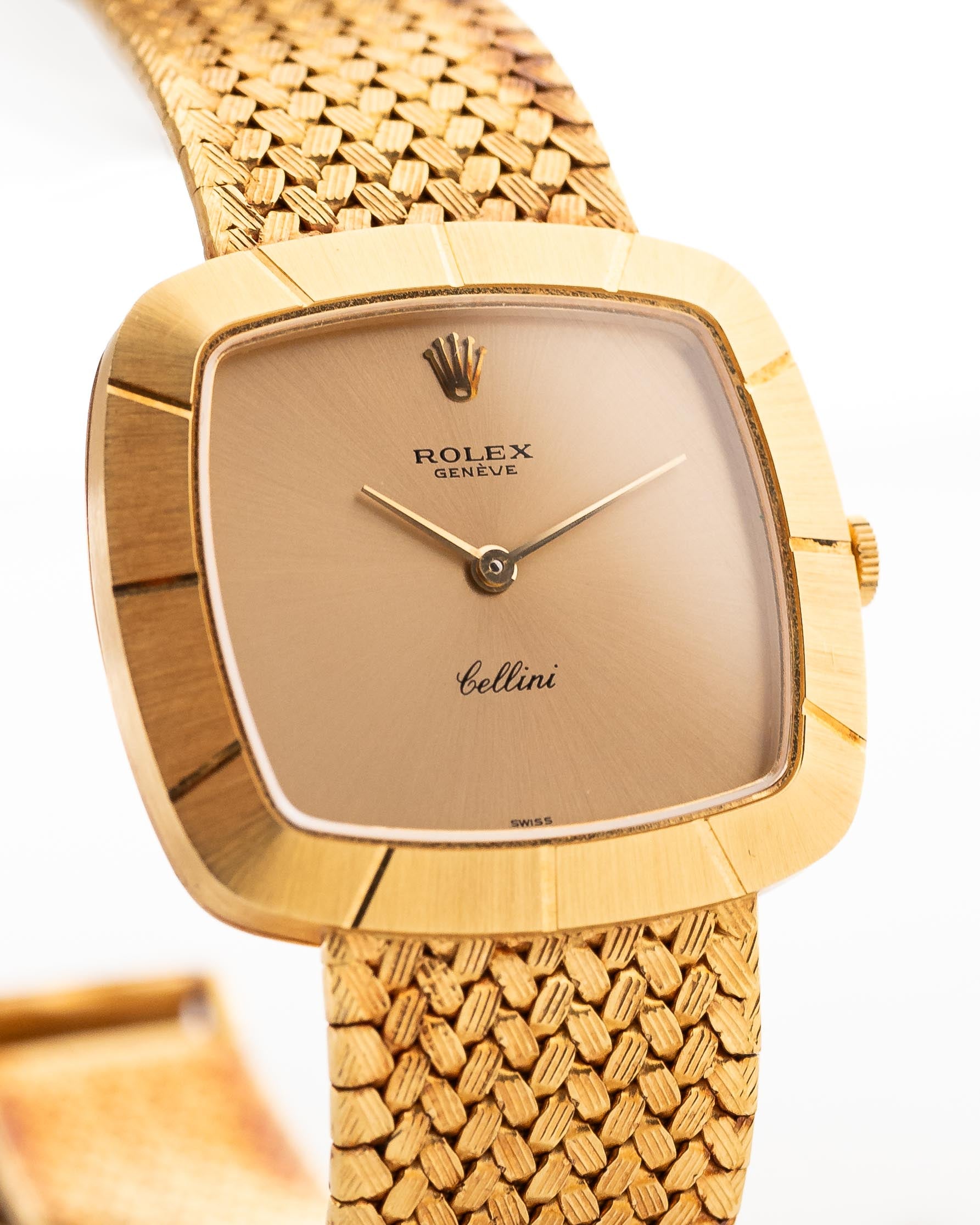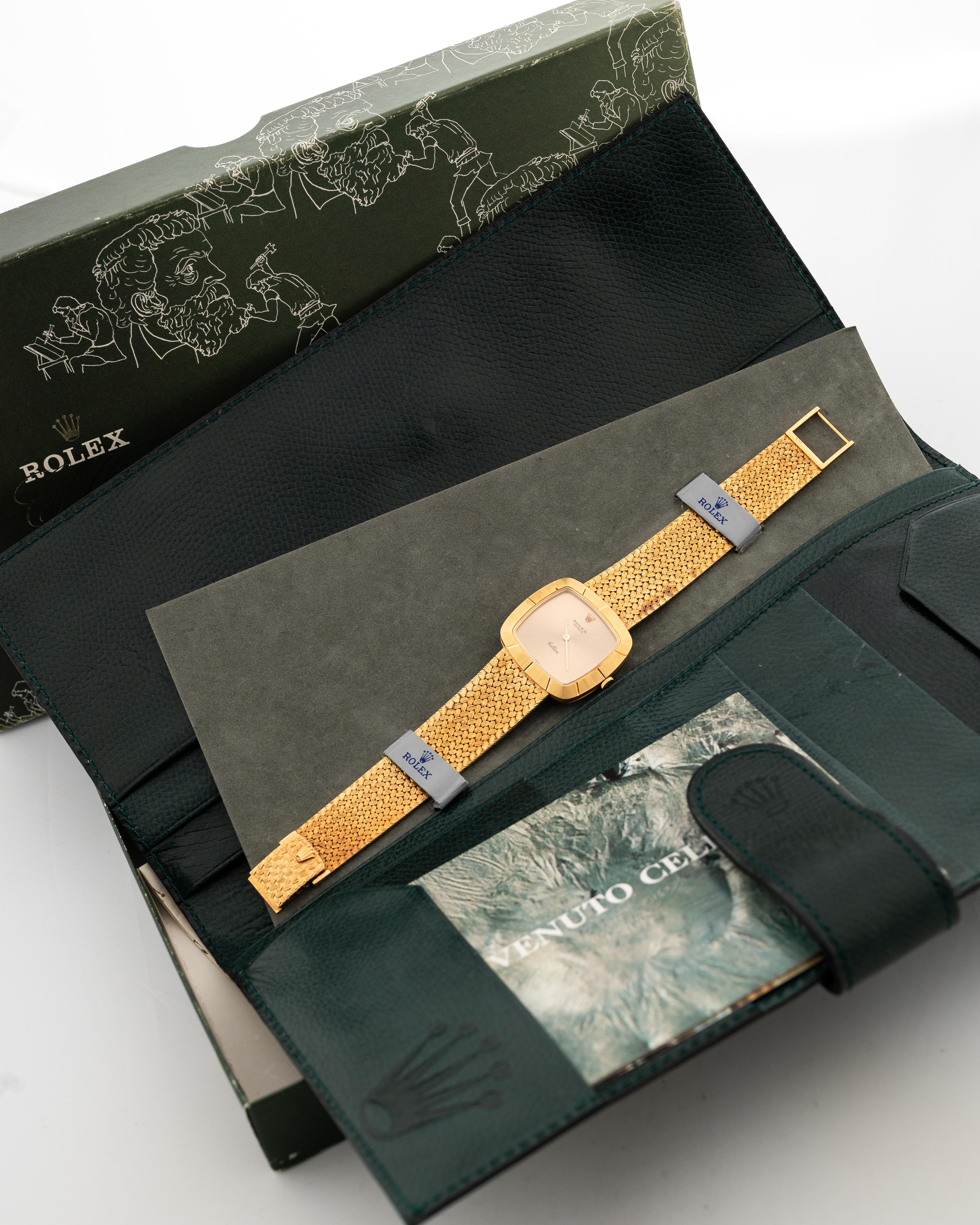 The Rolex Cellini line showcases the dressier side of Rolex compared to its more well-known sport models. This version is fitted in a 18k-yellow-gold square-shaped case, which is an unusual case shape for Rolex.