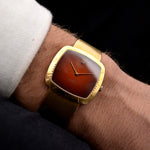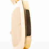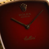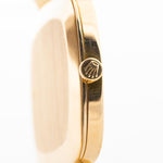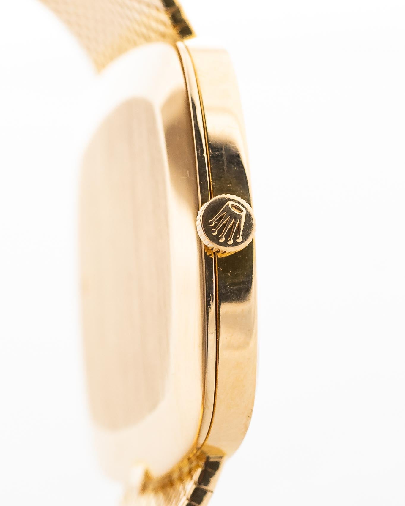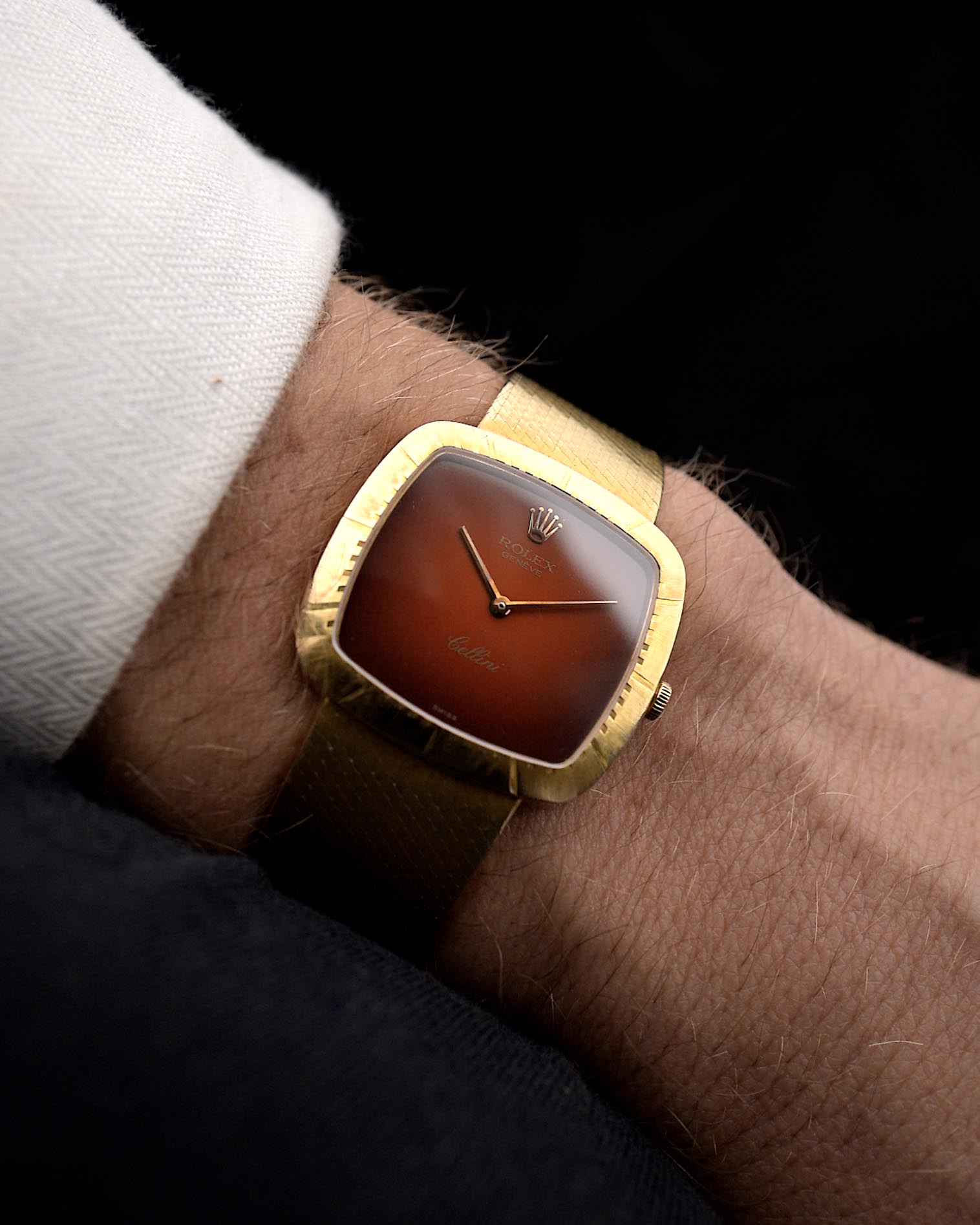 The Rolex Cellini line showcases the dressier side of Rolex compared to its more well-known sport models. This version is fitted in a 18k-yellow-gold square-shaped case, which is an unusual case shape for Rolex.