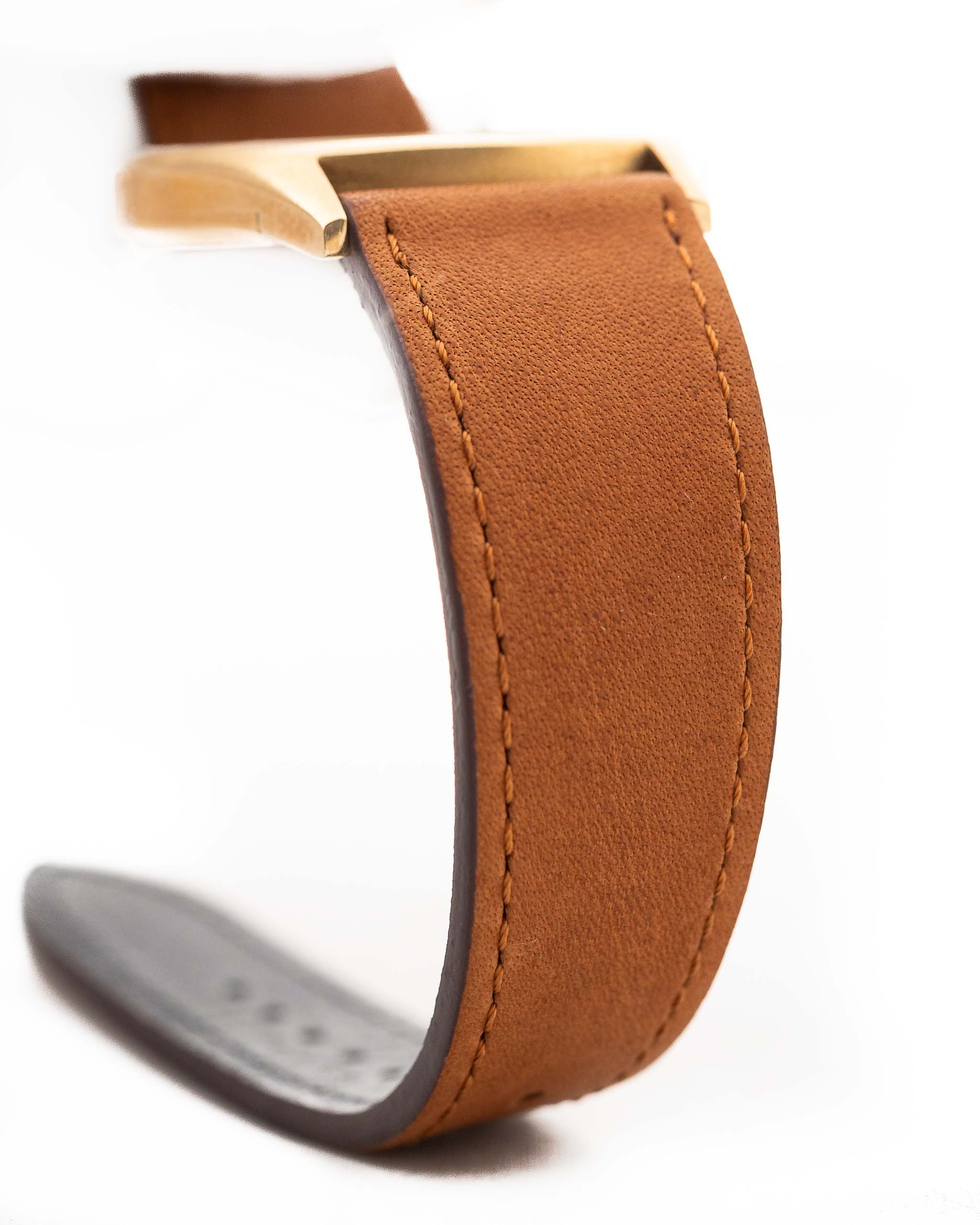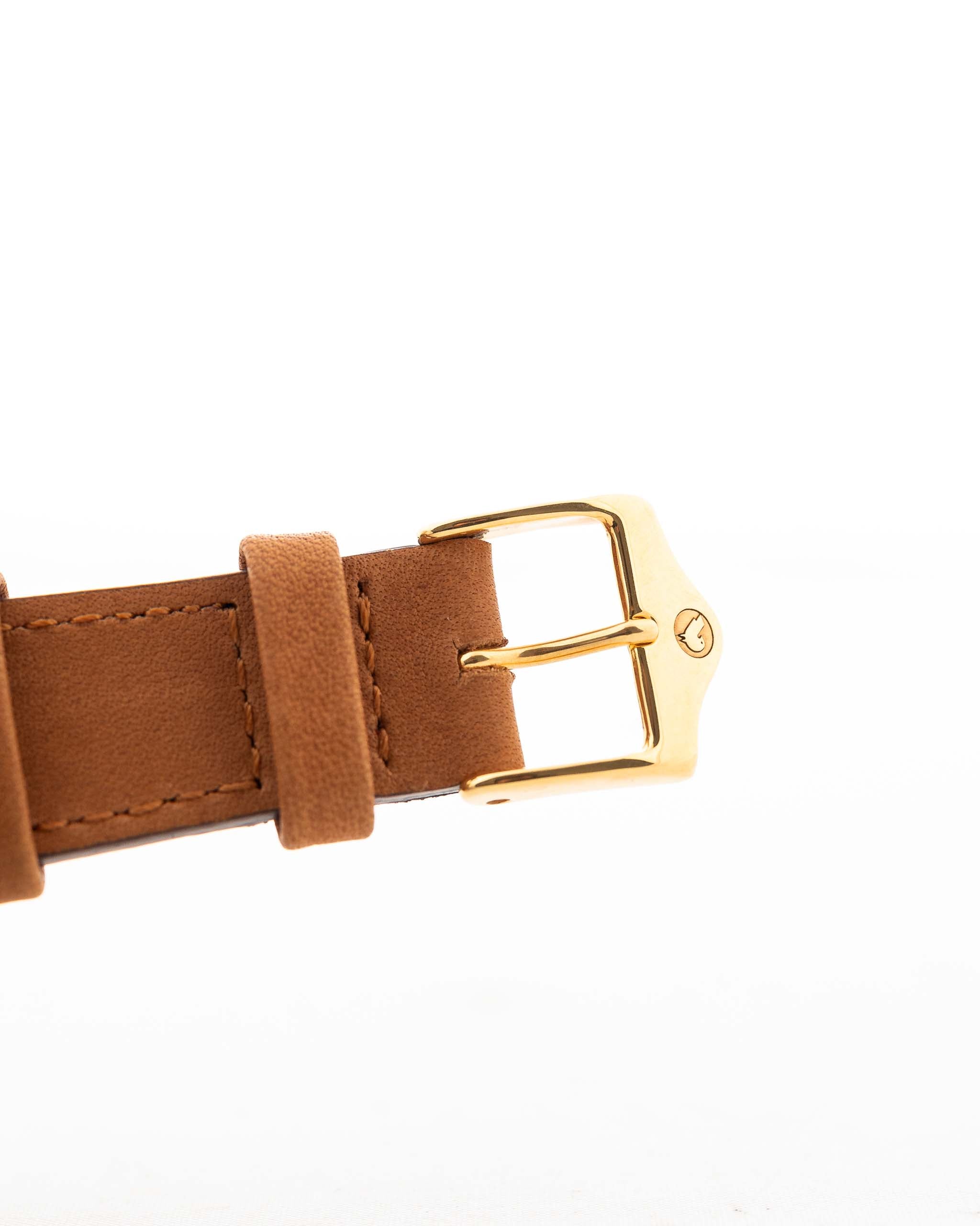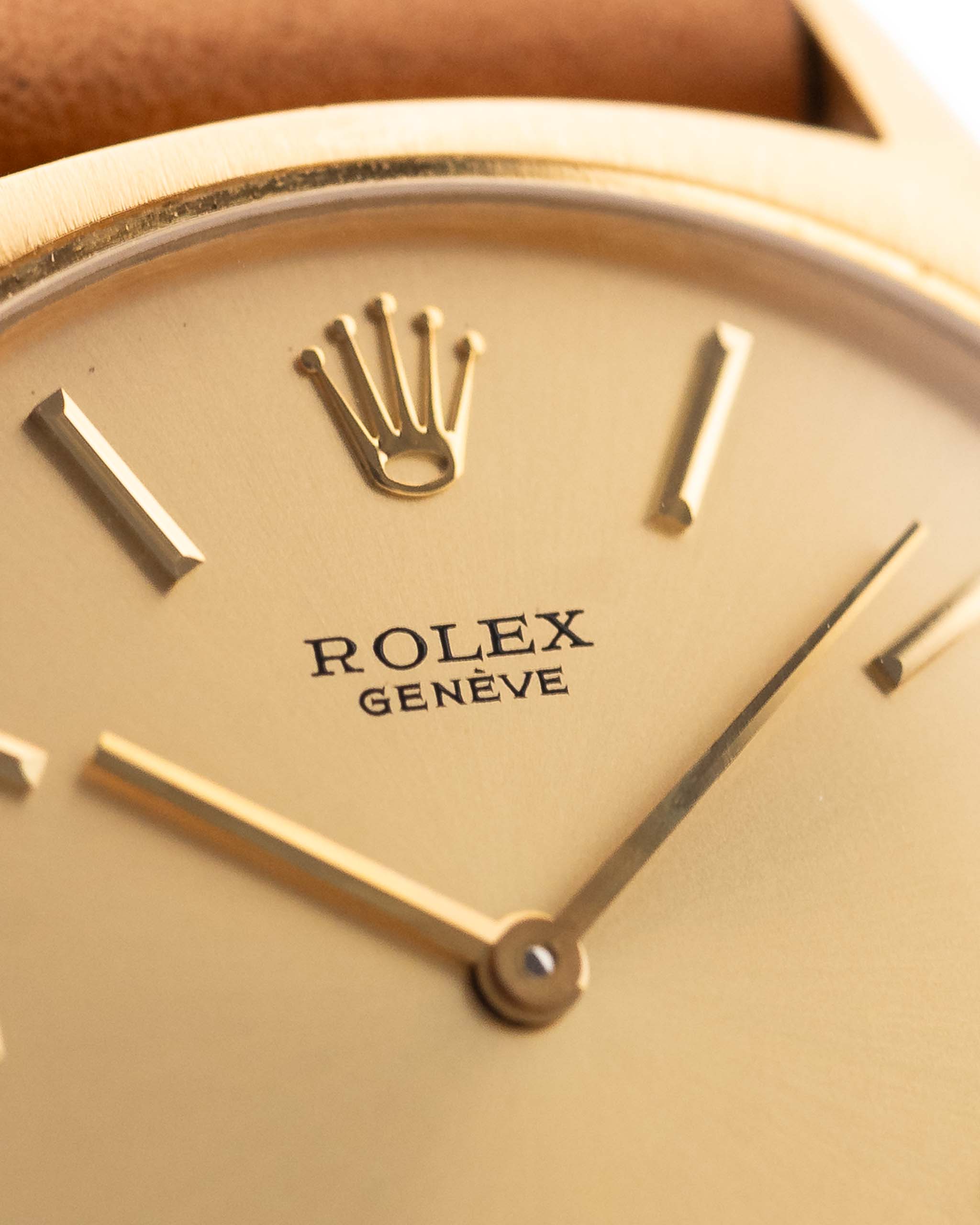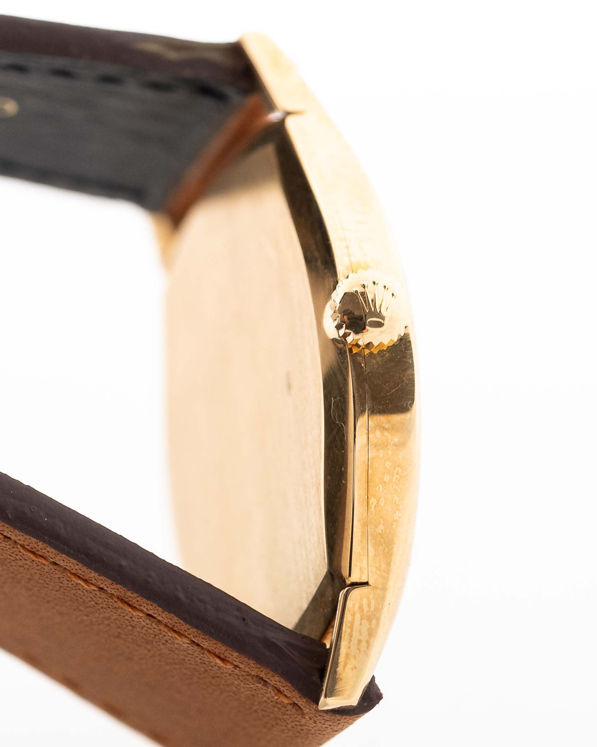 A closeup photo of a vintage Rolex Cellini 3806 Ellipse 18k from 1974 on a wrist in Yellow gold. 32mm, Manual wind movement, Original golden dial and Original hands & crown with cognac brown Leather strap.