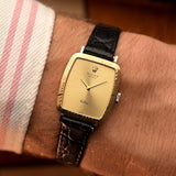 Vintage Rolex Cellini 4080 Rectangular from 1981 on a wrist. 23mm in 18k Yellow Gold Case with Manual Wind Movement, Golden Sunburst Dial and Leather Strap.
