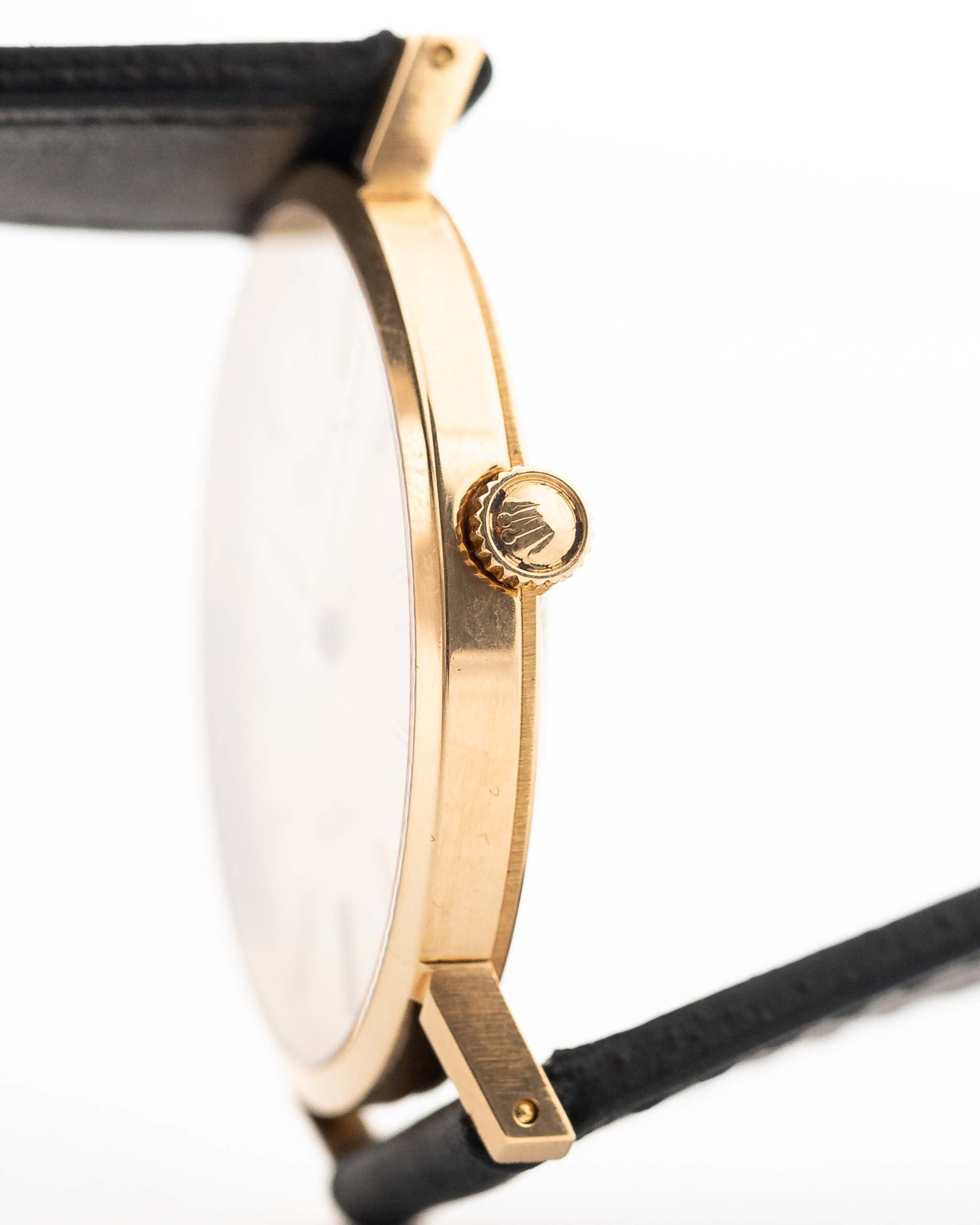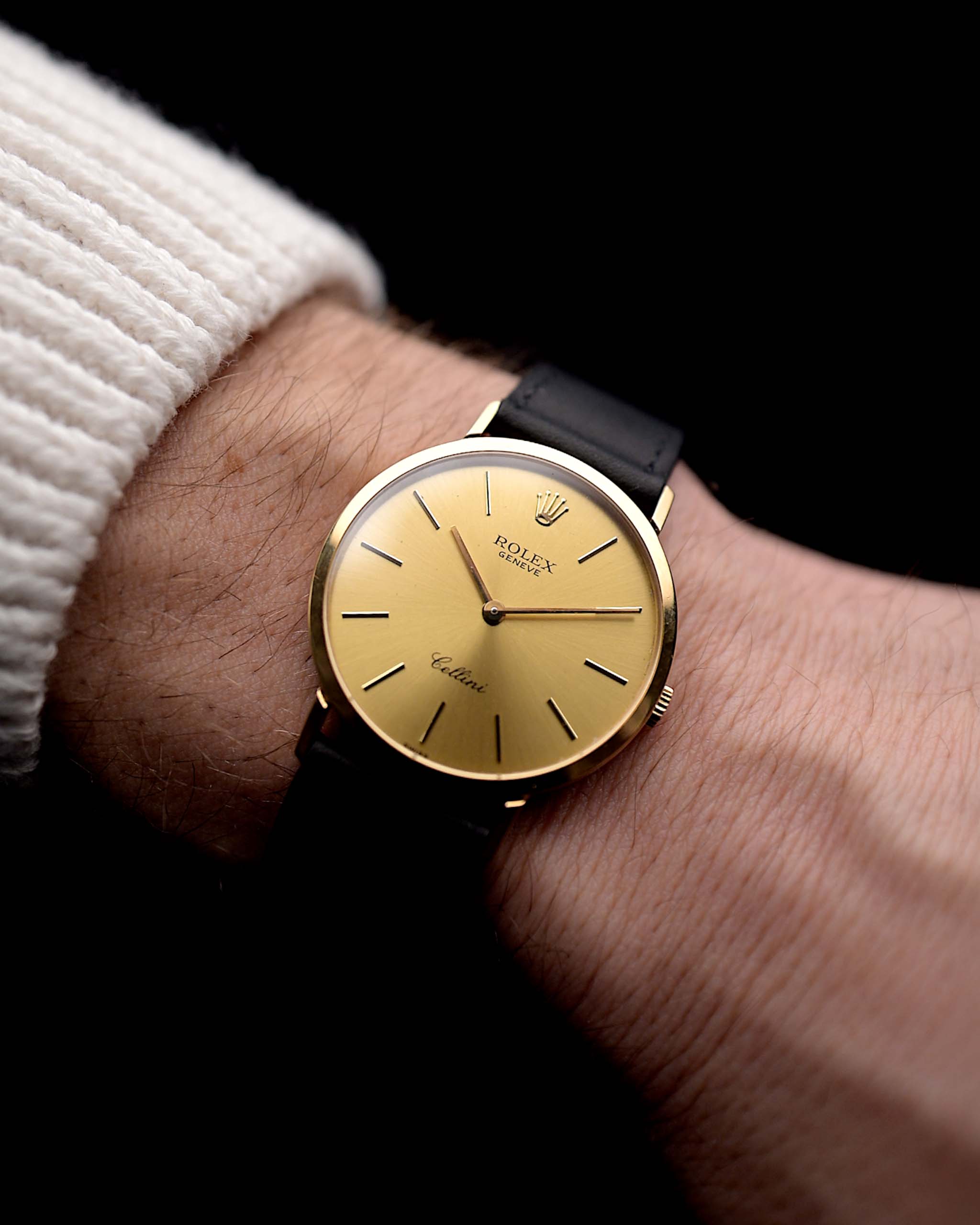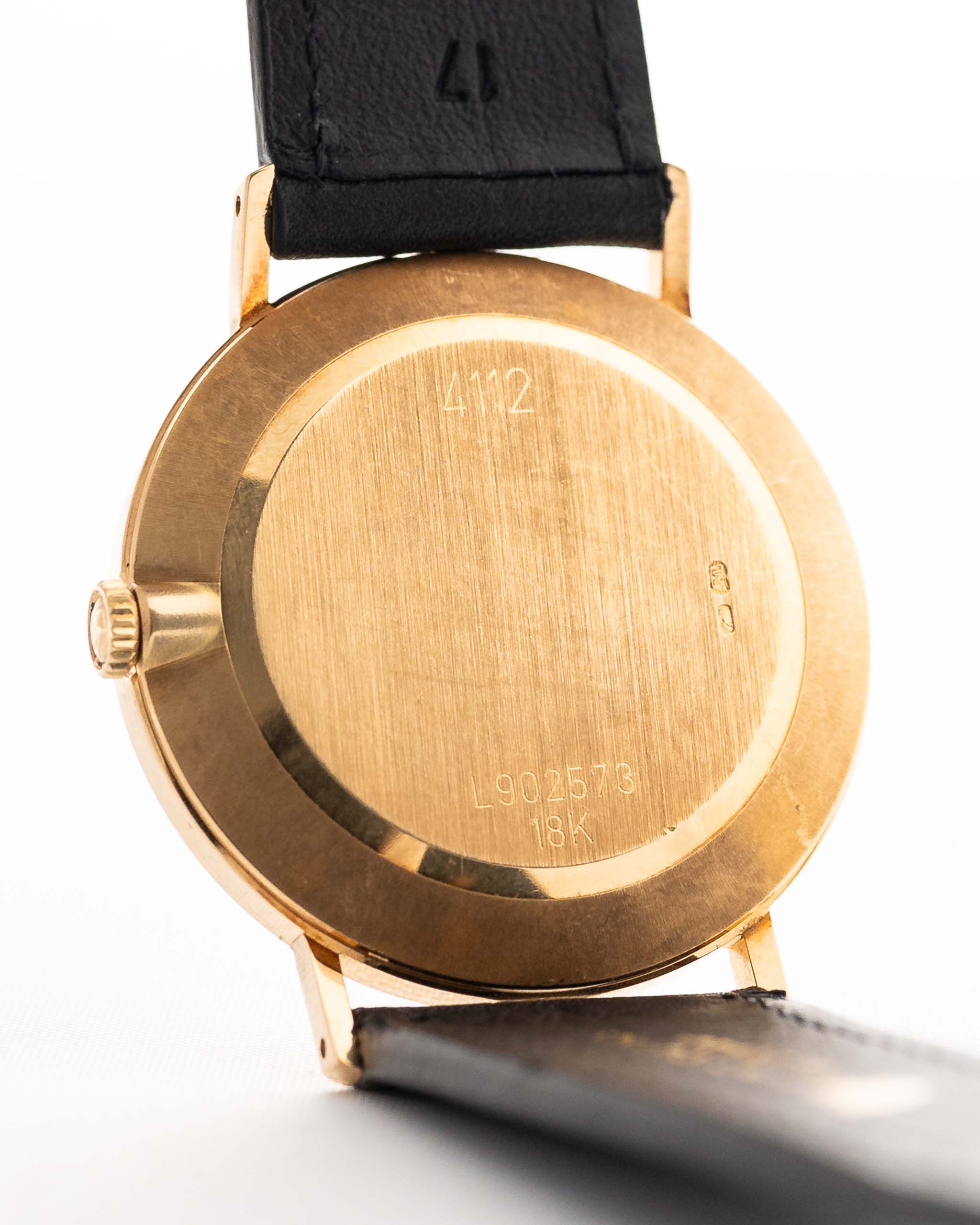The Rolex Cellini line showcases the dressier side of Rolex compared to its more well-known sport models. Our version Ref. 4112 is fitted in a 18k-yellow-gold case and beautiful and golden sunburst dial with a clean calatrava dial design.