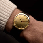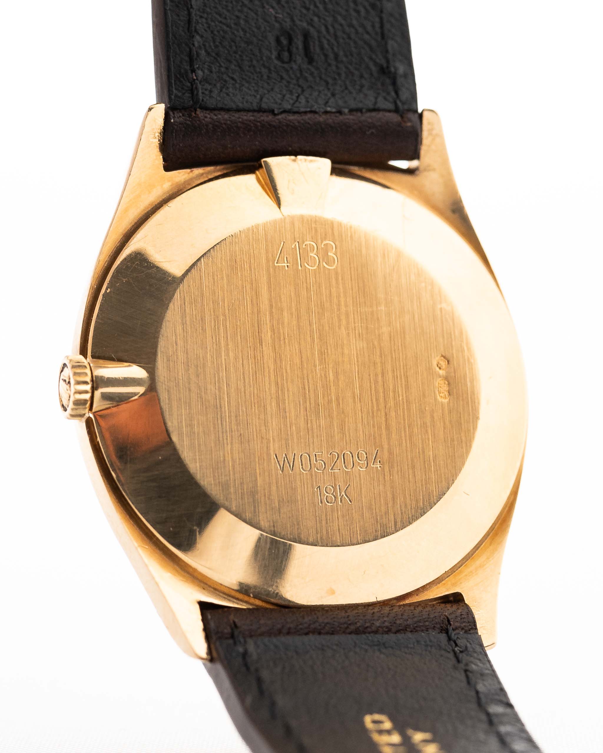 Our version Ref. 4133 is fitted in a 18k-yellow-gold case and beautiful and golden colored and vertically brushed dial with a clean Calatrava dial design - keeping the appearance classic and elegant.