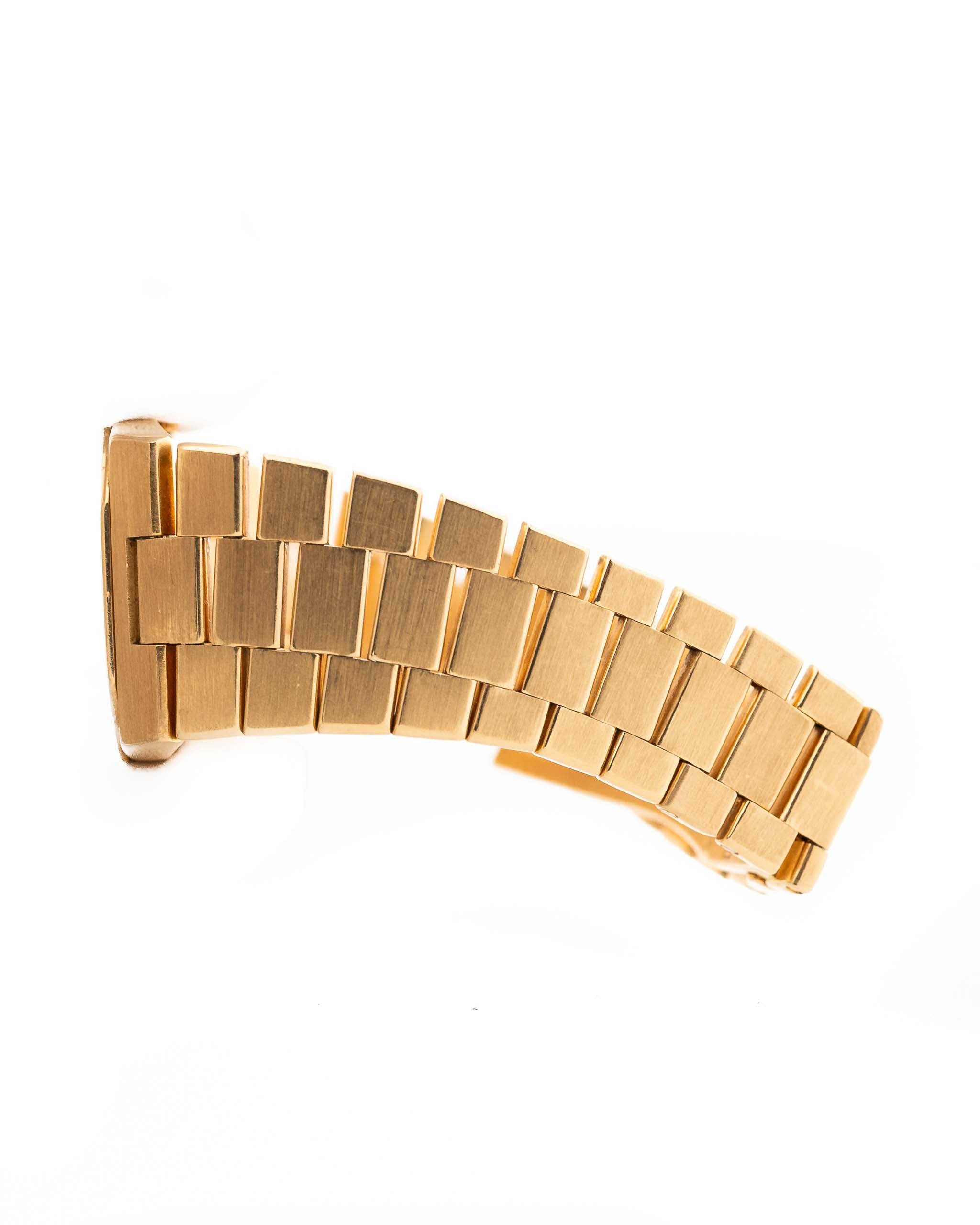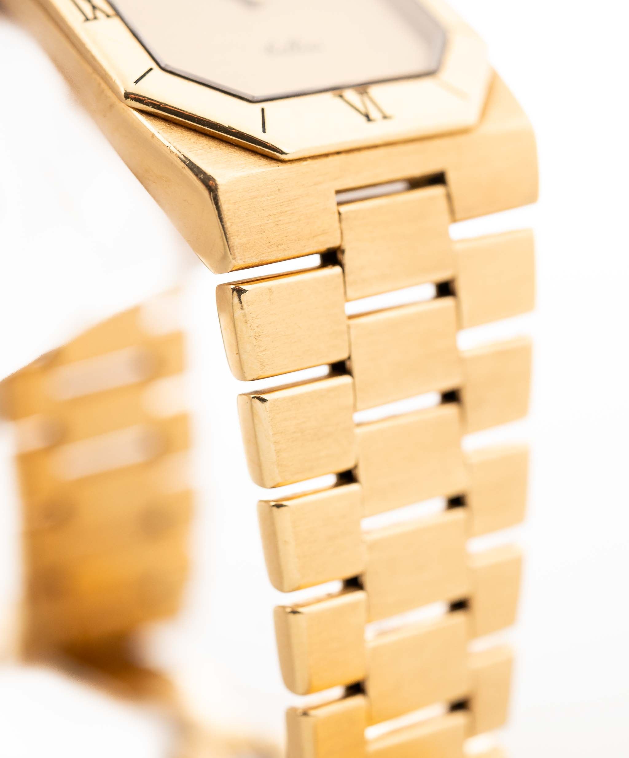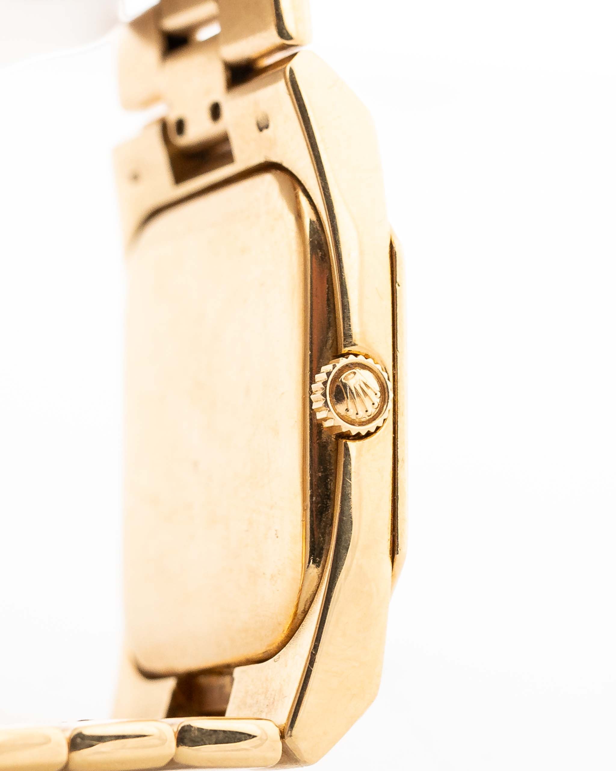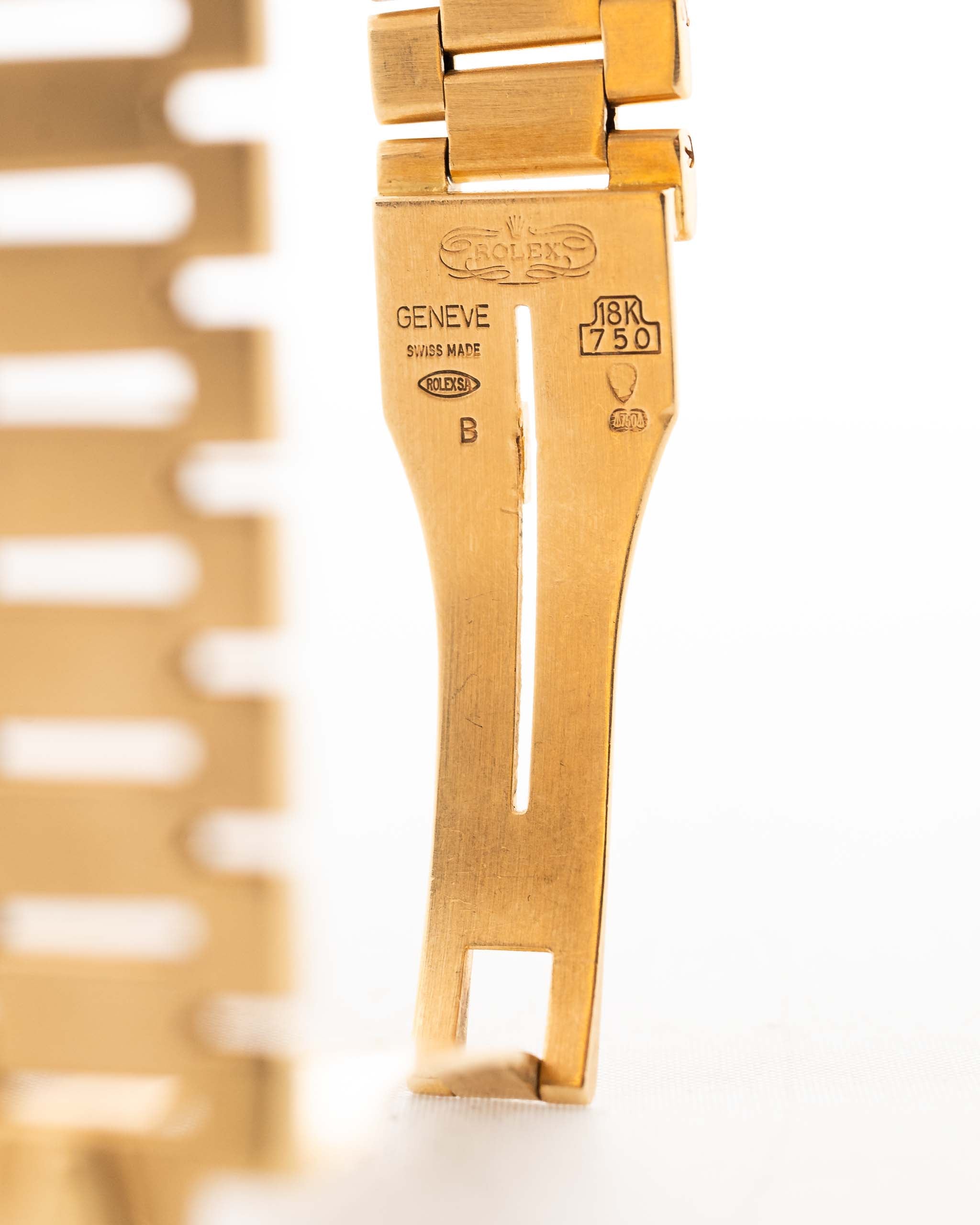 The Rolex Cellini line showcases the dressier side of Rolex compared to its more well-known sport models. Our Ref. 4350 is fitted in a 18k-yellow-gold square-shaped case, which is an unusual case shape for Rolex and a perfectly fitting 18k President bracelet with 18k folding clasp without any stretch and in fabulous condition.