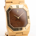Rolex Cellini 4350 Octagon Wood from 1981. 27mm in 18k Yellow Gold Case with Flawless Burl Wood Dial, Manual Wind Caliber 1601, Original 18k Rolex President Bracelet.