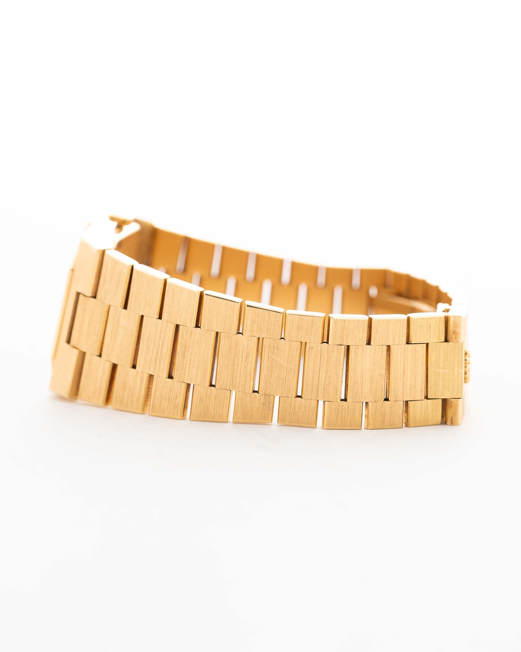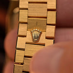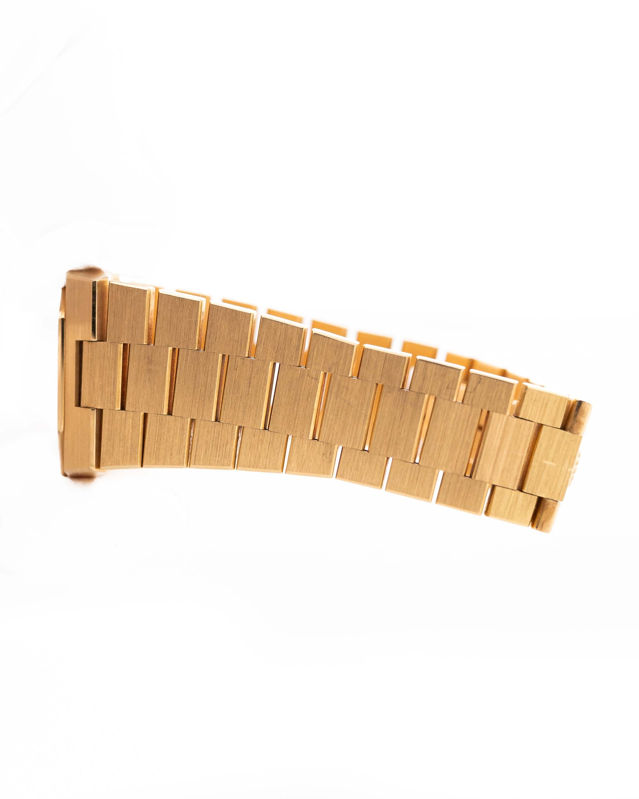 Paired with the 18k gold Rolex President bracelet, completely tight with no stretch, and preserved in unworn, unpolished condition, this is a collector’s dream. The watch wears comfortably and boldly thanks to its strong lines and perfectly proportioned 27mm square profile.