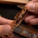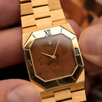 Vintage Rolex Cellini 4350 Watch Octagon Wood from 1981 on a wrist. 27mm in 18k Yellow Gold Case with Flawless Burl Wood Dial, Manual Wind Caliber 1601, Original 18k Rolex President Bracelet.