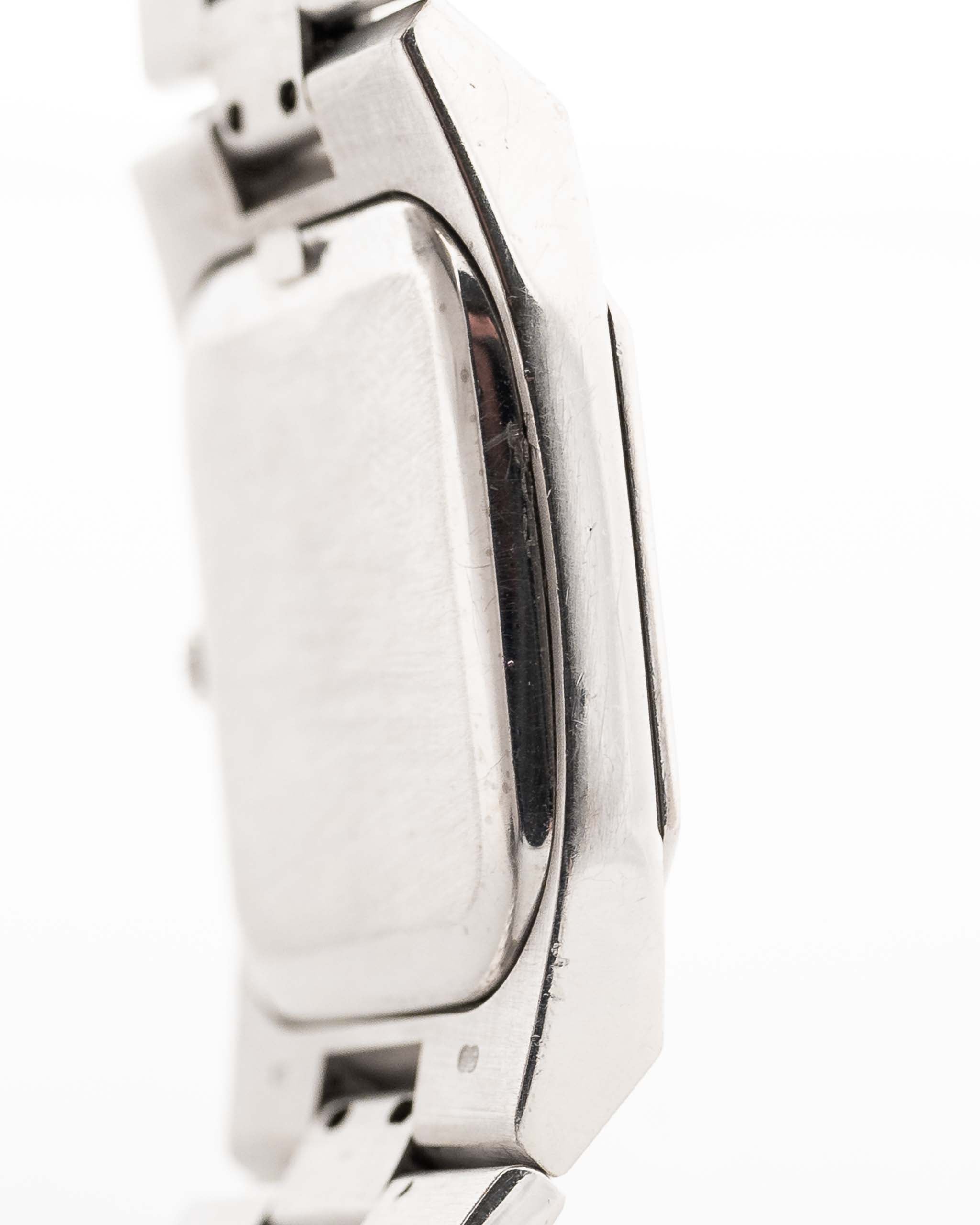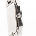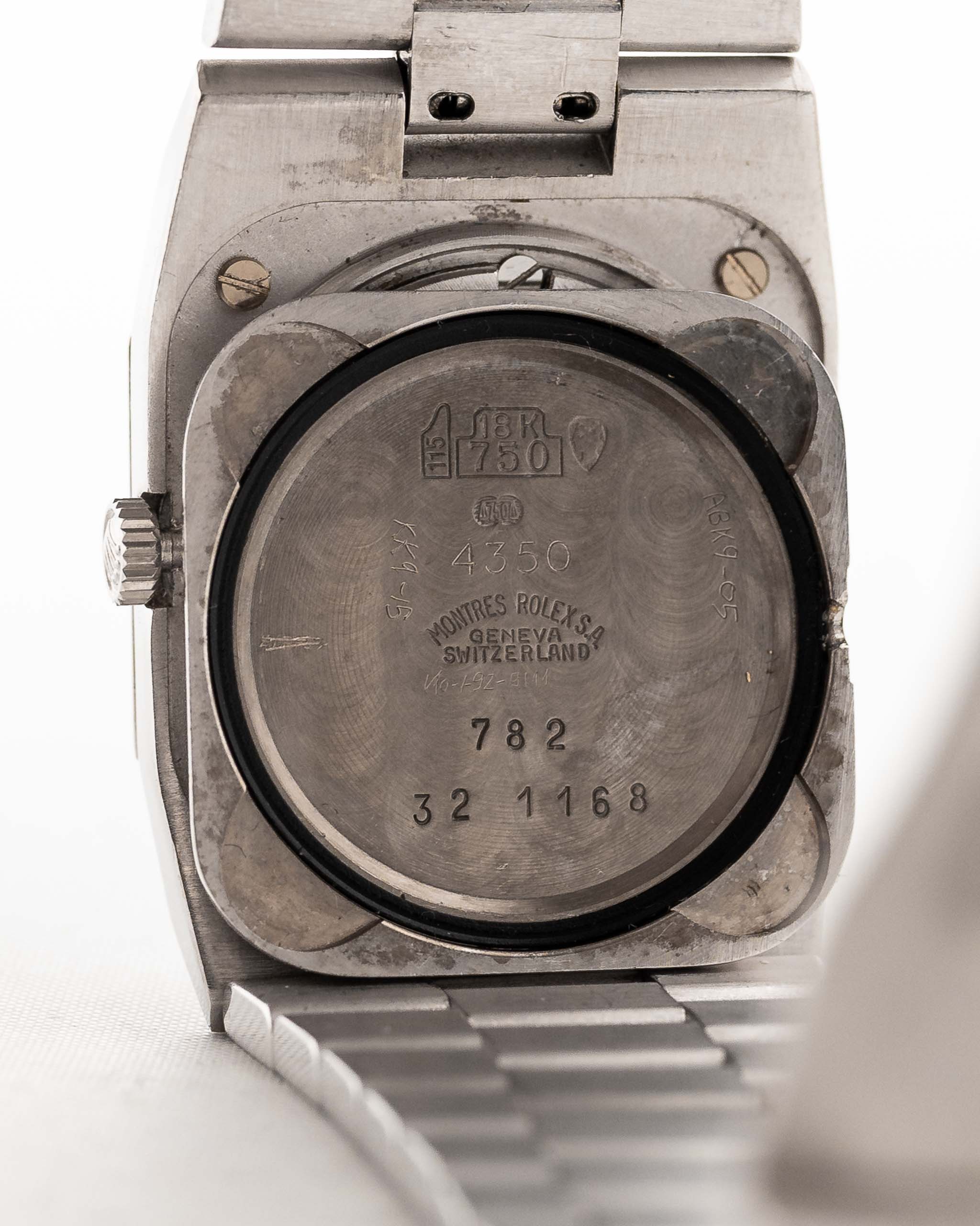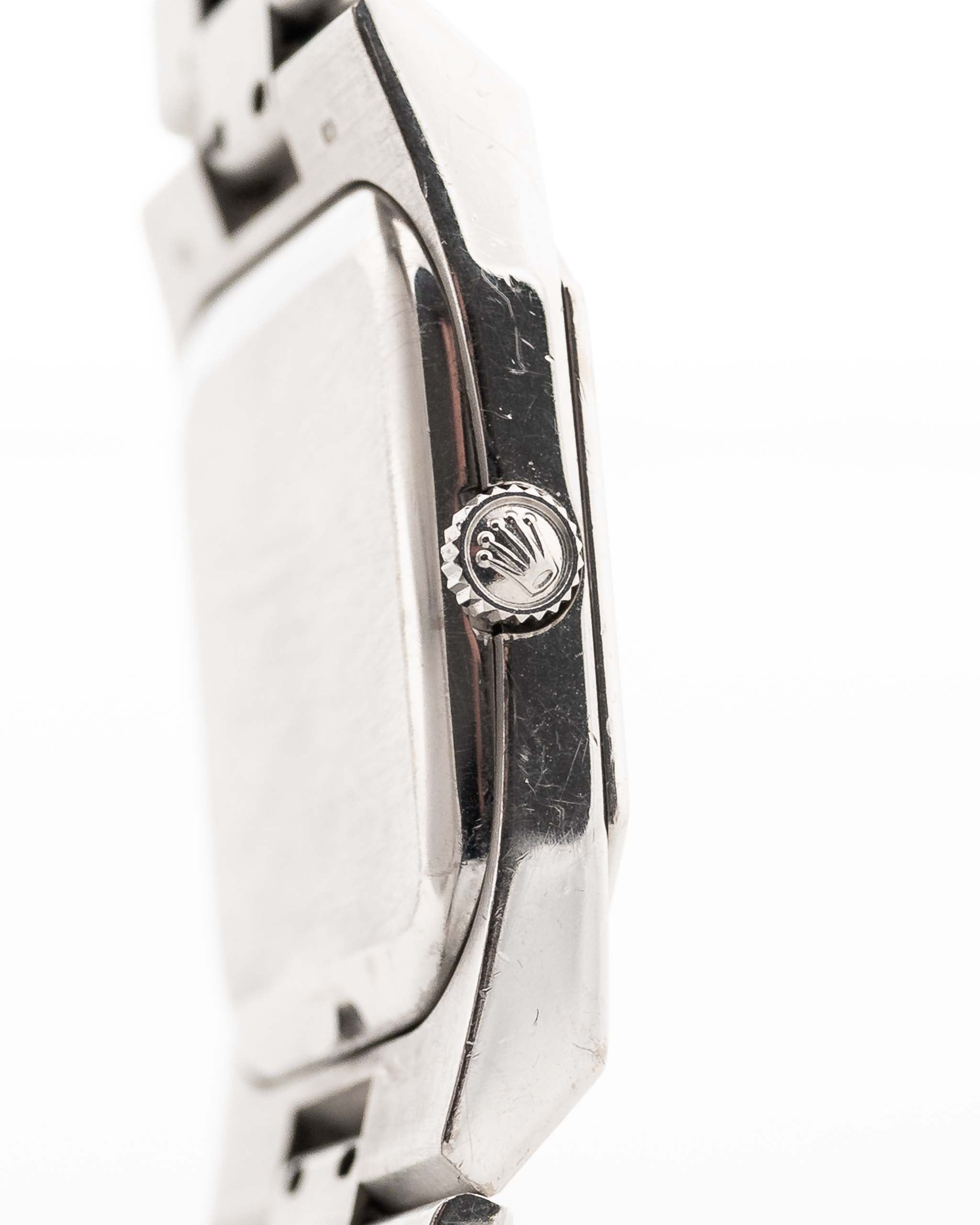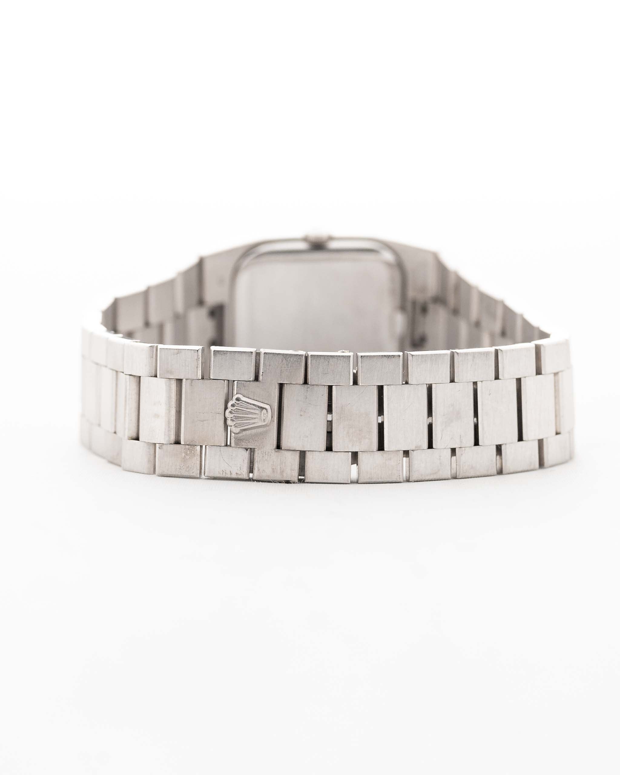 The Rolex Cellini line showcases the dressier side of Rolex compared to its more well-known sport models. Our Ref. 4350 is fitted in a very rare 18k-white-gold square-shaped case, which is an unusual case shape for Rolex and a perfectly fitting 18k President bracelet with 18k folding clasp with very minor stretch and in fabulous condition.