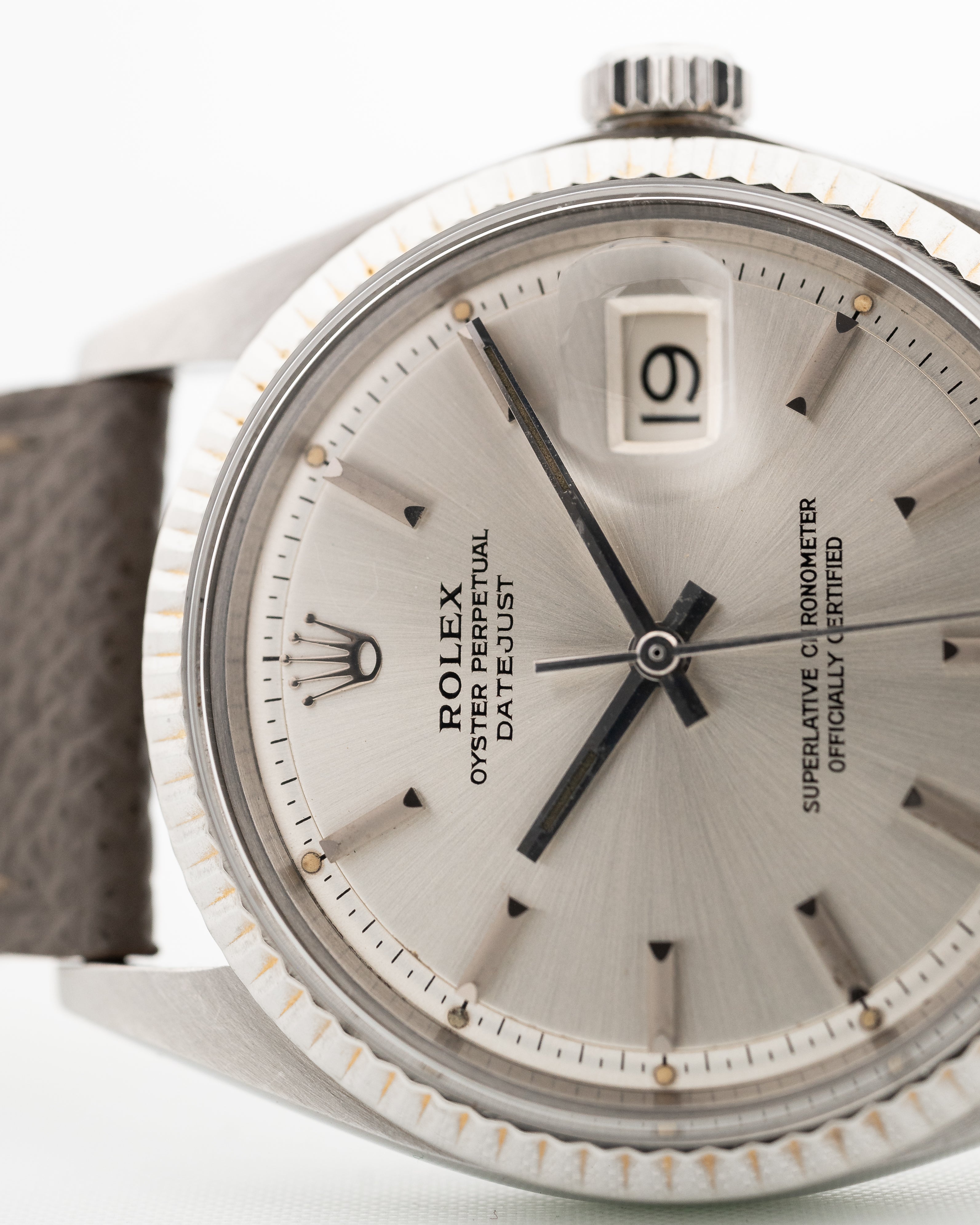 This particular piece from 1970 is notable for its 18k white gold fluted bezel, a flawless silver sunburst pie pan dial and a very strong case with sharp edges in outstanding condition.