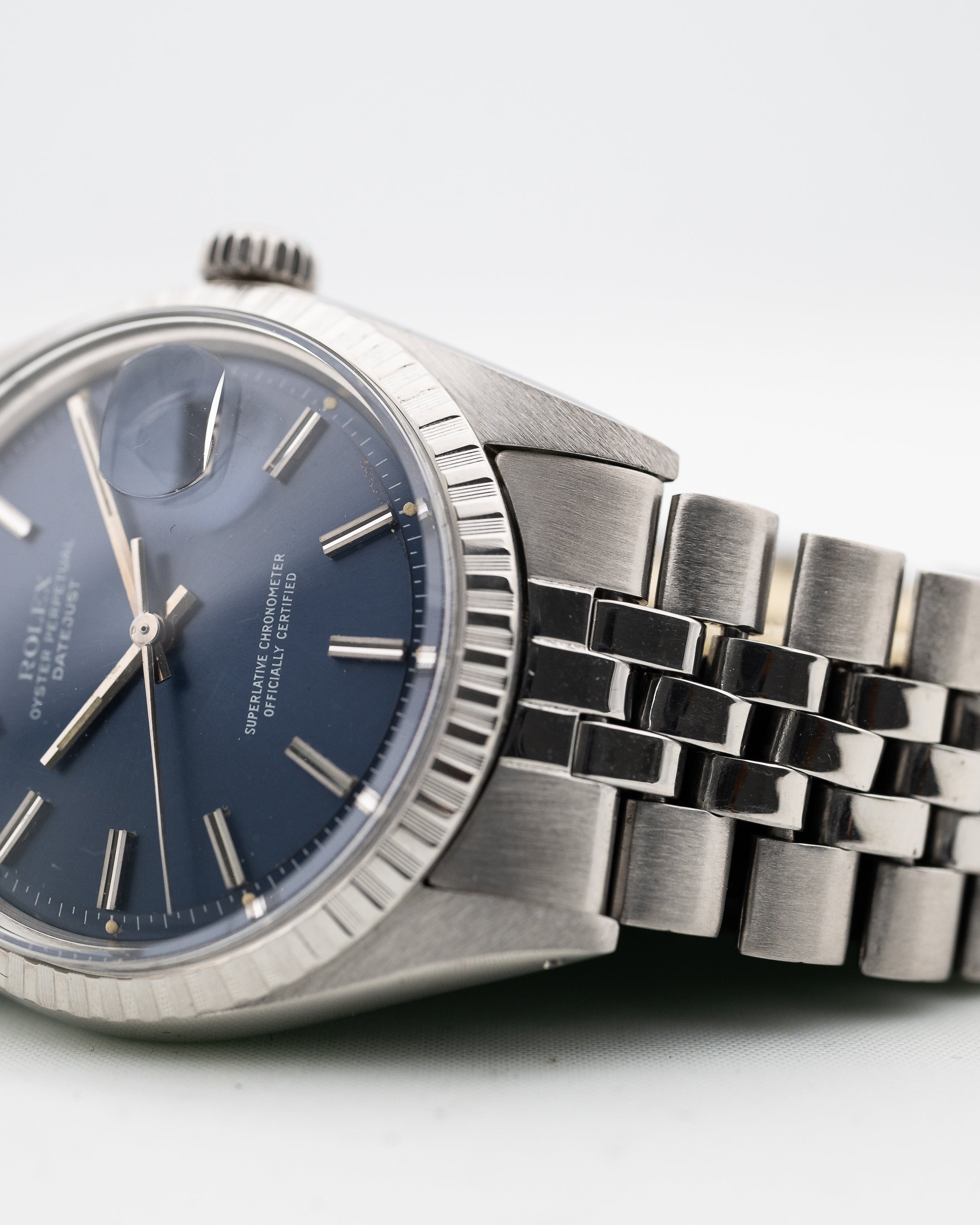 This particular piece from 1973 is notable for its engine turned bezel, a rare and flawless blue pie pan dial and a very strong case with sharp edges in outstanding condition.