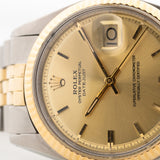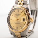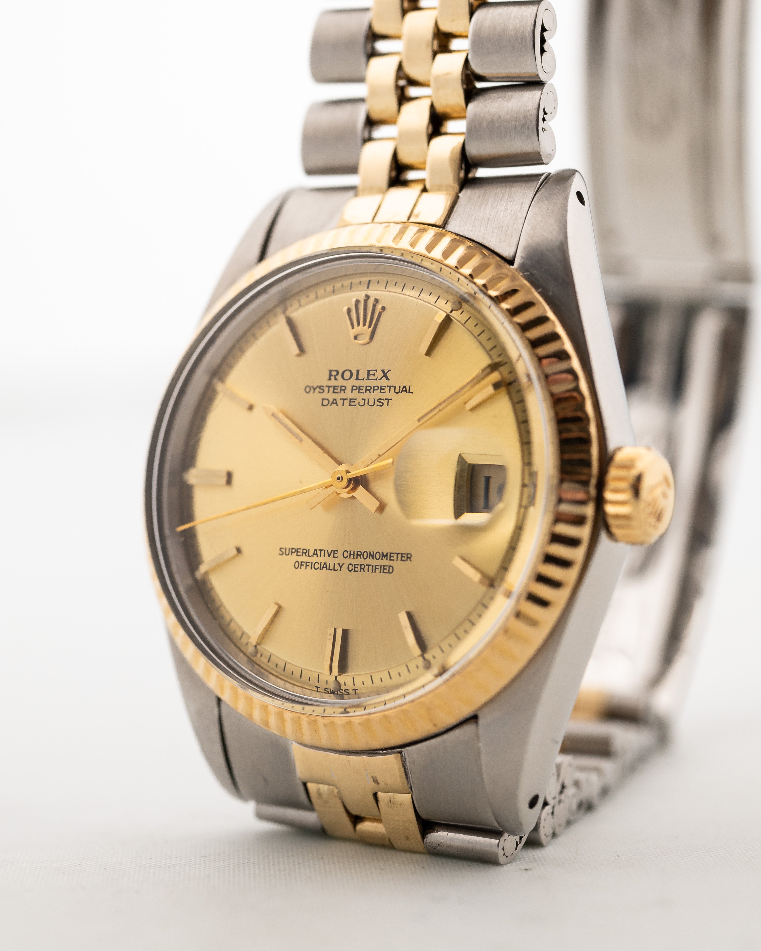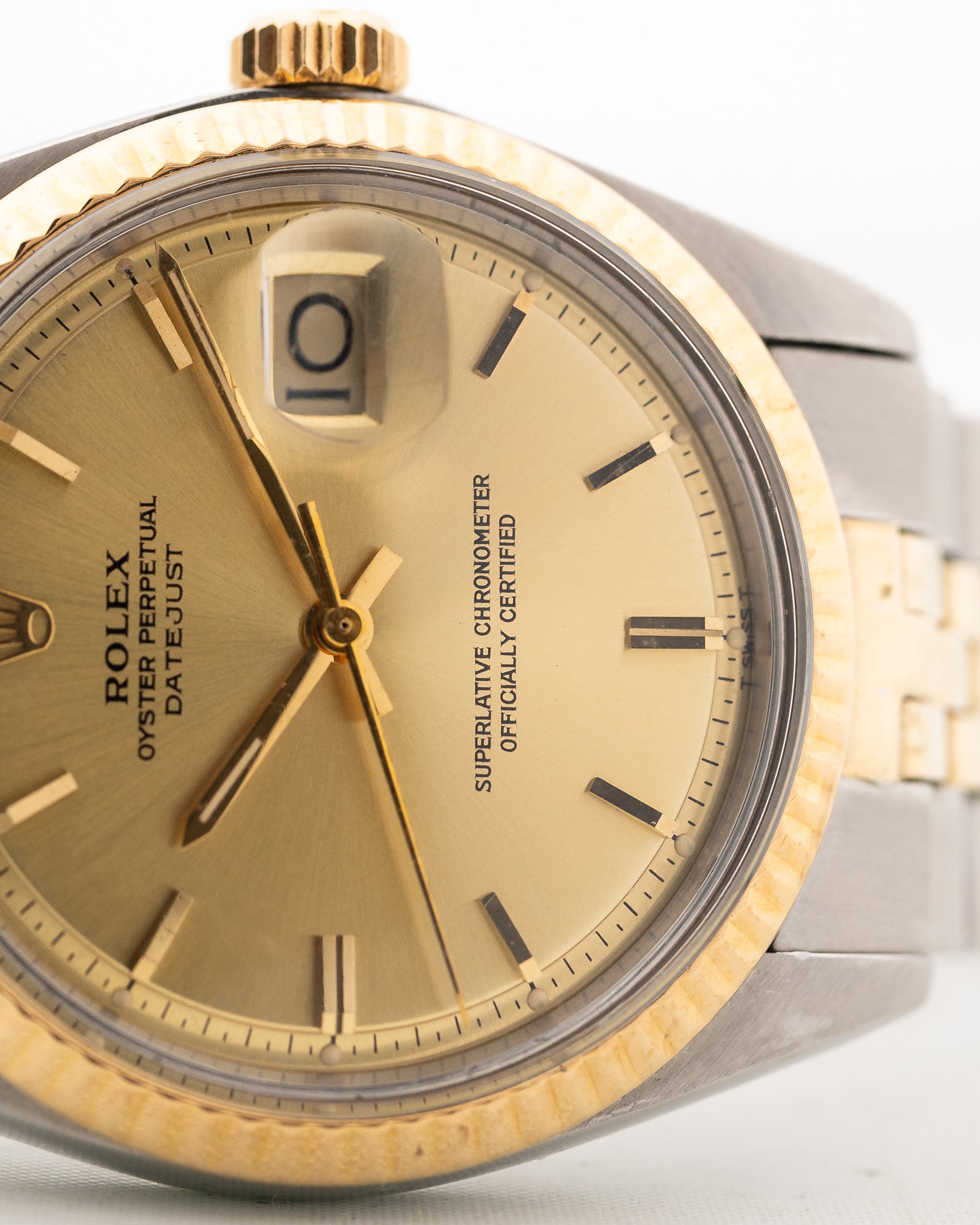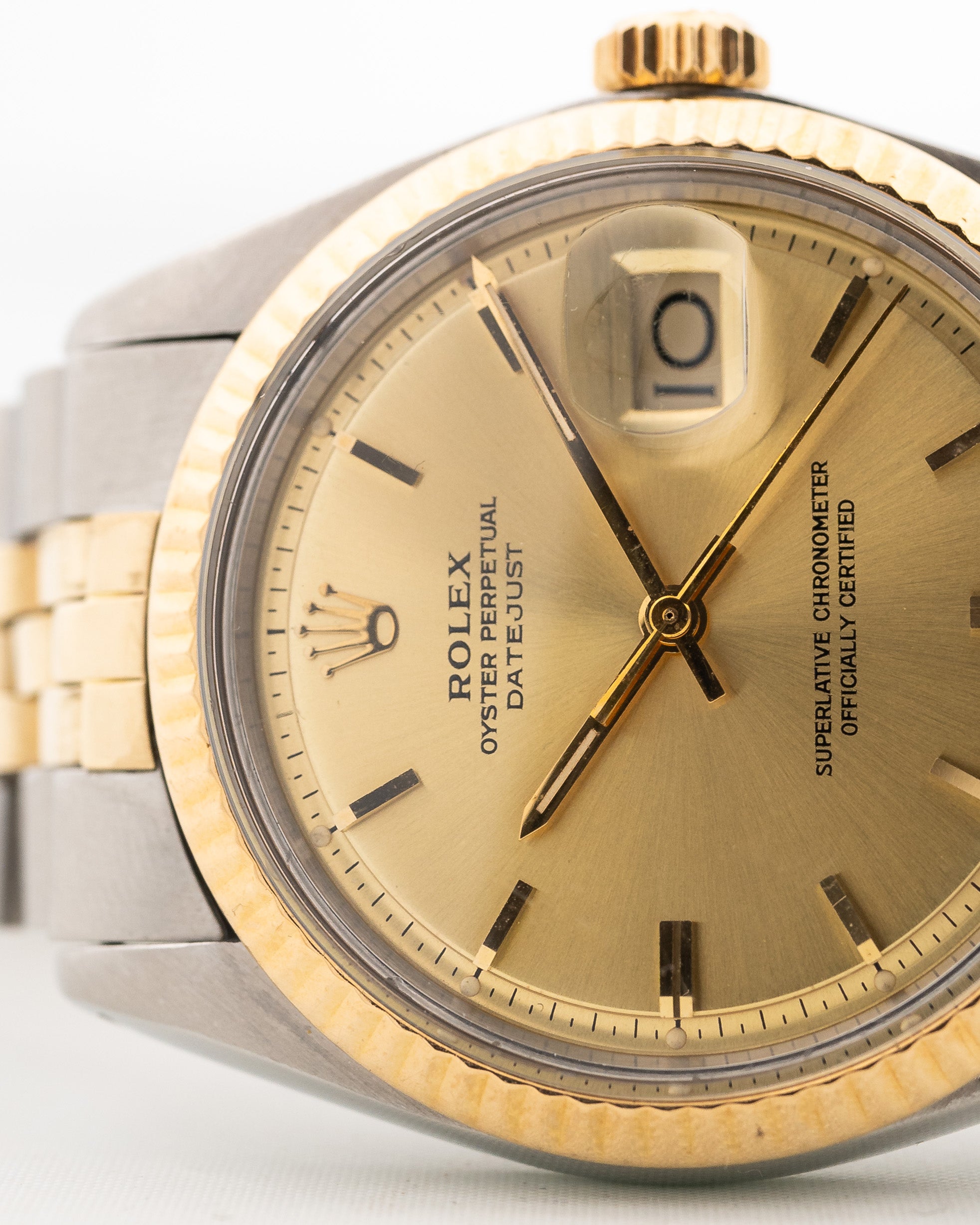 This particular piece from 1975 is notable for its yellow gold fluted bezel, a beautiful gold pie pan dial in flawless condition with perfect lume and a very strong case with sharp edges.