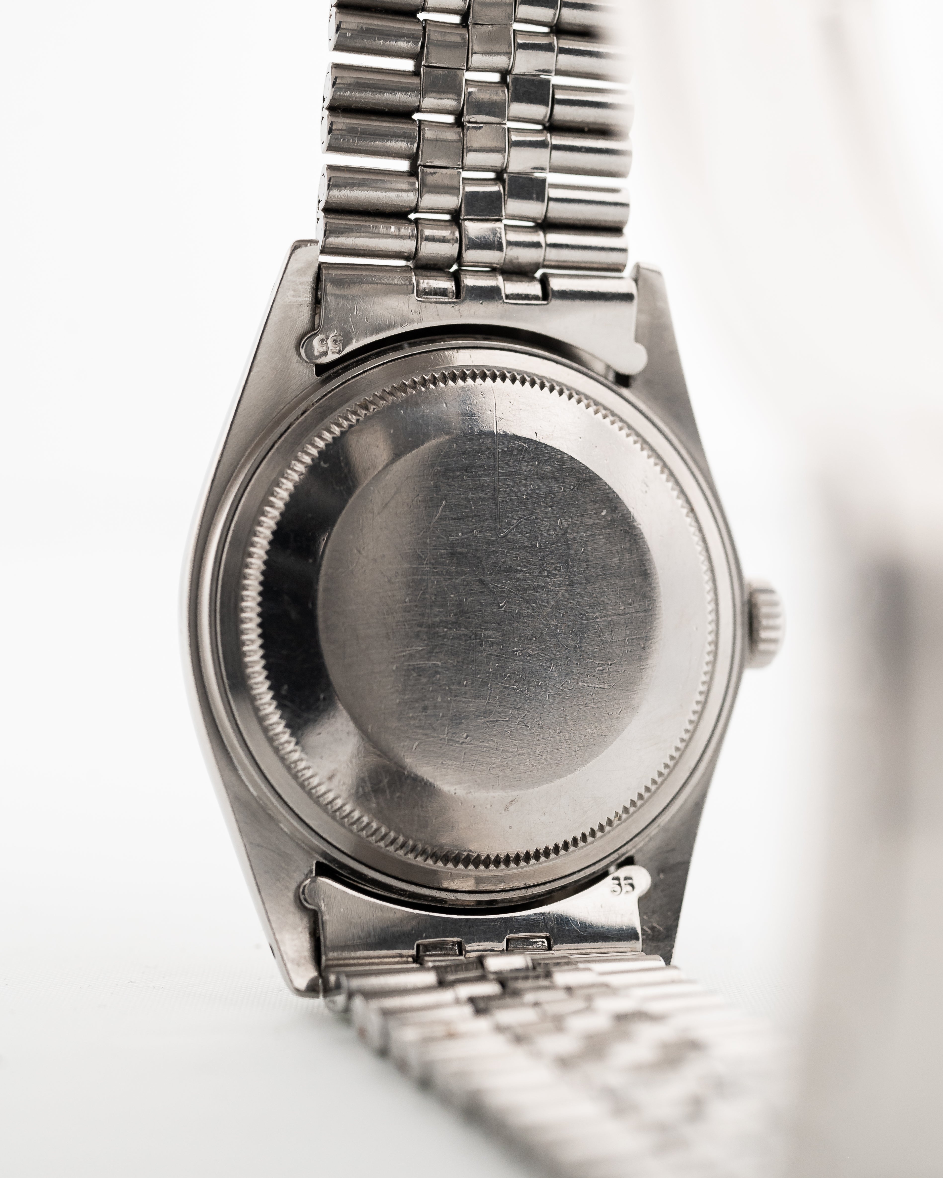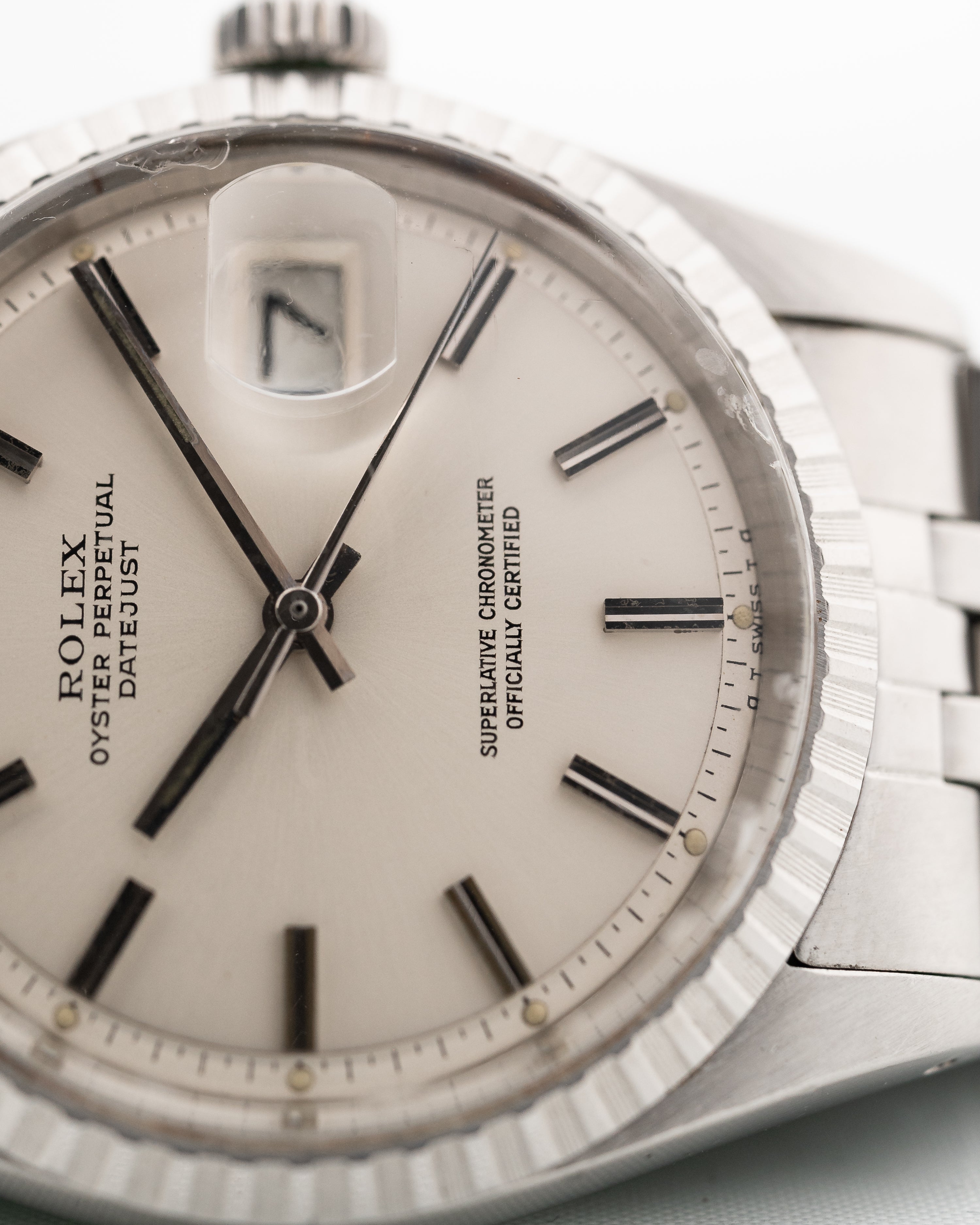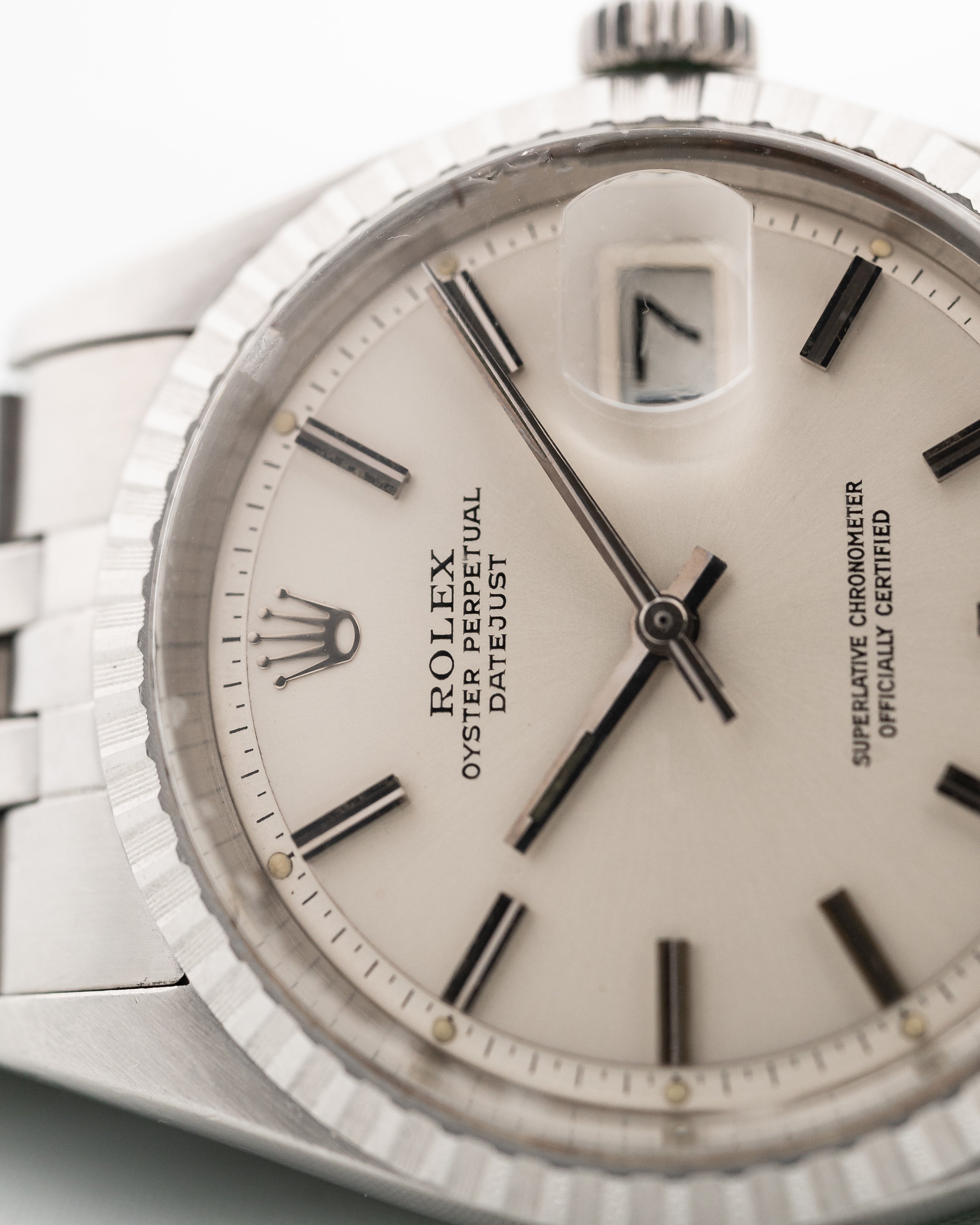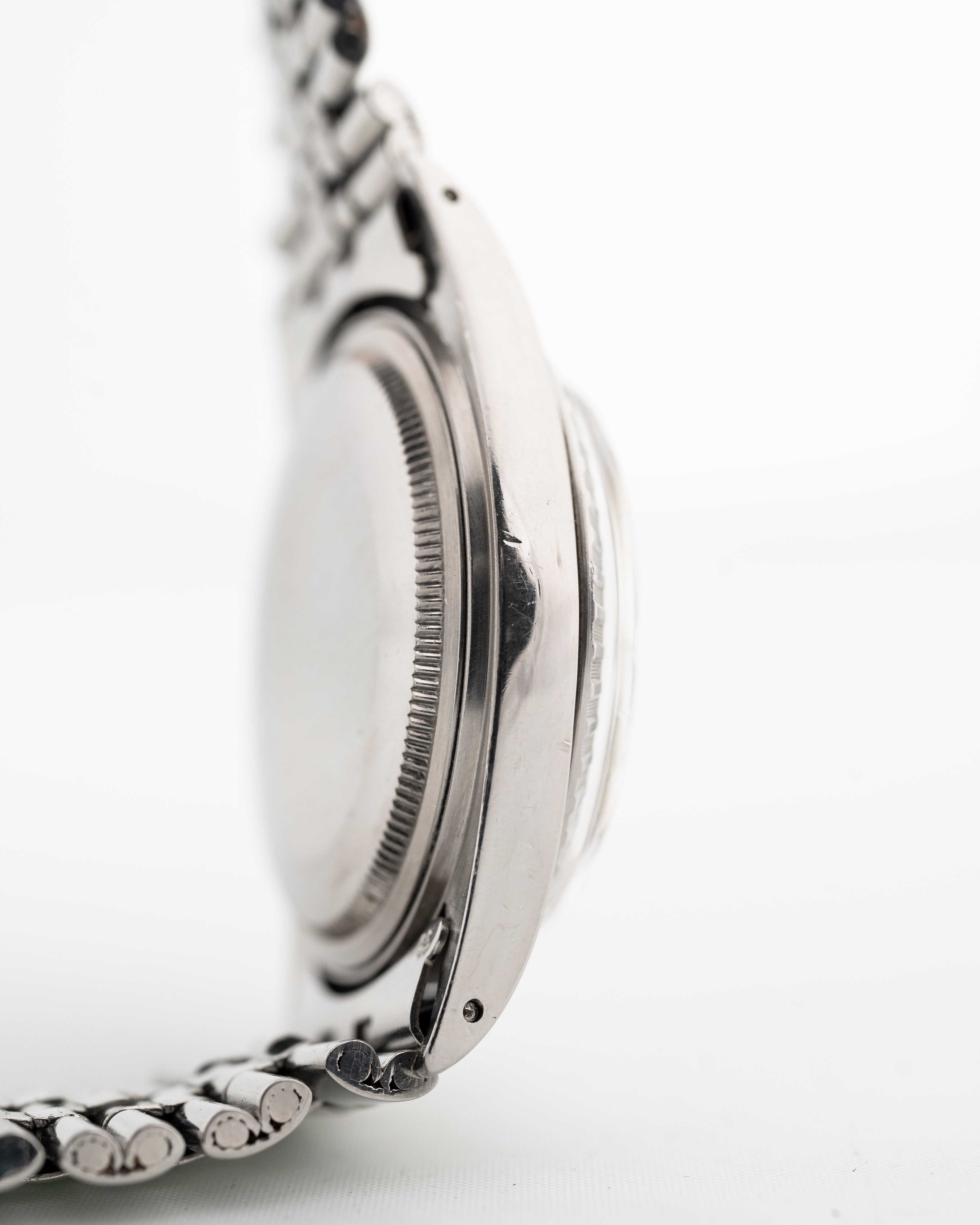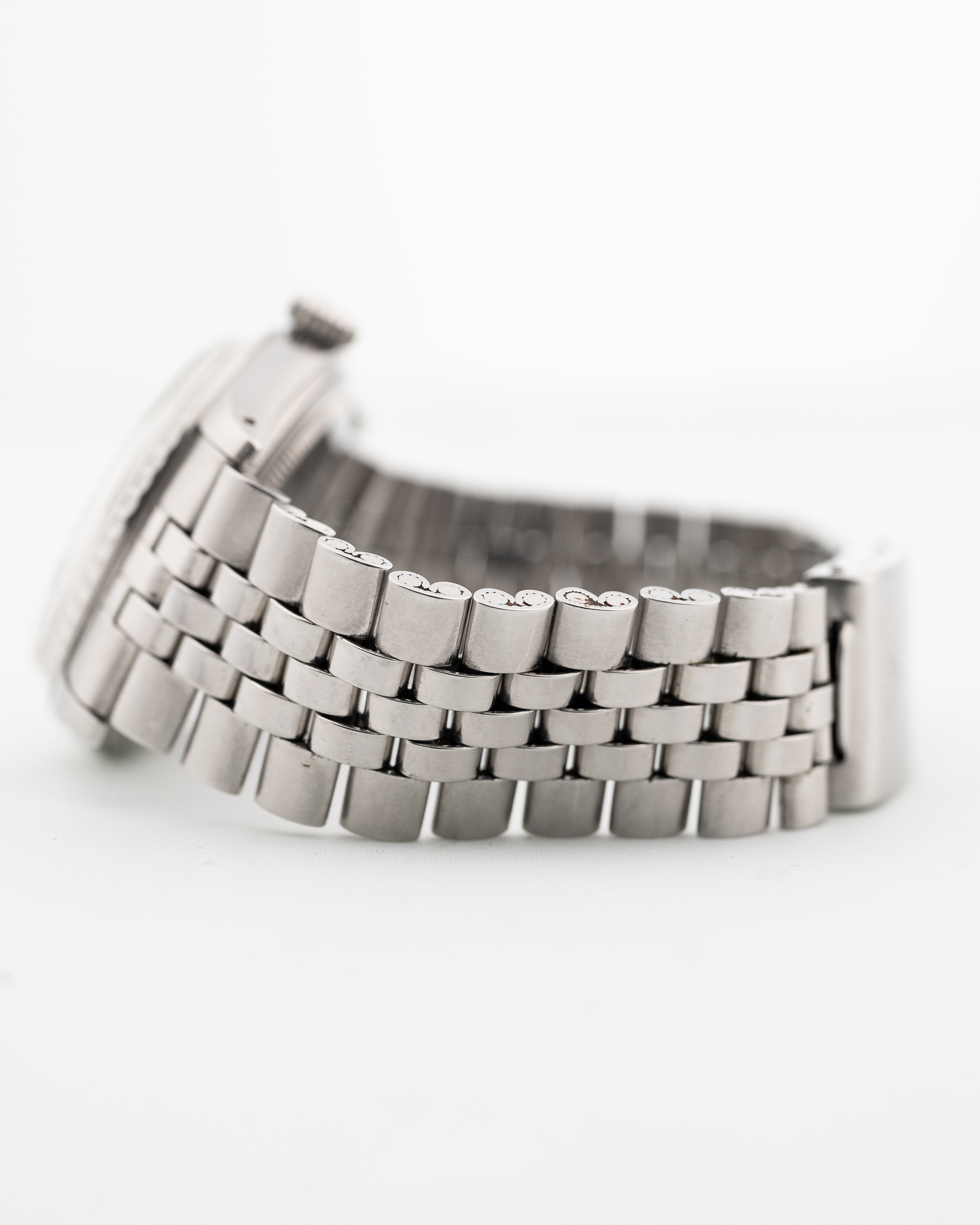 Our particular piece with the Reference 1603 from 1973 is notable for its engine turned bezel, a beautiful silver pie pan dial in flawless condition and a very strong case with sharp edges.